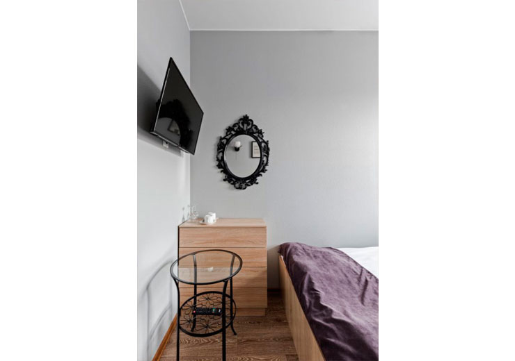 В номере: кровать двуспальная, прикроватная тумбочка, столик журнальный, стулья, шкаф, телевизор