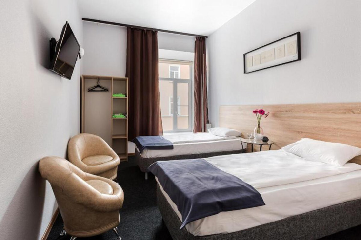 Самолетом до аэропорта Пулково, далее на автобусе №39, 39э до станции метро «Московская». Затем на метро до станции «Технологический институт», далее до «Площади Восстания». Пройти 880 м пешком до отеля.