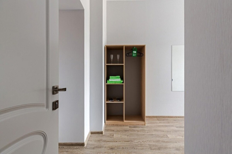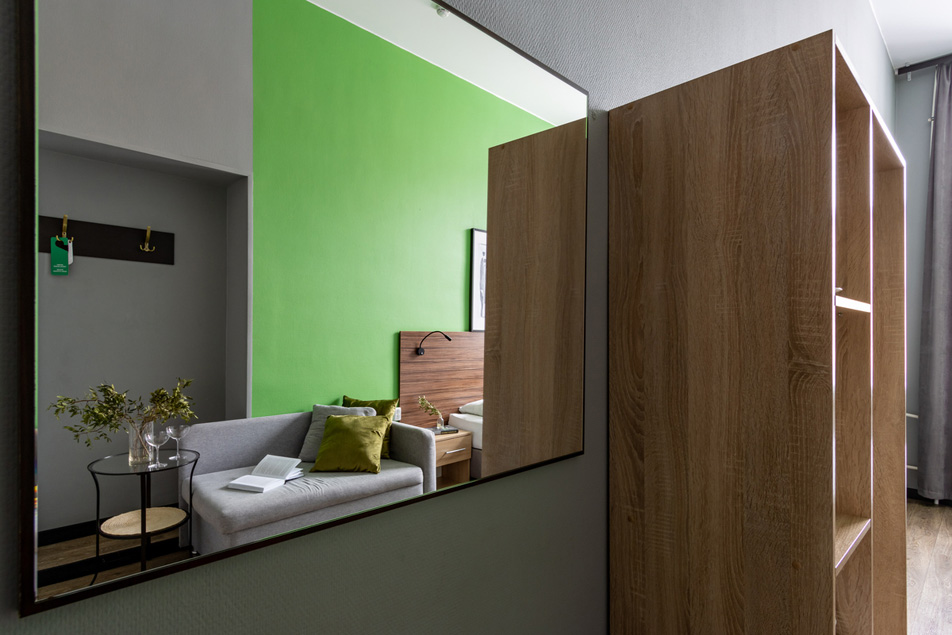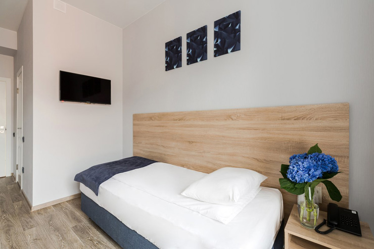 В номере: вешалка, зеркало, кровать односпальная, стол, стул, шкаф, телевизор