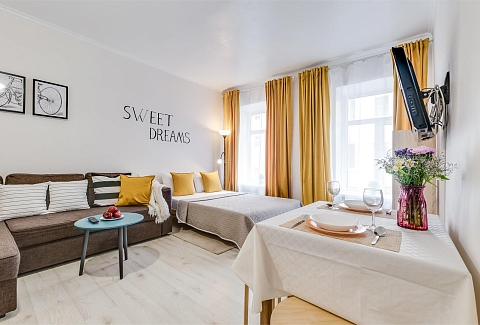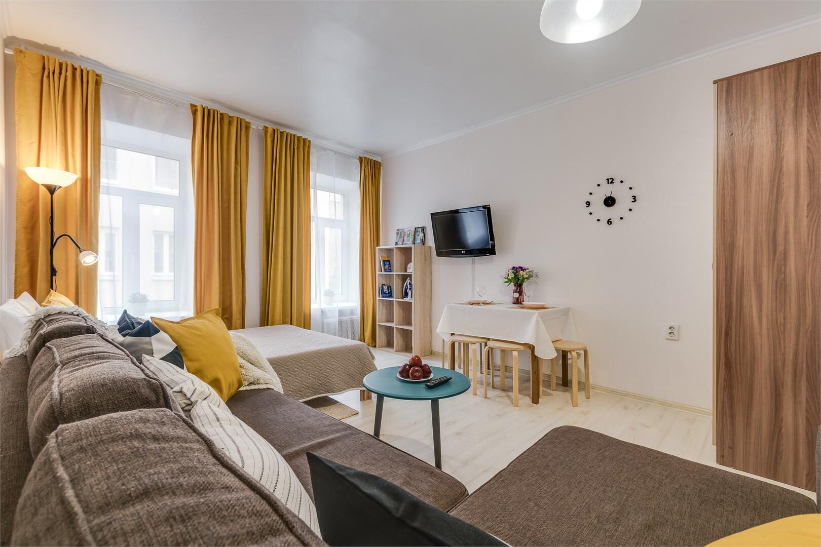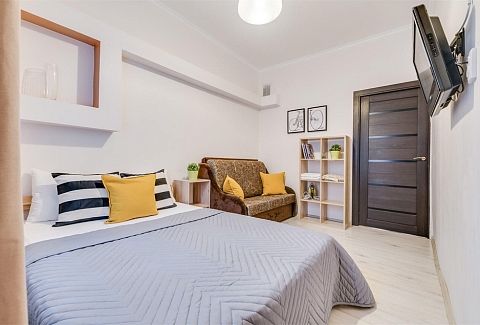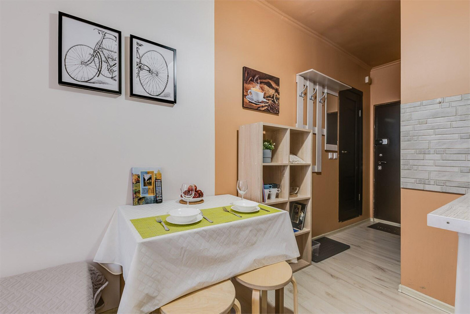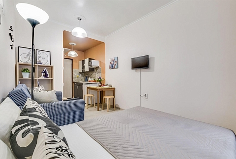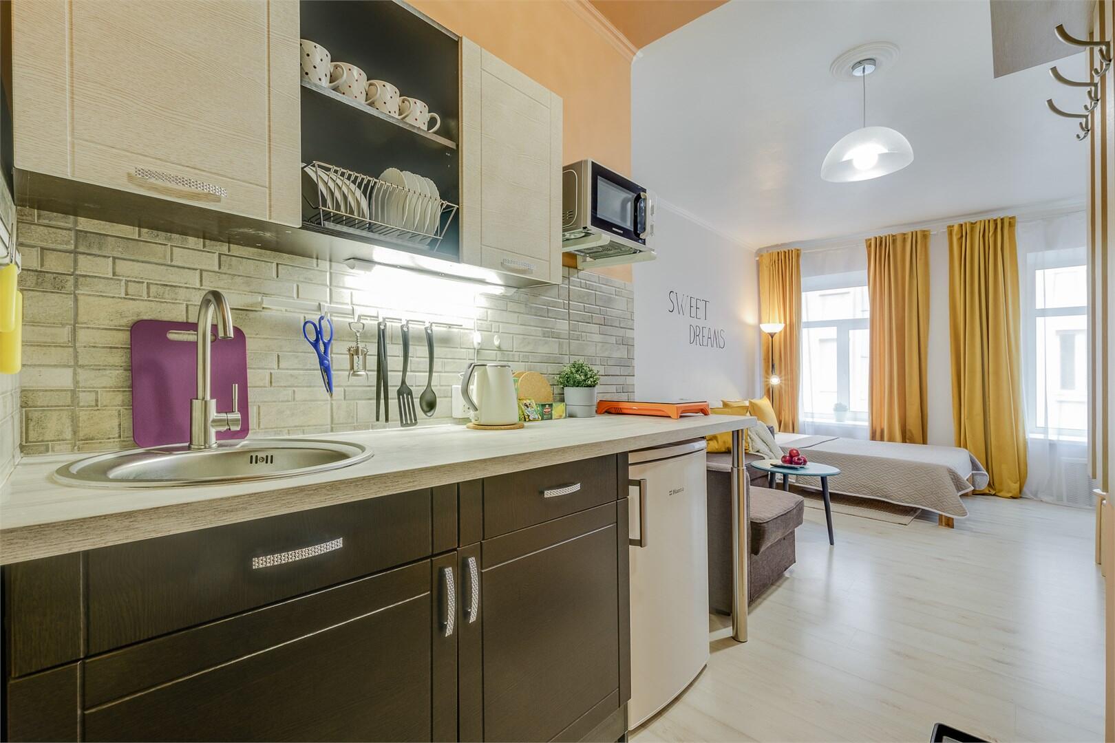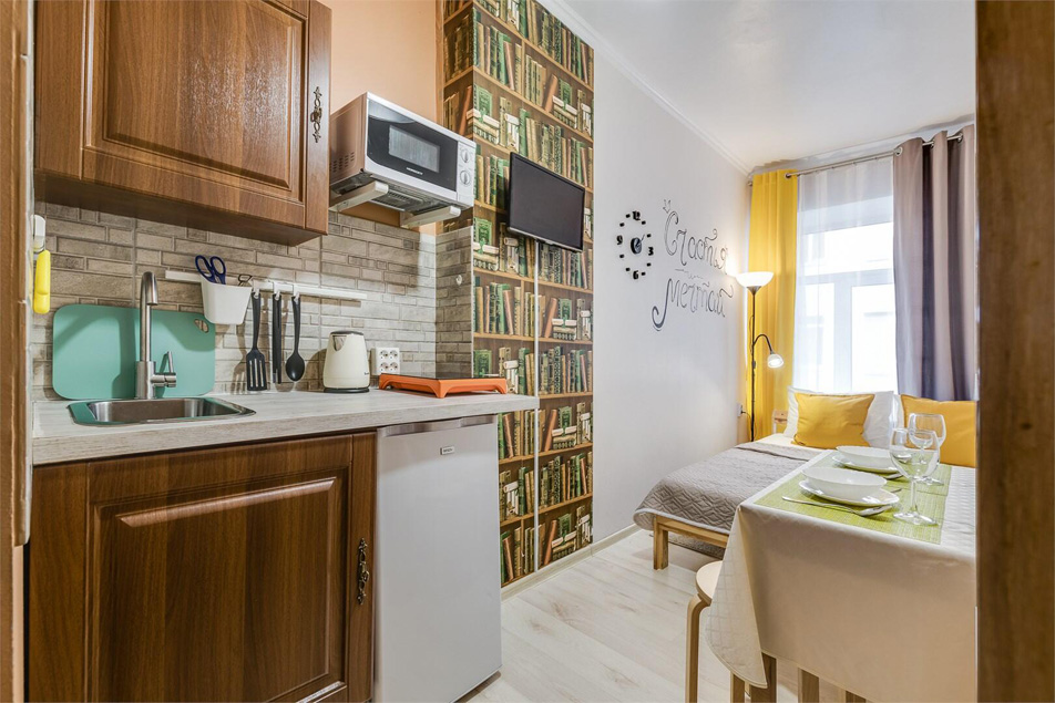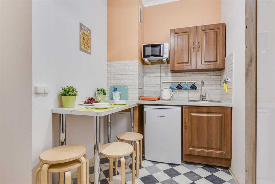 На плоском экране телевизора можно найти фильм для вечернего отдыха.С утра на собственной, полностью оборудованной кухне легко приготовить завтрак: в распоряжении гостей и микроволновая печь, и холодильник, и электрический чайник. За столом в обеденной зоне приятно планировать предстоящий день. А если возникнет желание попробовать местный колорит, прямо по соседству, в этих же дворах, ждут ароматная свежая выпечка из булочной «Пышландия» и теплая атмосфера бара «Север-плюс».