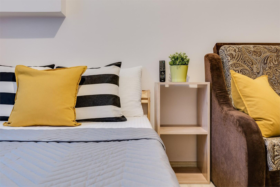 В номере: диван раскладной, кровать двуспальная, стол, стулья, шкаф, микроволновая печь, мини-холодильник, набор посуды, плита электрическая, телевизор, электрочайник