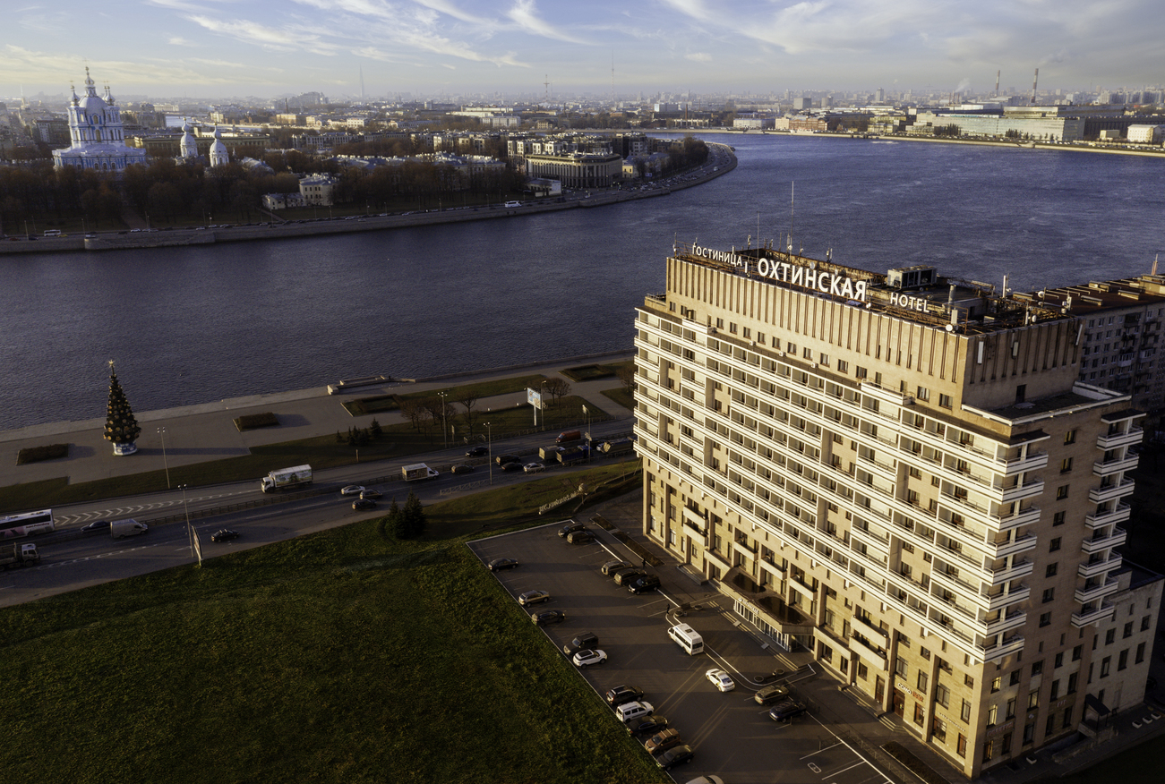 Отель «Охтинская» расположен в историческом районе Большая Охта на набережной реки Невы. Рядом находятся Смольный собор и речной причал, откуда отправляют прогулочные катера, до центра города и главных культурных достопримечательностей можно доехать за 20 минут. Рядом с отелем разместились остановки общественного транспорта, крупный торговый центр Охта Молл, Полюстровский парк для прогулок, бары, кафе, а всего за 5—7 минут можно доехать до Ладожского вокзала.