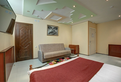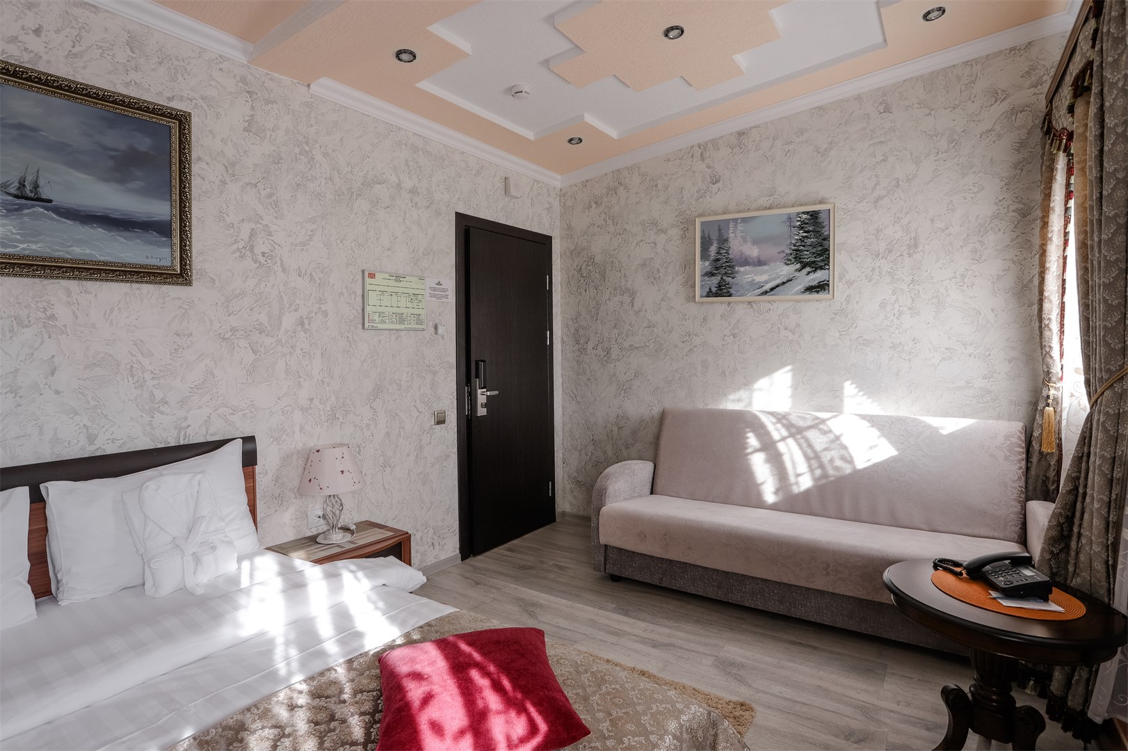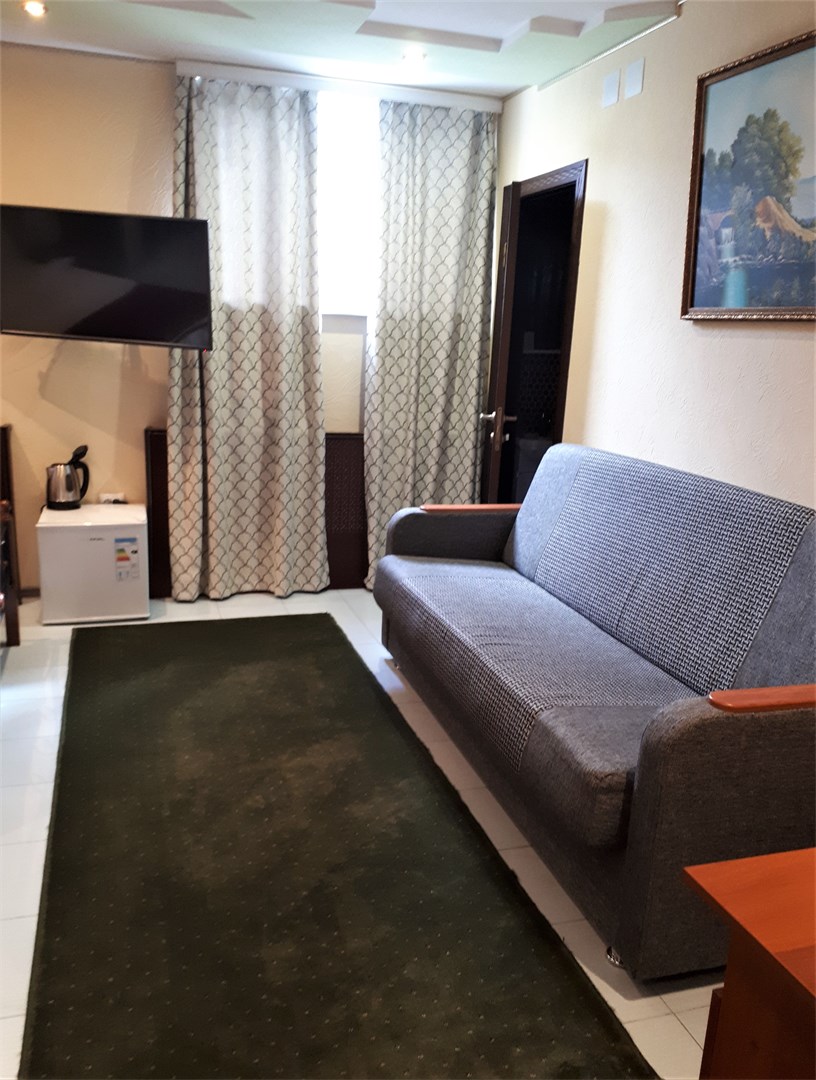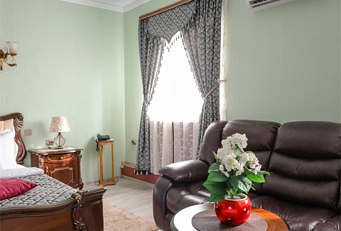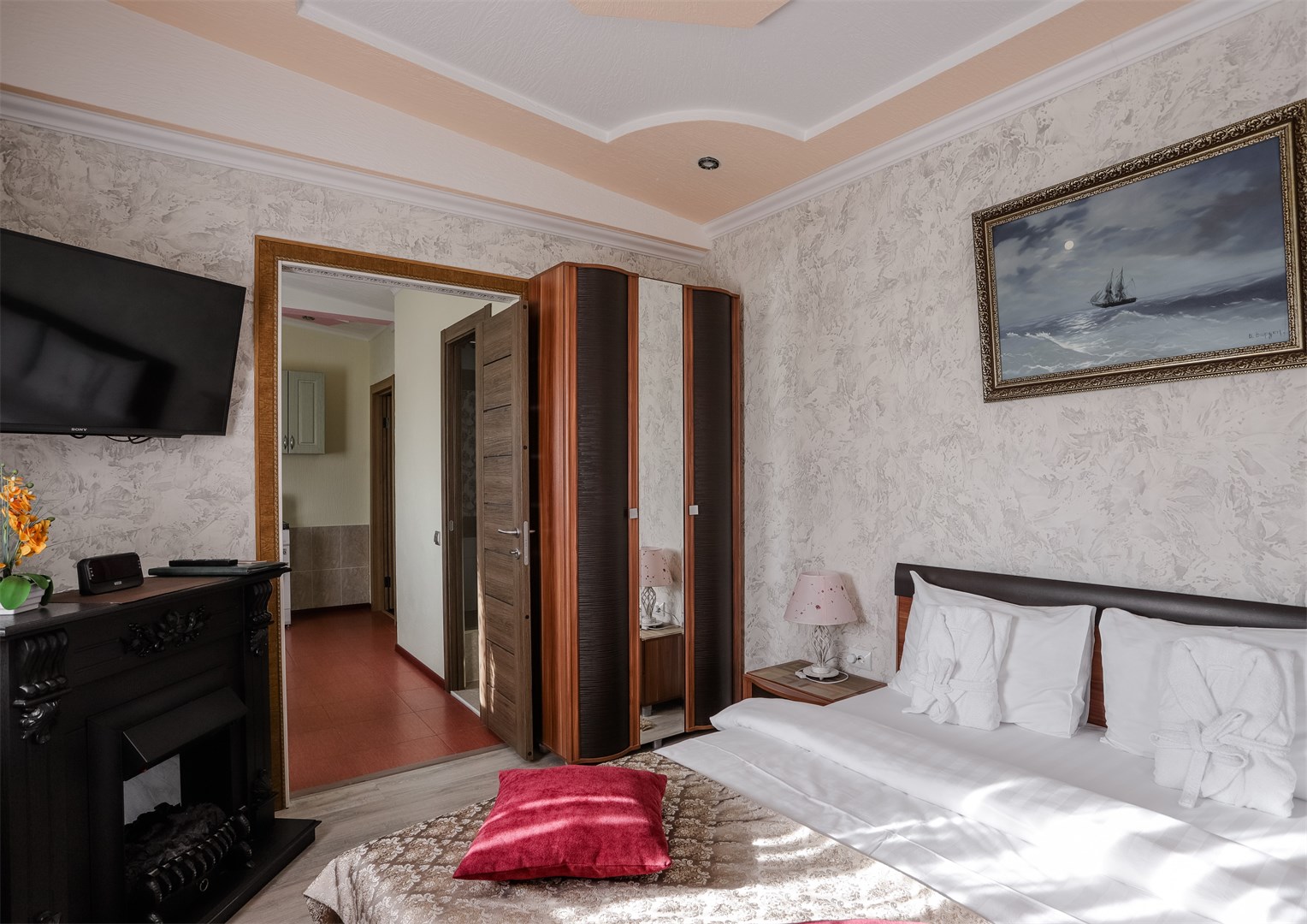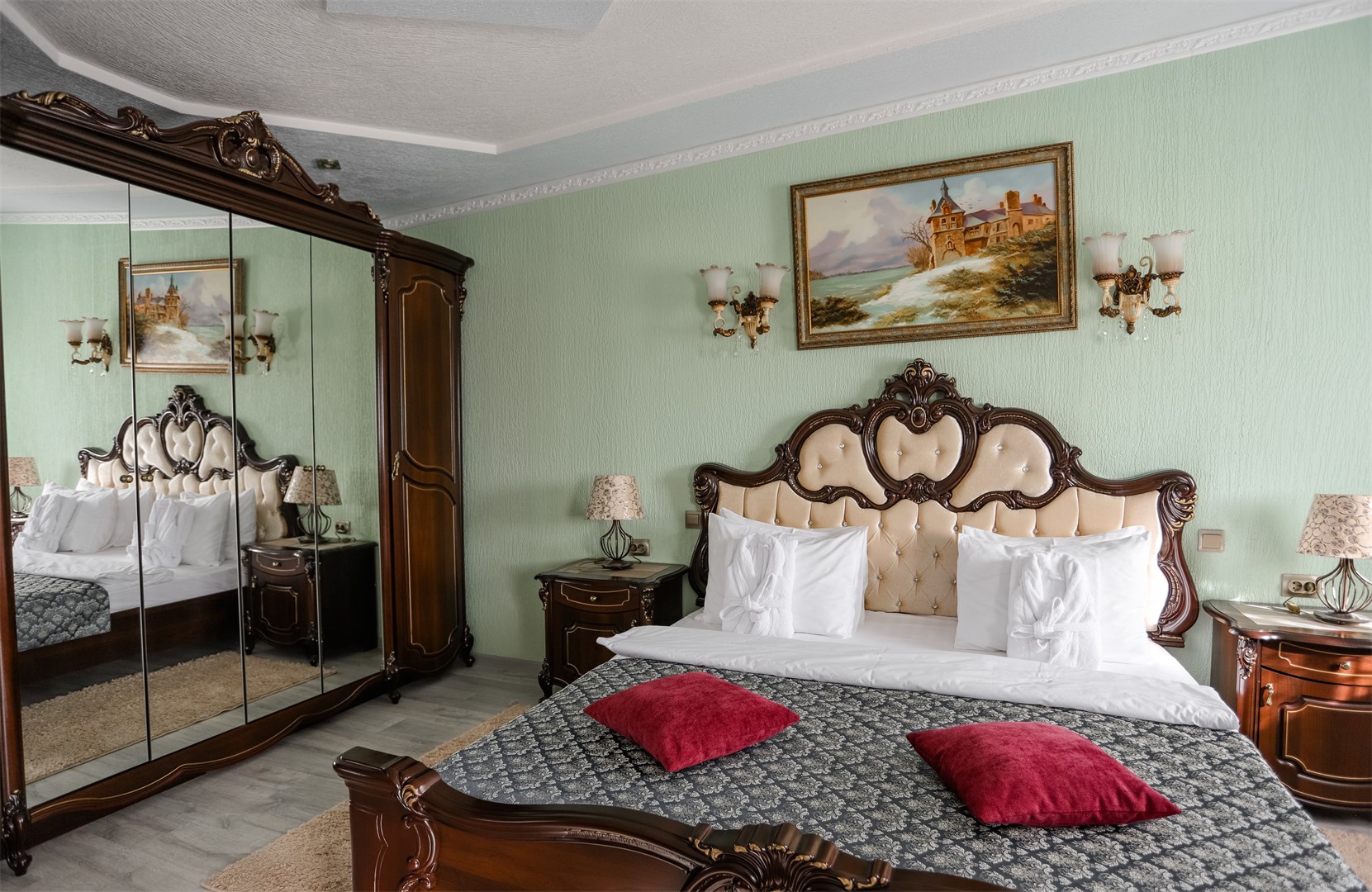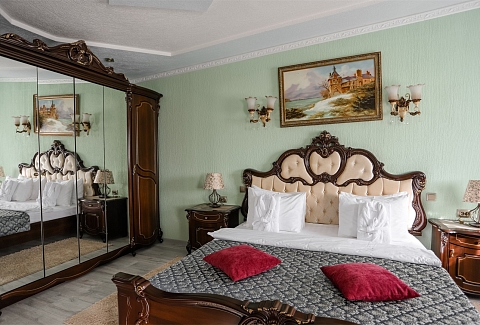 В номере: диван, зеркало, кровать двуспальная, кровать односпальная, прикроватные тумбочки, стол, стулья, шкаф, мини-холодильник, телевизор, телефон