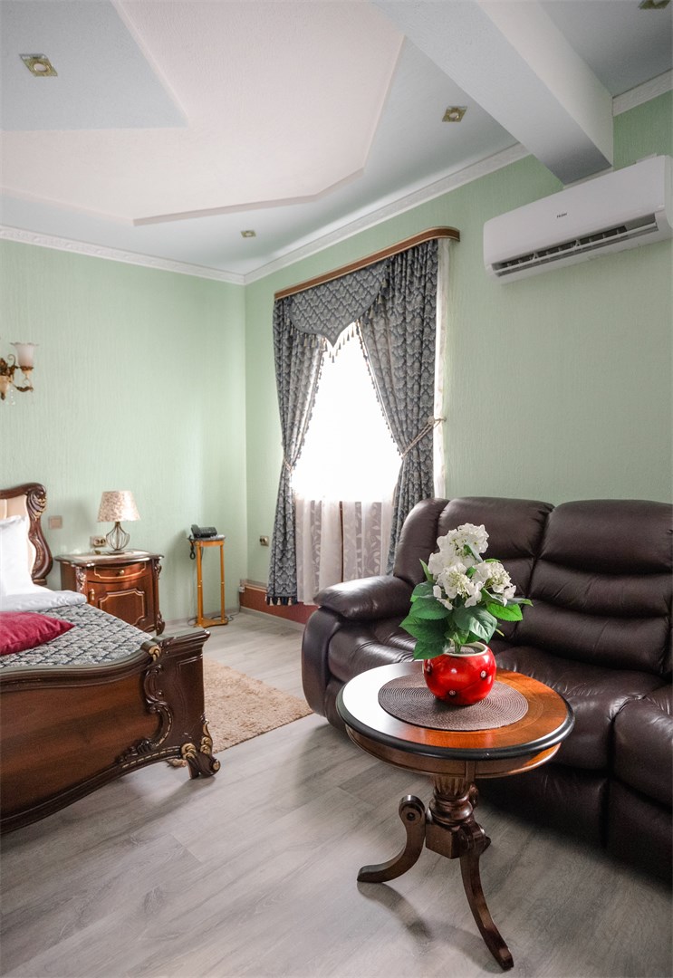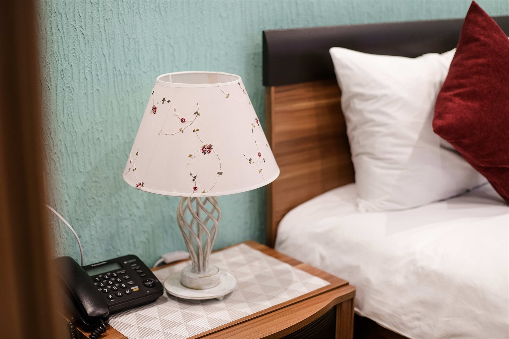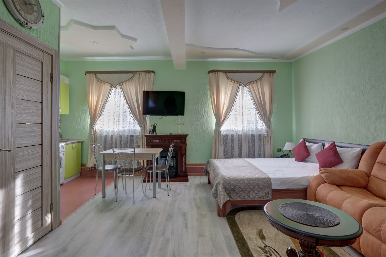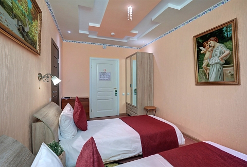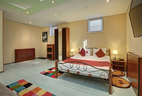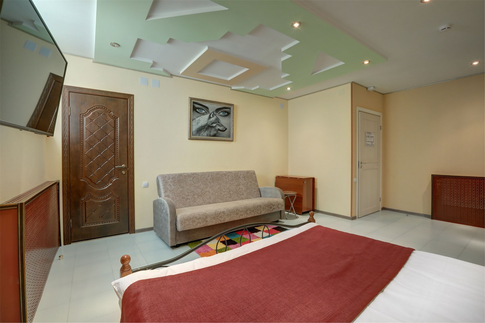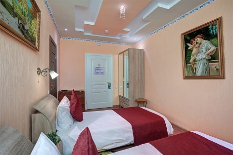 В номере: диван, зеркало, кровать двуспальная, кровать односпальная, прикроватные тумбочки, стол, стулья, шкаф, мини-холодильник, телевизор, телефон