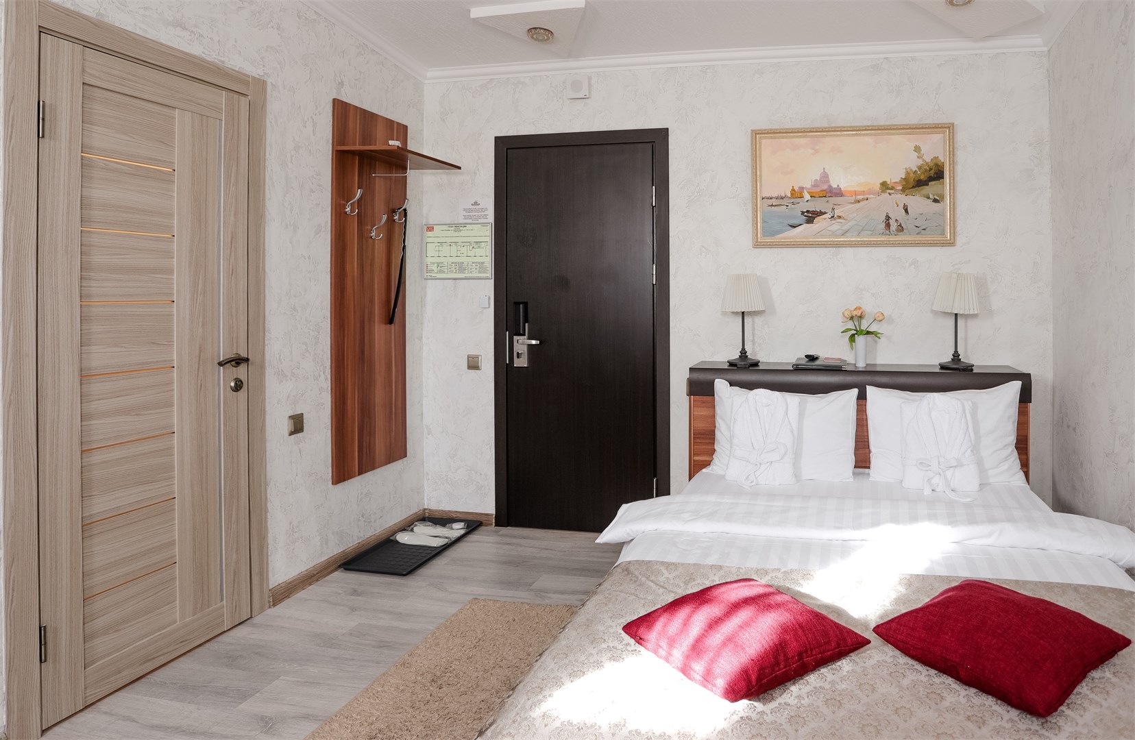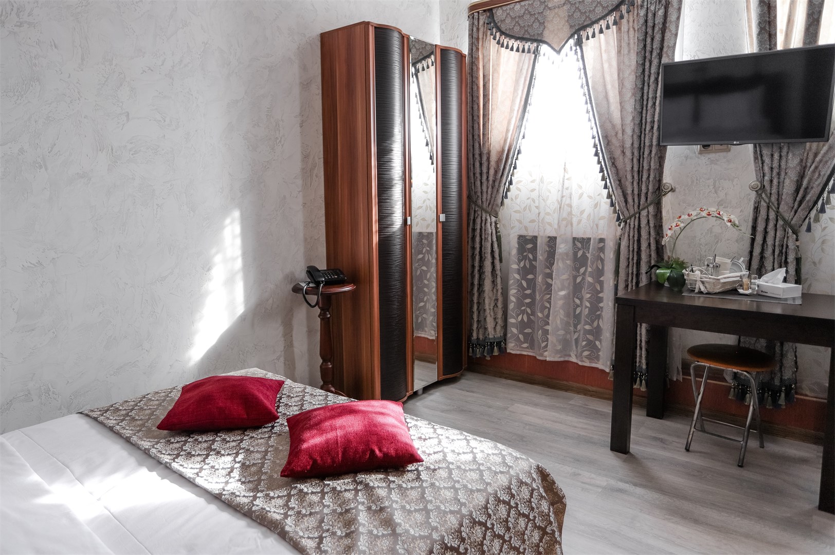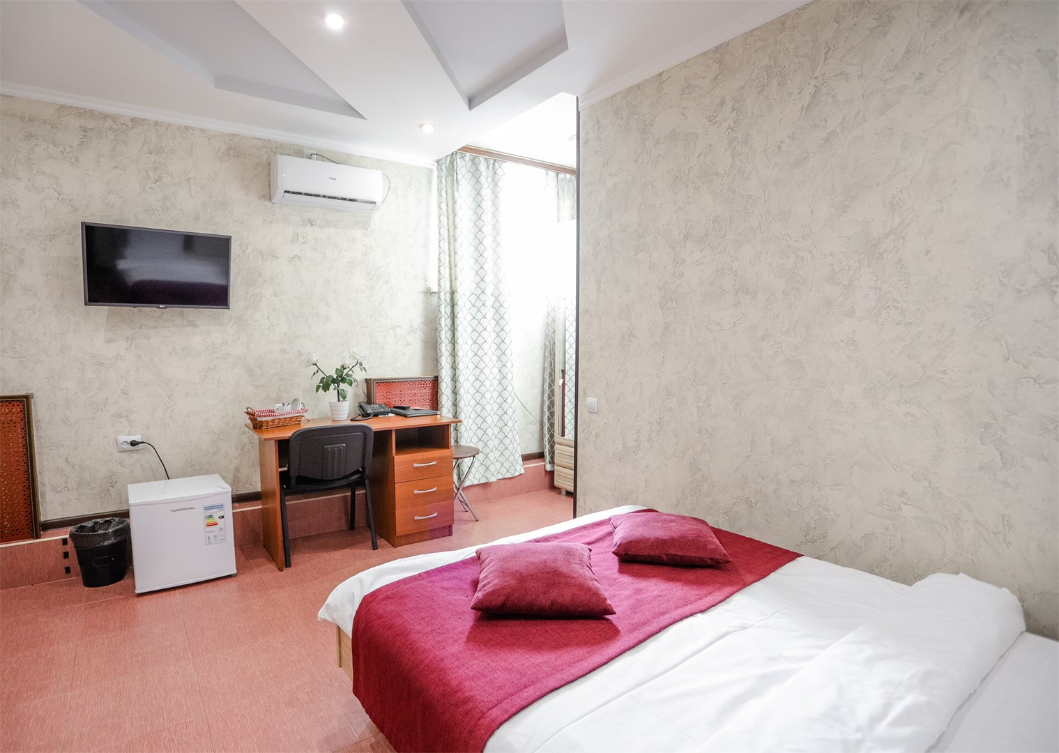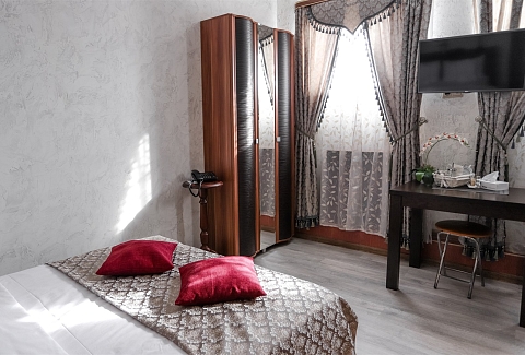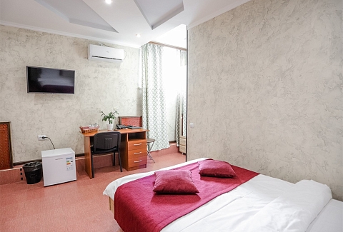 В номере: вешалка, зеркало, кровать двуспальная, прикроватные тумбочки, стол, стул, шкаф, мини-холодильник, телевизор, телефон
