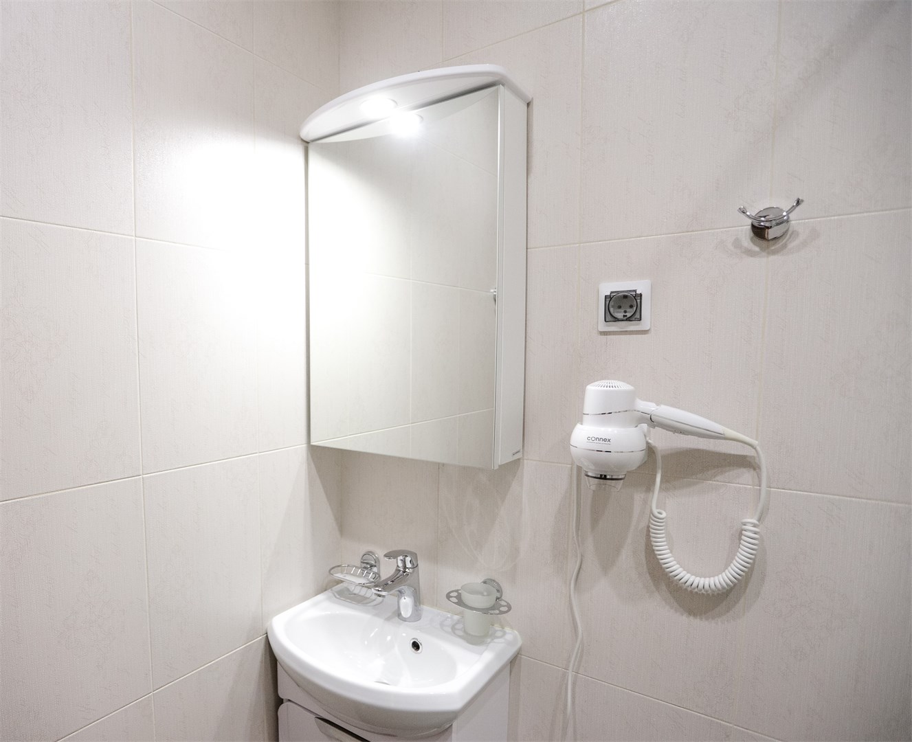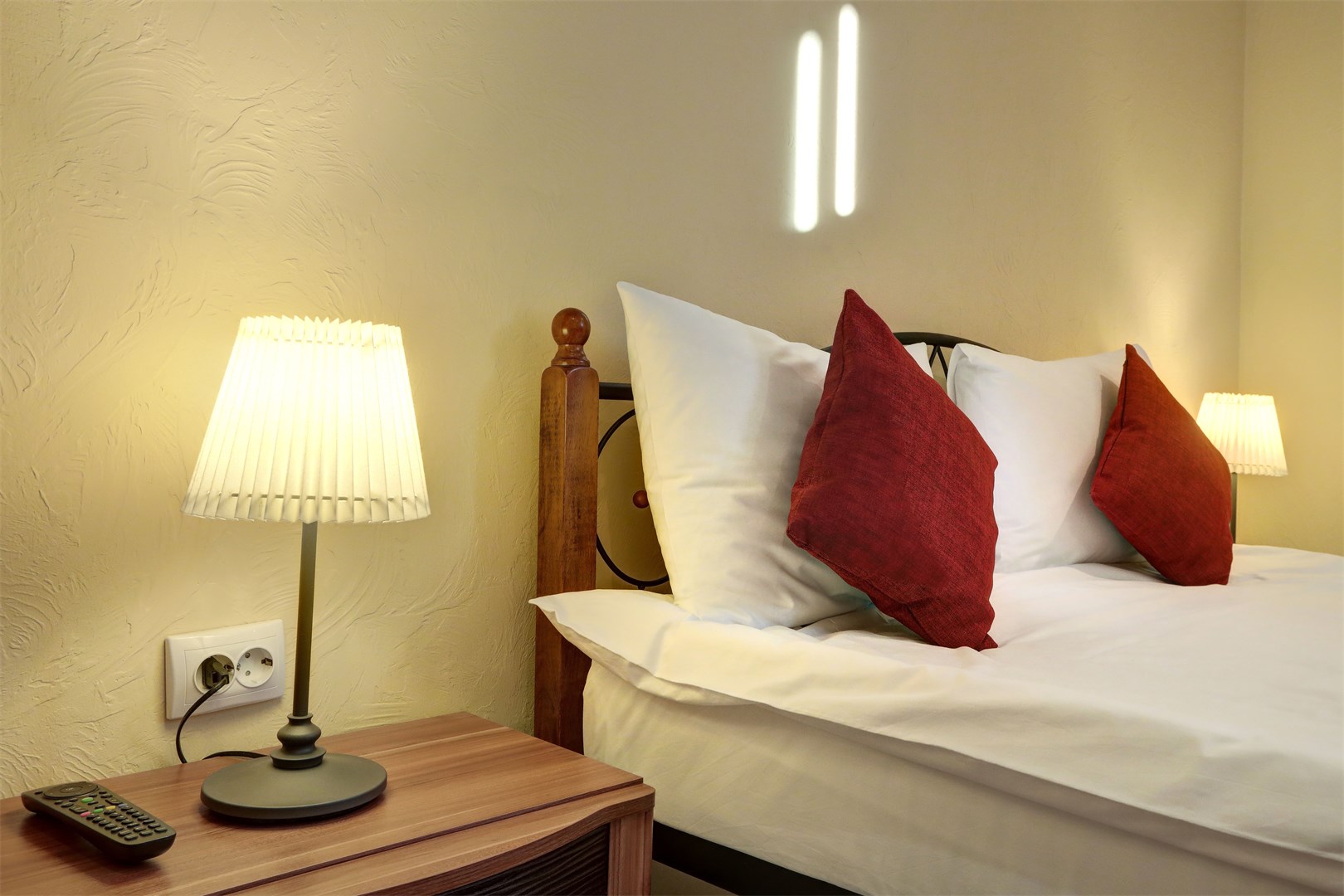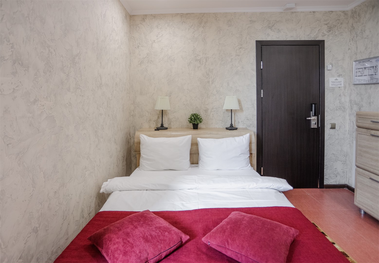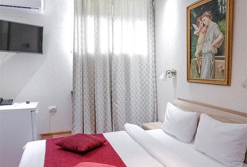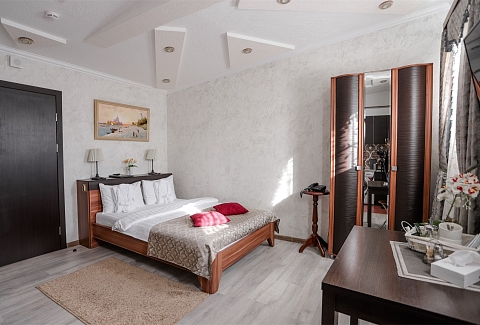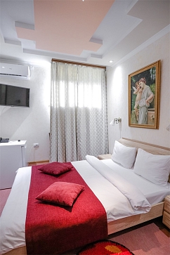 В номере: вешалка, зеркало, кровать двуспальная, прикроватные тумбочки, стол, стул, шкаф, мини-холодильник, телевизор, телефон