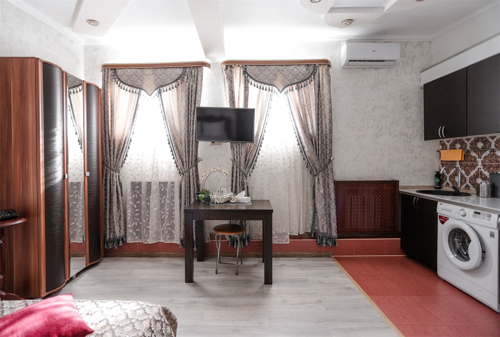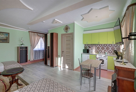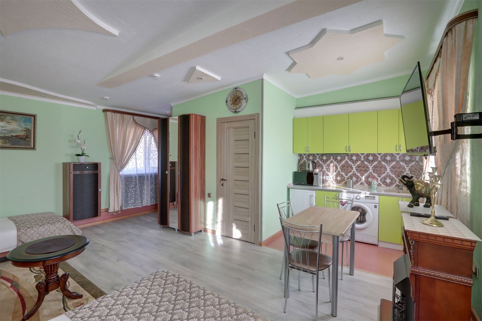 В номере: диван раскладной, зеркало, кровать двуспальная, кровать односпальная, прикроватные тумбочки, стол, стулья, шкаф, микроволновая печь, набор посуды, сейф, стиральная машина, телевизор, телефон, холодильник, электрочайник
