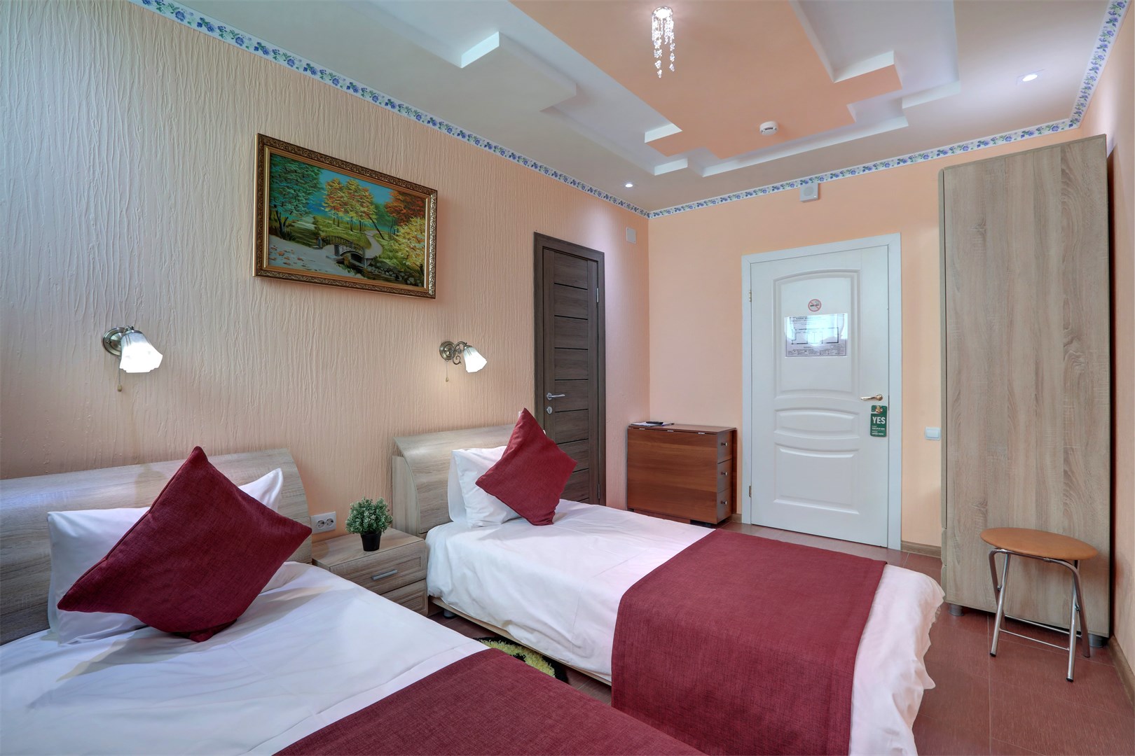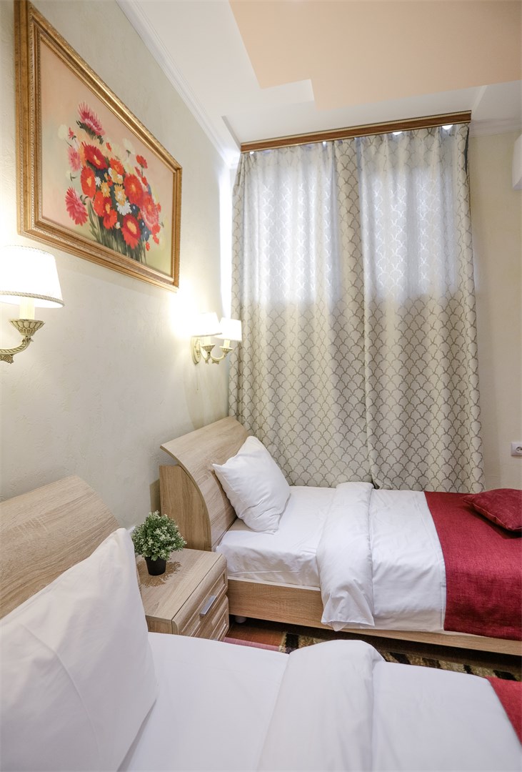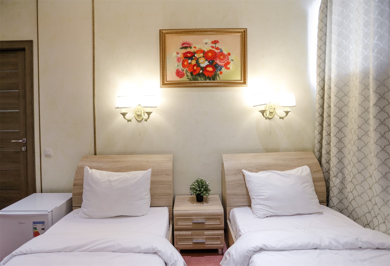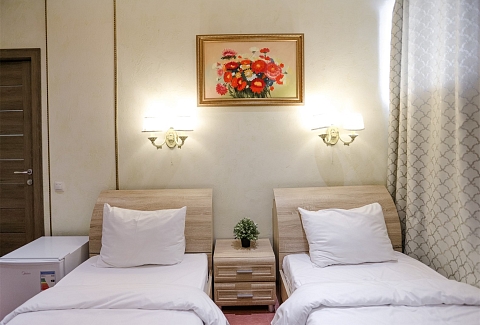 В номере: зеркало, кровати односпальные, прикроватные тумбочки, стол, стулья, шкаф, кондиционер, мини-холодильник, телевизор, телефон
