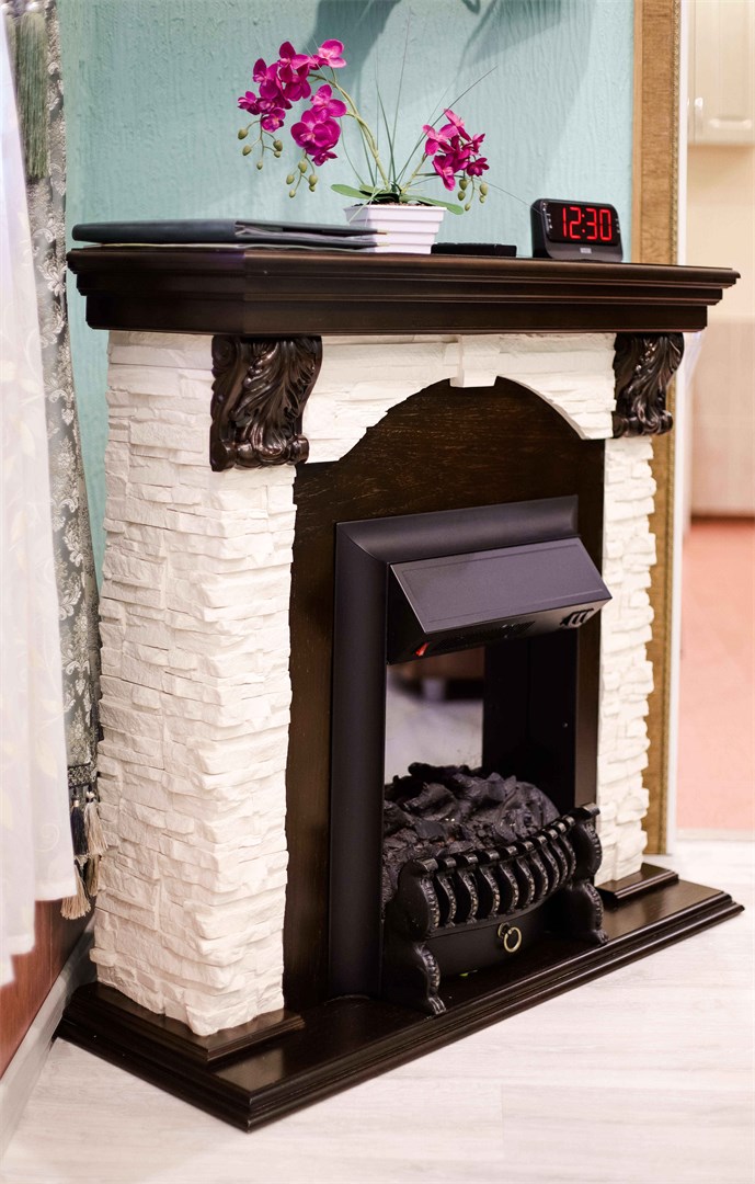В номере: зеркало, кровать двуспальная, стол, стулья, шкаф, камин, кондиционер, набор посуды, сейф, стиральная машина, телевизор, телефон, холодильник, электрочайник