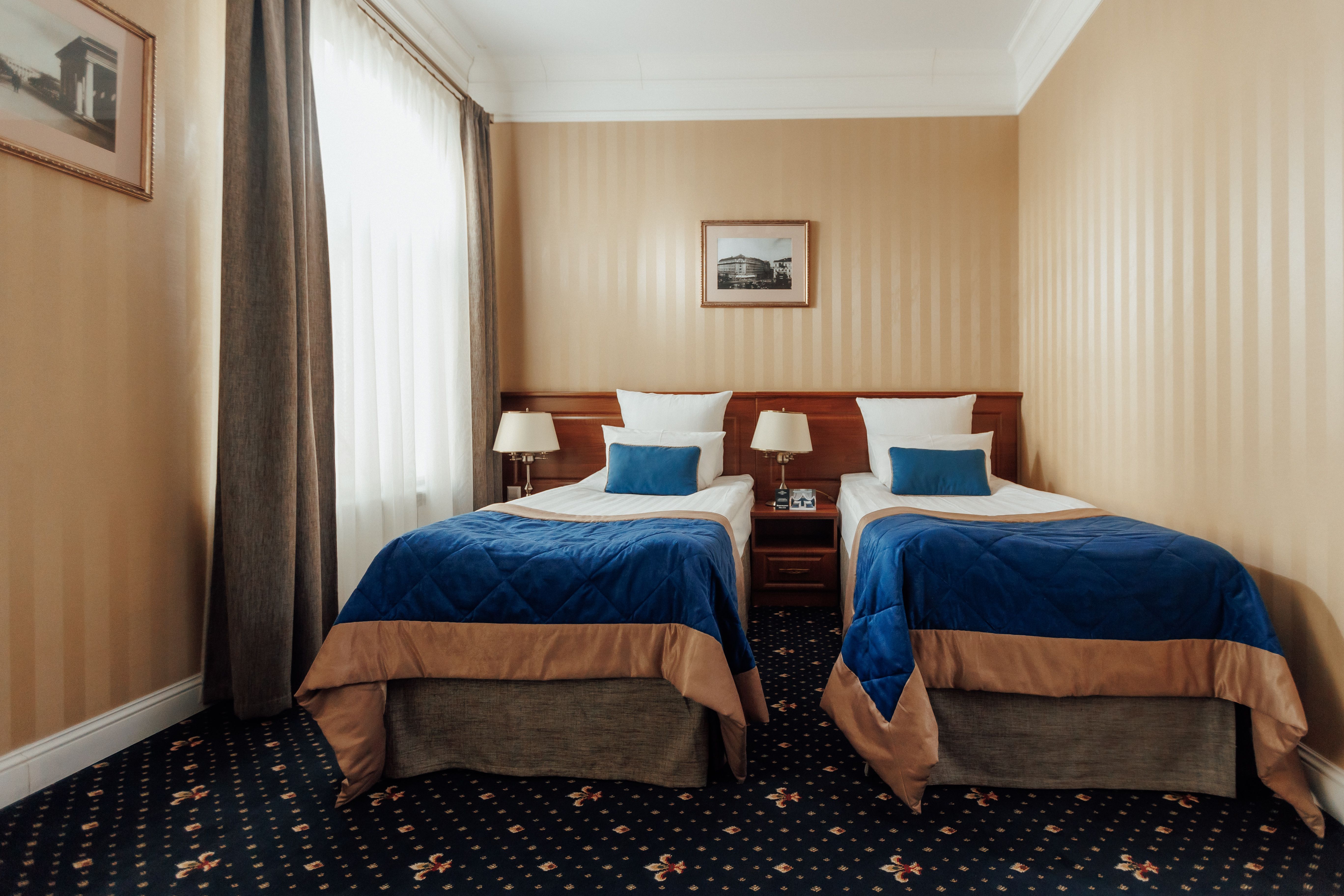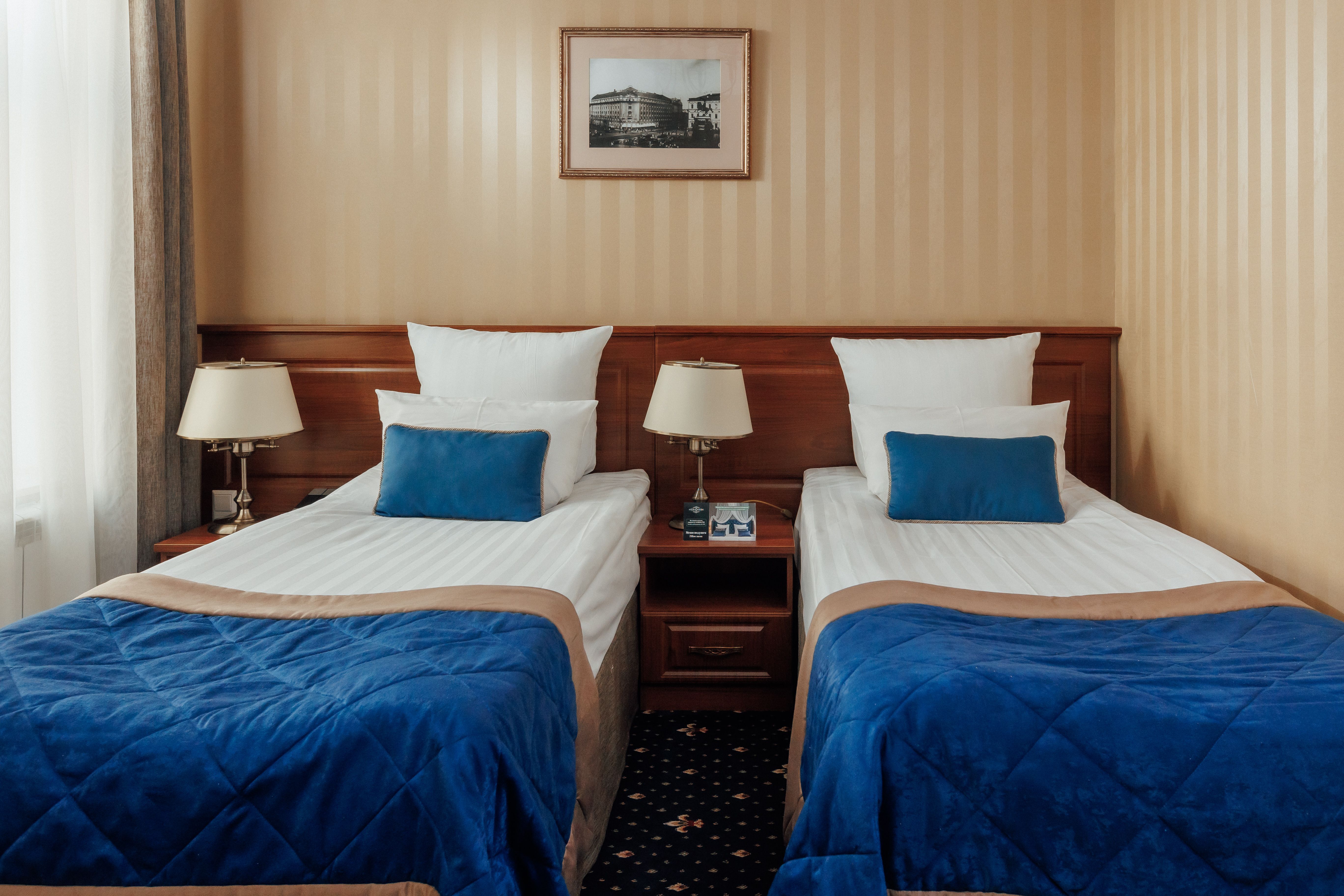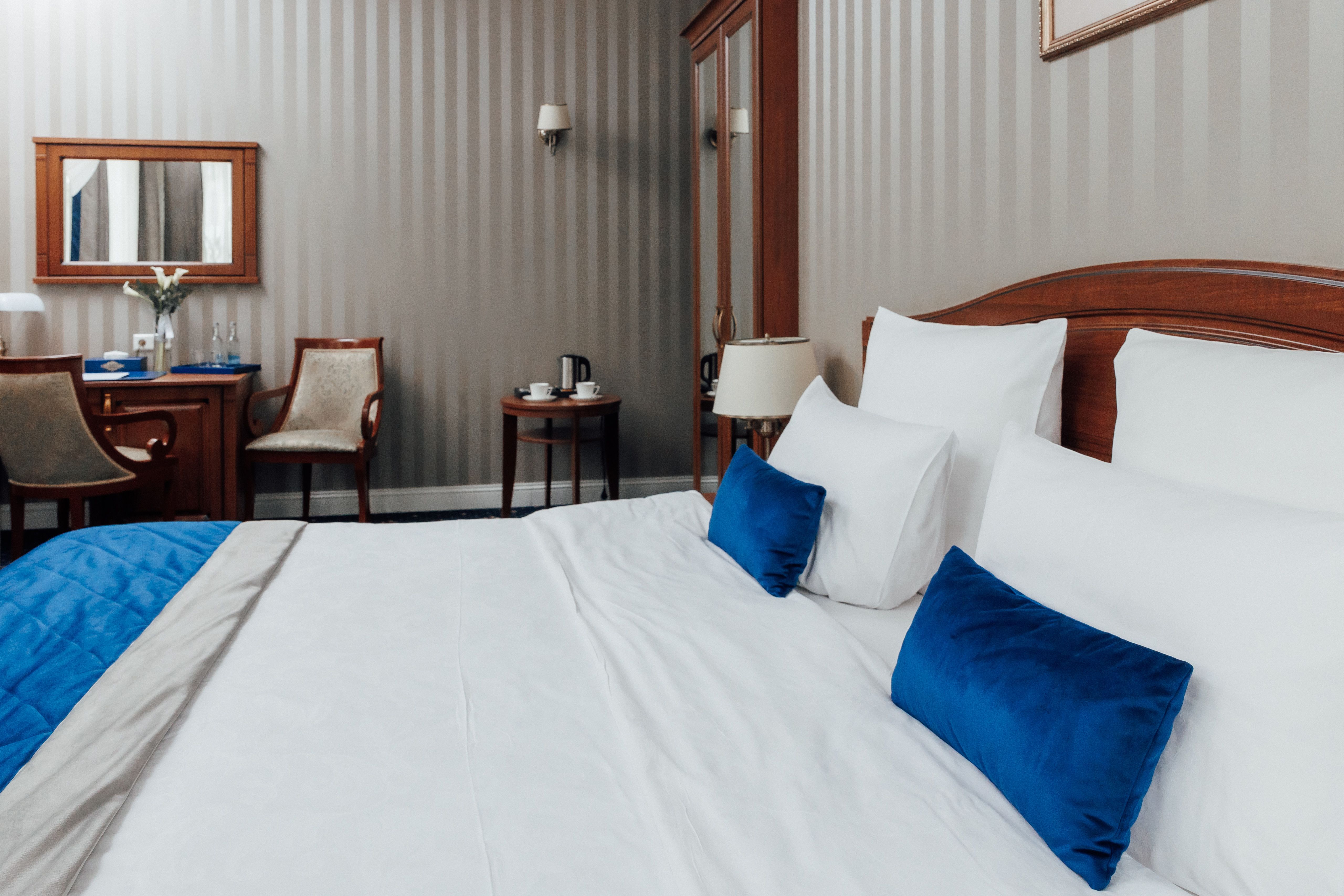 В номере: вешалка, гардеробная, зеркало, ковровое покрытие, кровати односпальные /одна двуспальная кровать, прикроватная тумбочка, стол, стул, шкаф, гладильная доска, сейф, сплит-система, телевизор, телефон, умная колонка, утюг, чайная станция, электрочайник