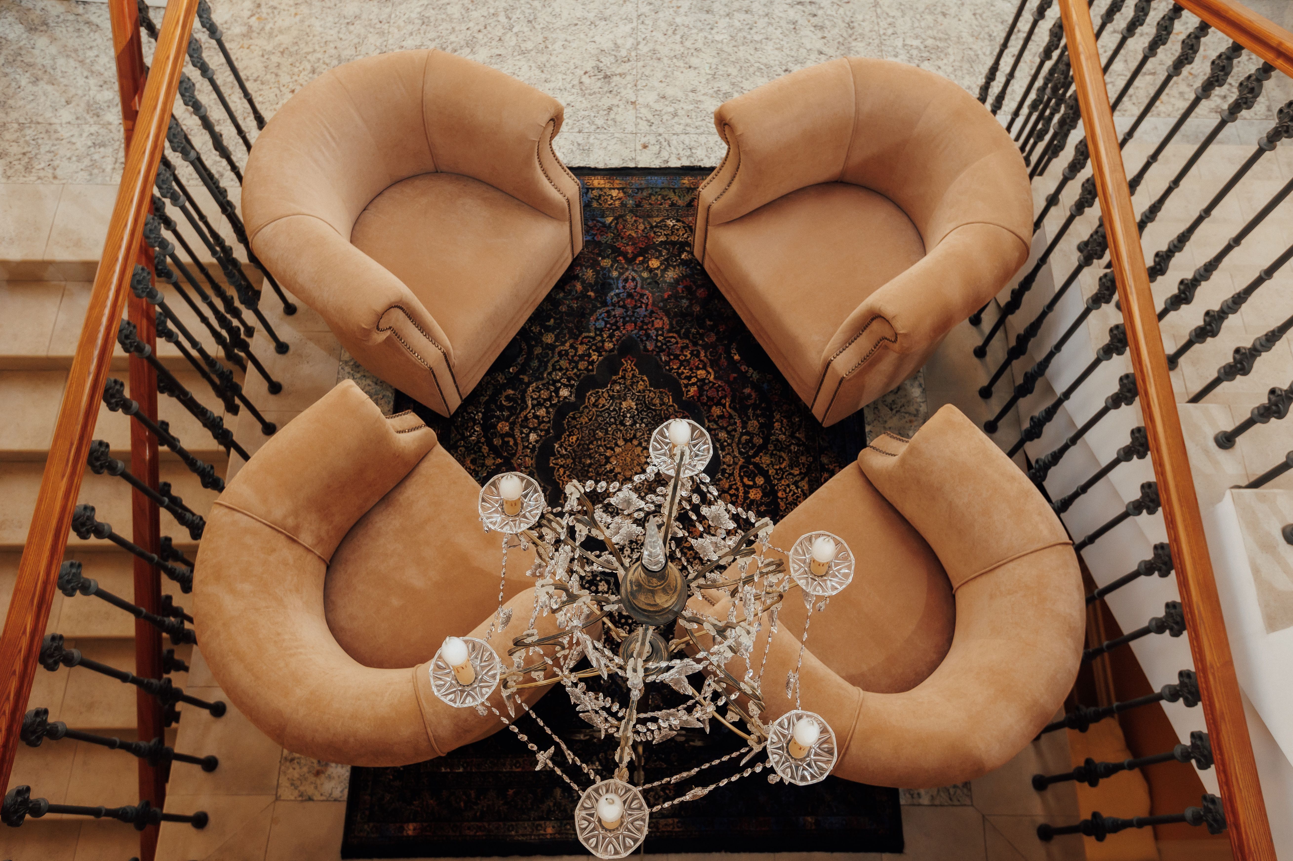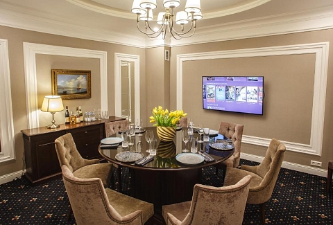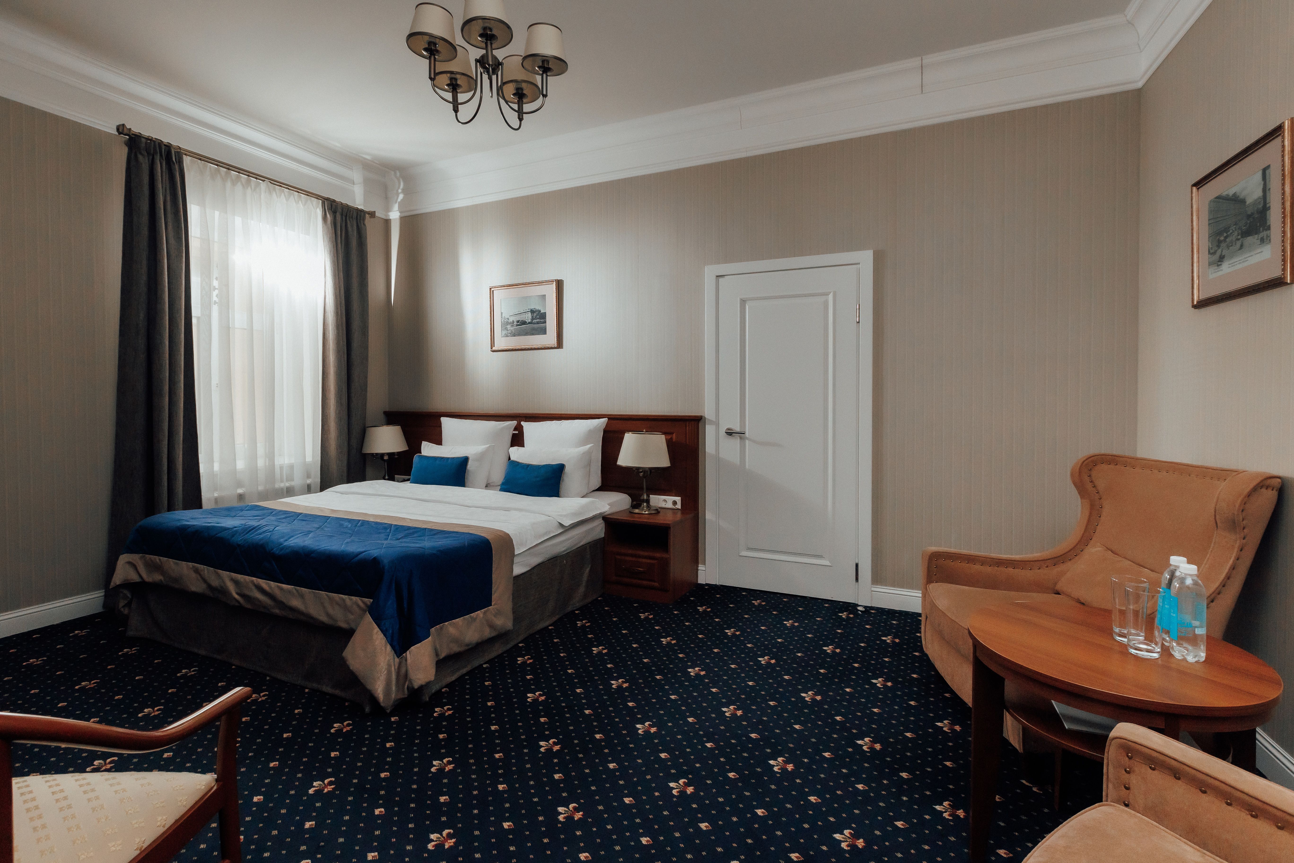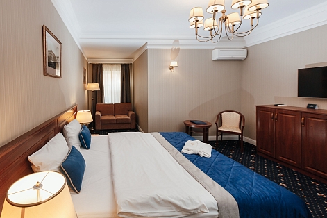 В номере: вешалка, гардеробная, зеркало, кресла, кровать двуспальная, прикроватная тумбочка, стол, стул, тумба под телевизор, шкаф, гладильная доска, кофемашина, сейф, сплит-система, телевизор, телефон, умная колонка, утюг, чайная станция, электрочайник