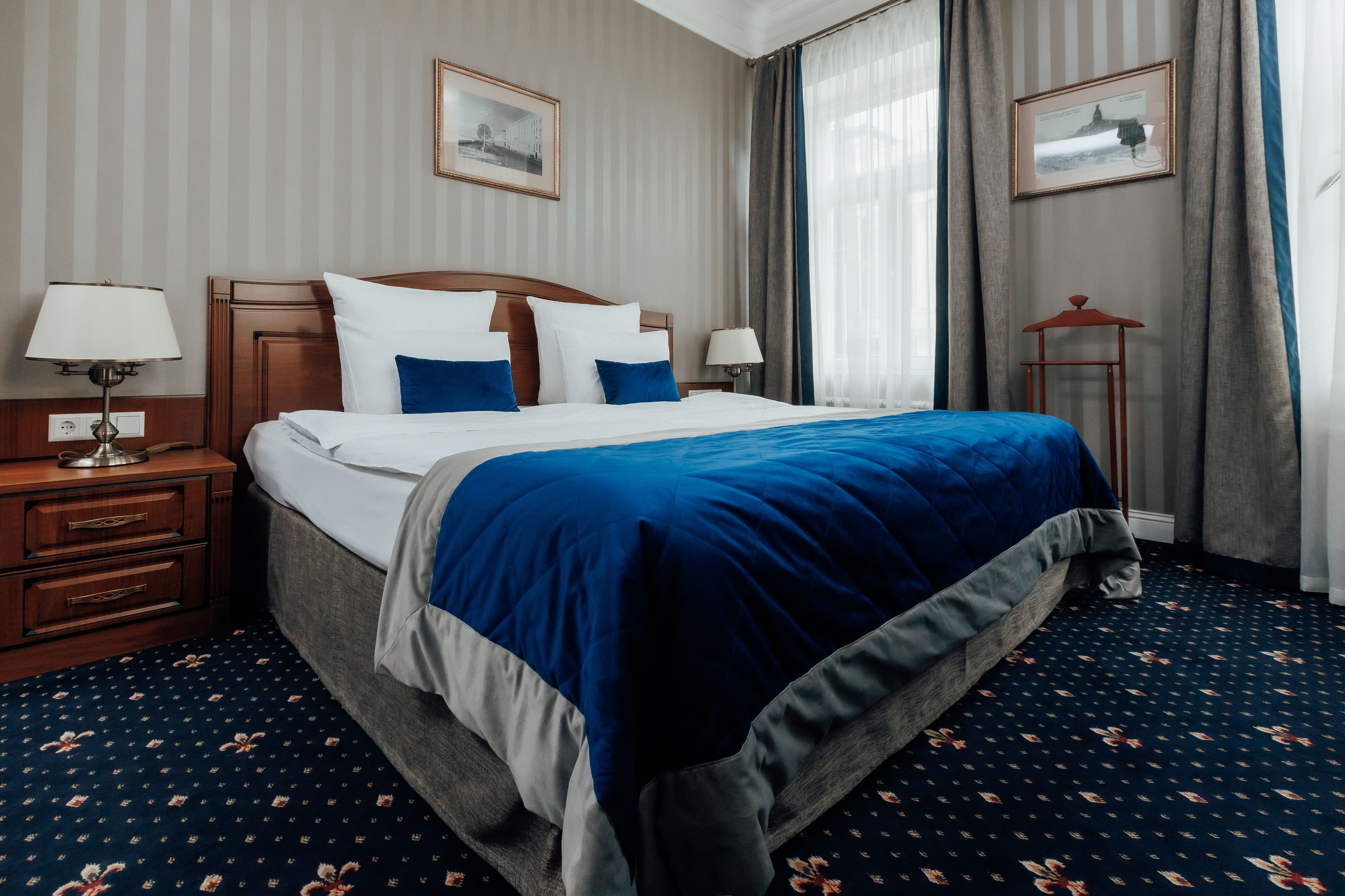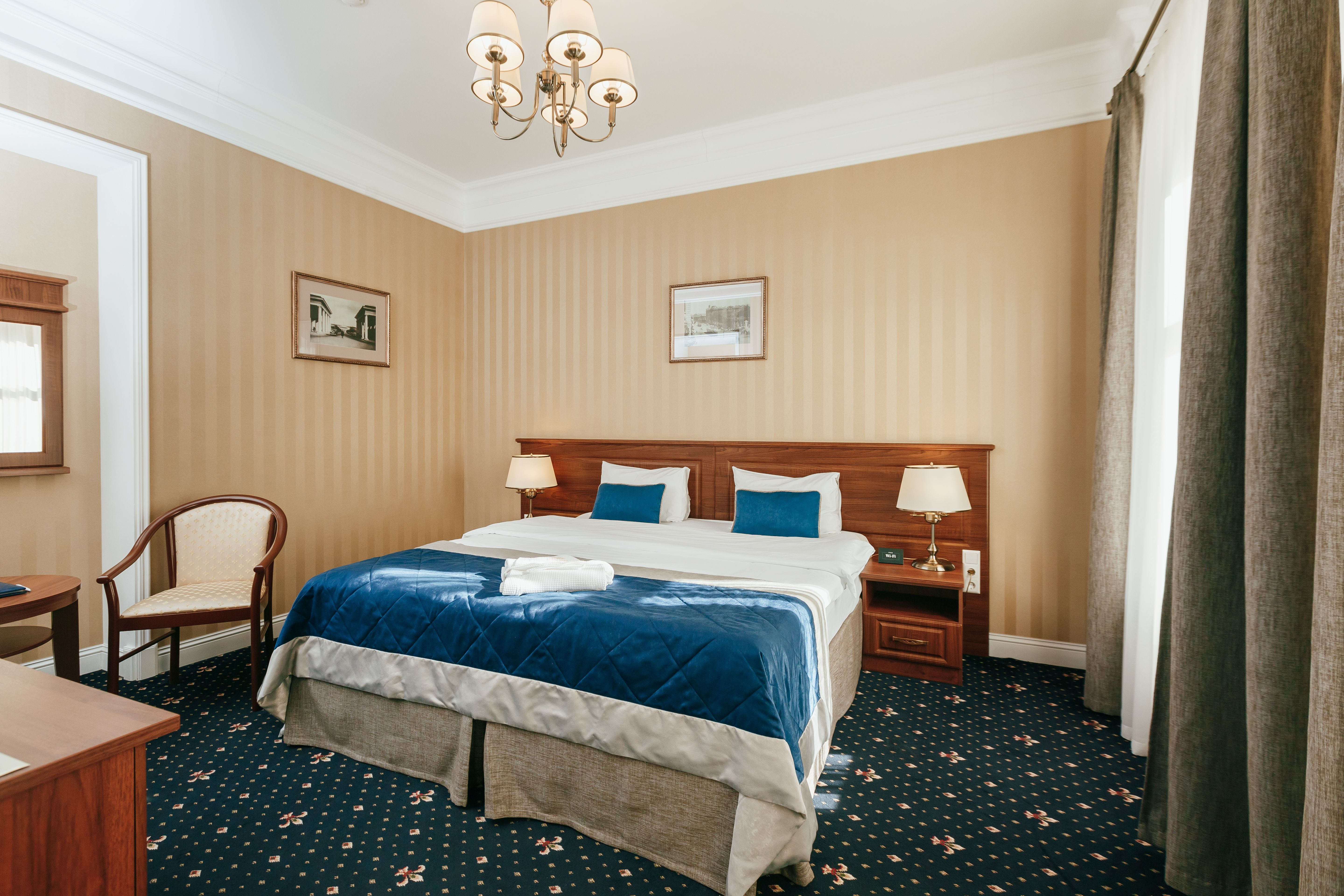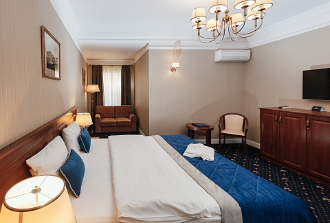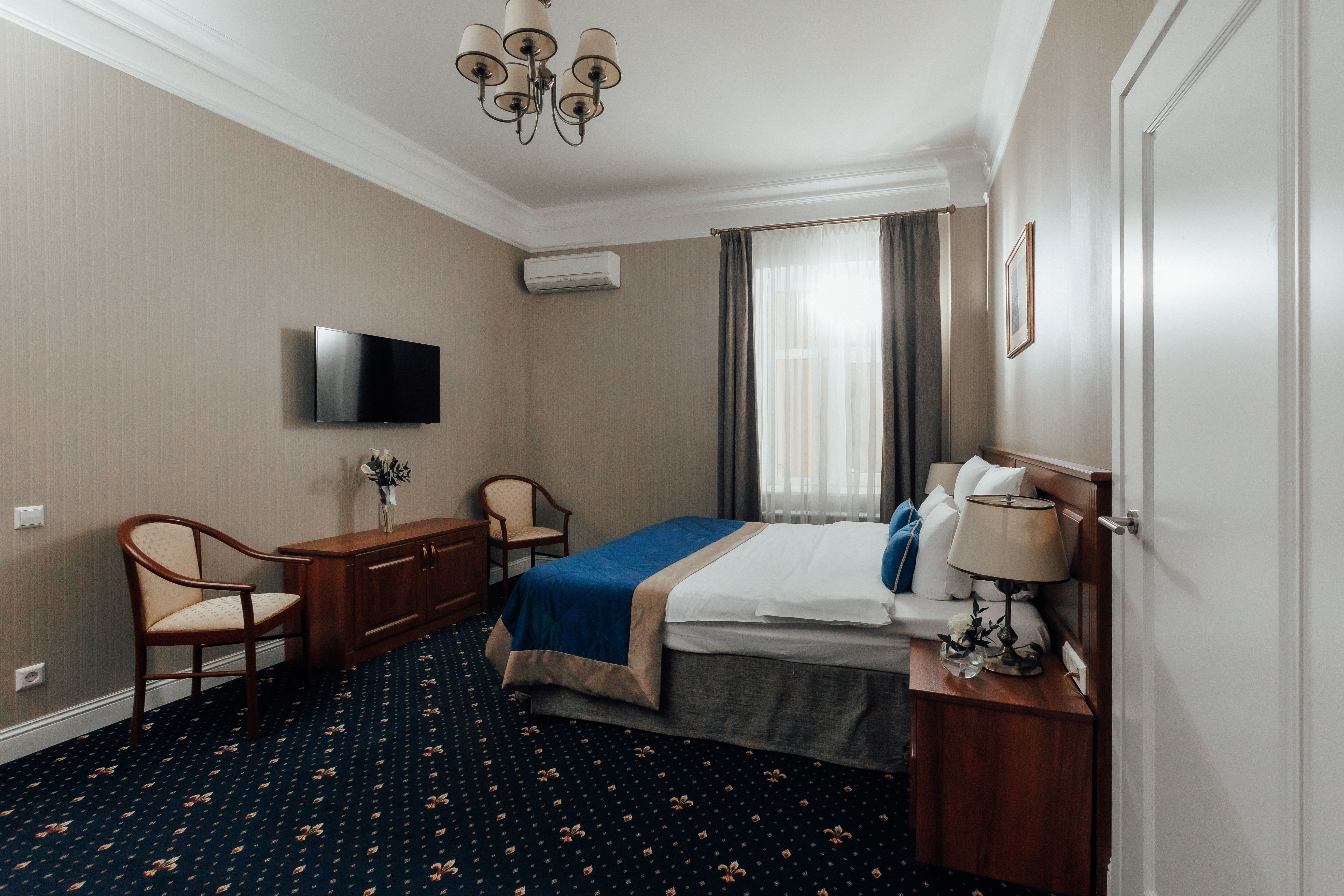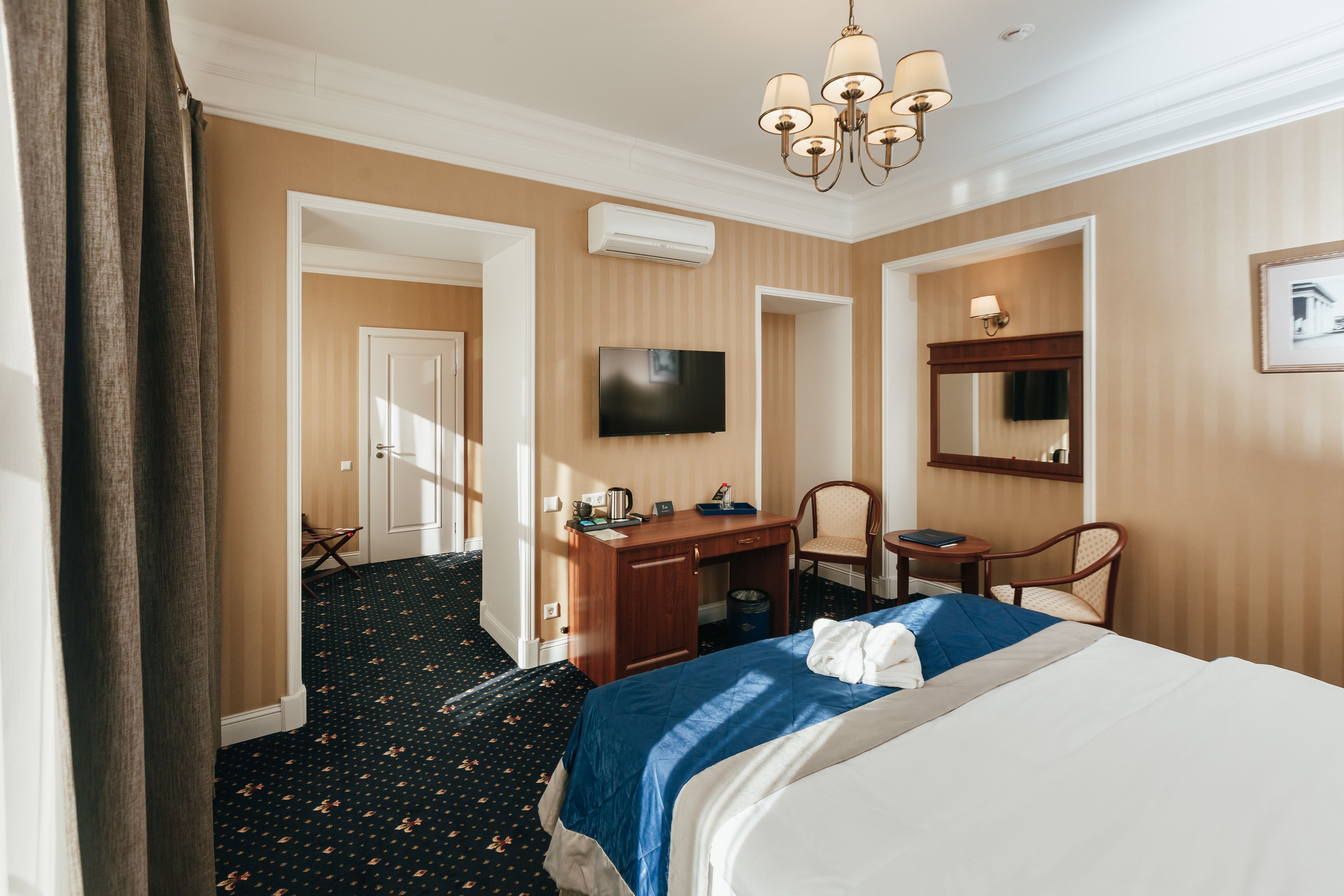 В номере: вешалка, гардеробная, зеркало, кровать двуспальная, прикроватные тумбочки, стол, стул, шкаф, гладильная доска, сейф, сплит-система, телевизор, телефон, умная колонка, чайная станция, электрочайник