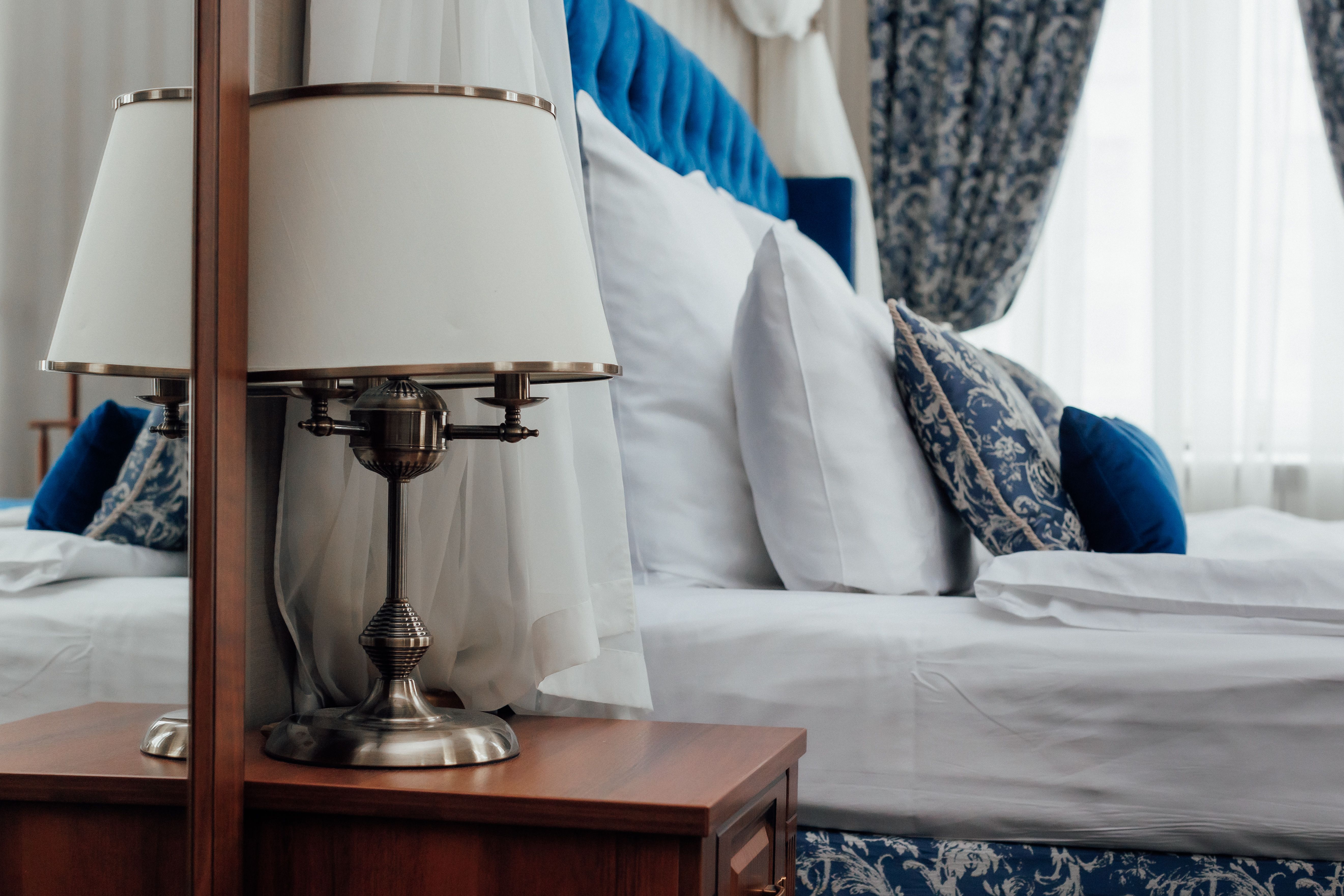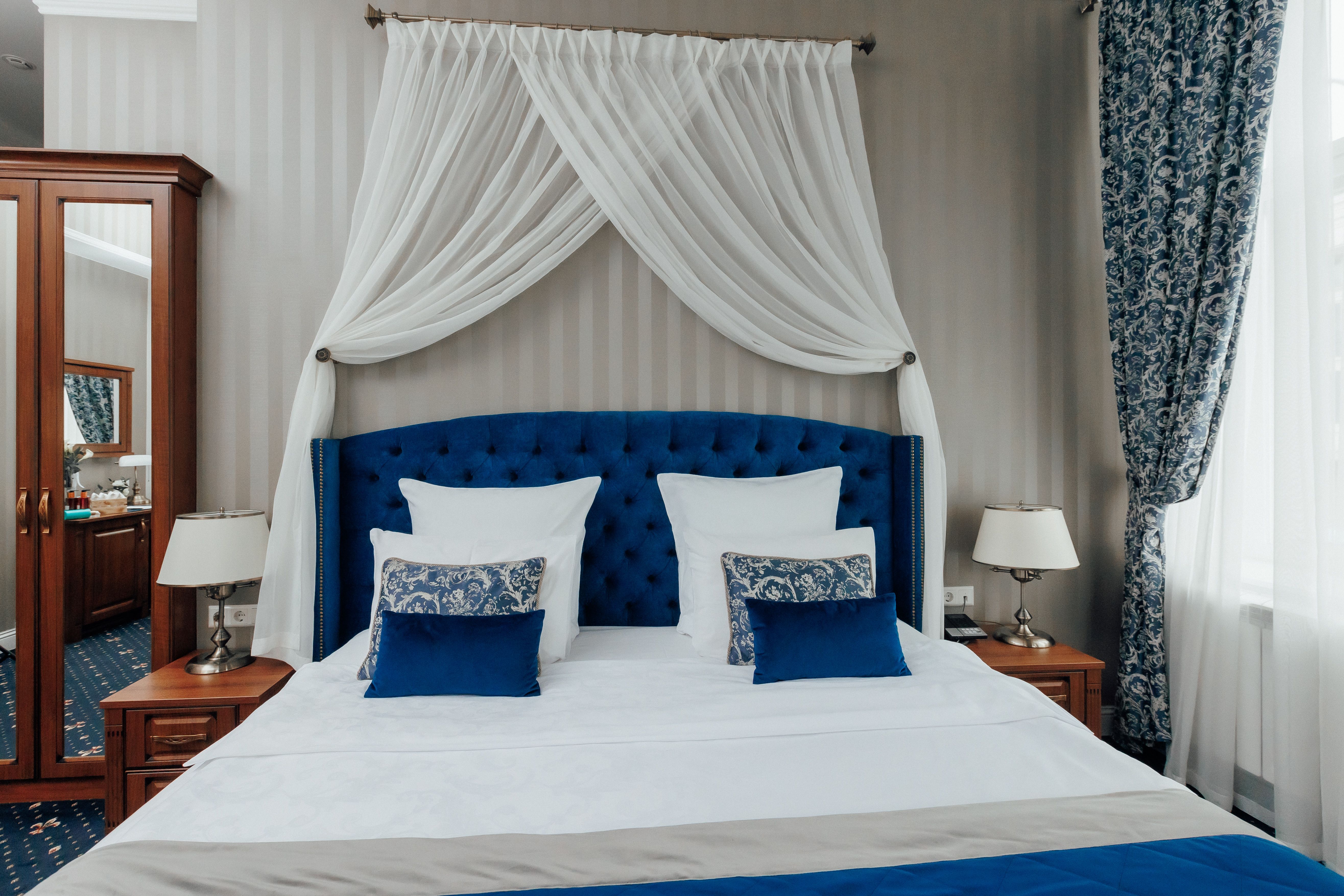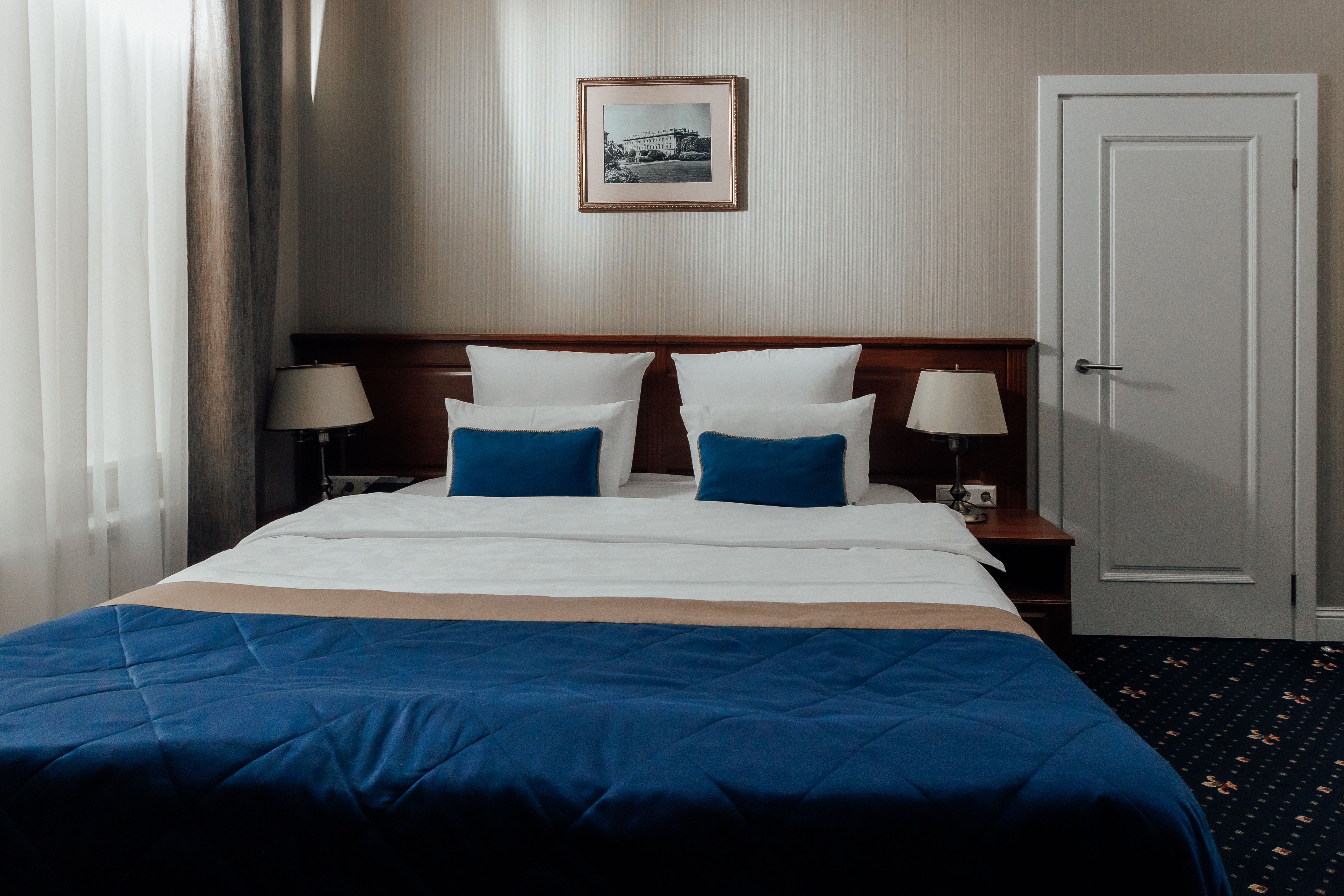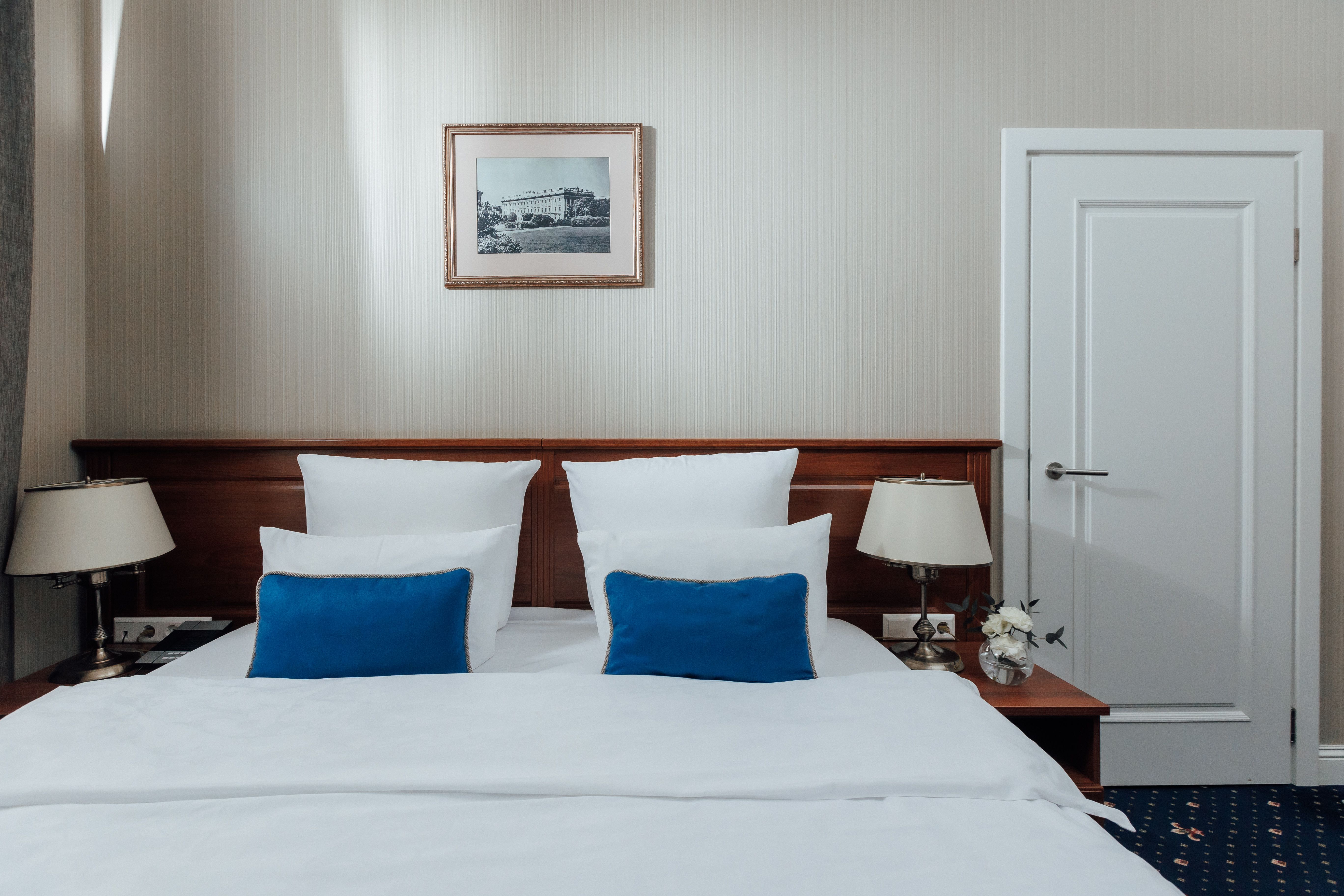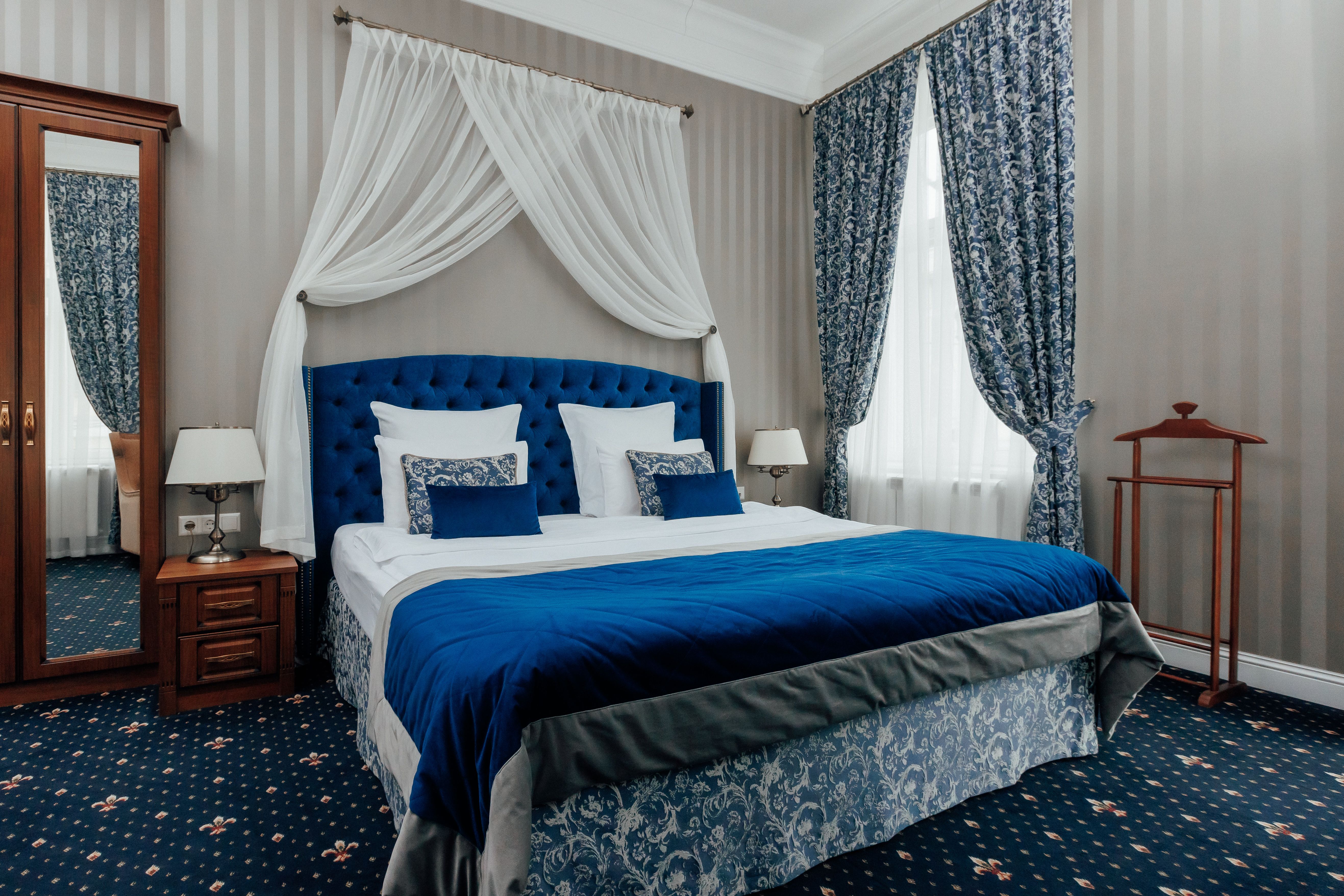 В номере: вешалка, гардеробная, зеркало, кровать двуспальная, прикроватные тумбочки, стол, стул, шкаф, гладильная доска, сейф, сплит-система, телевизор, телефон, умная колонка, чайная станция, электрочайник