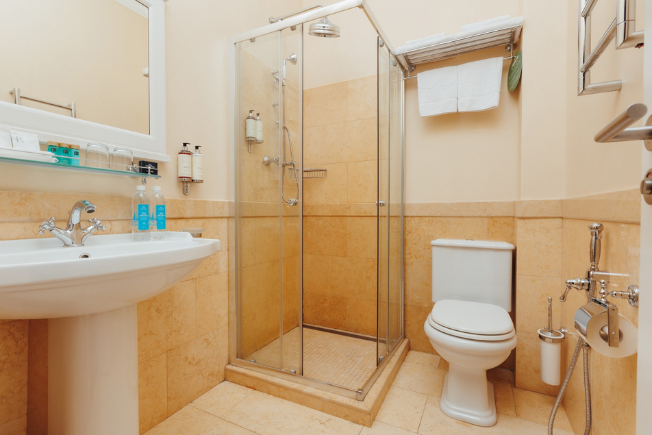 Санузел: с душевой кабиной, тапочки, туалетные принадлежности, фен, халат