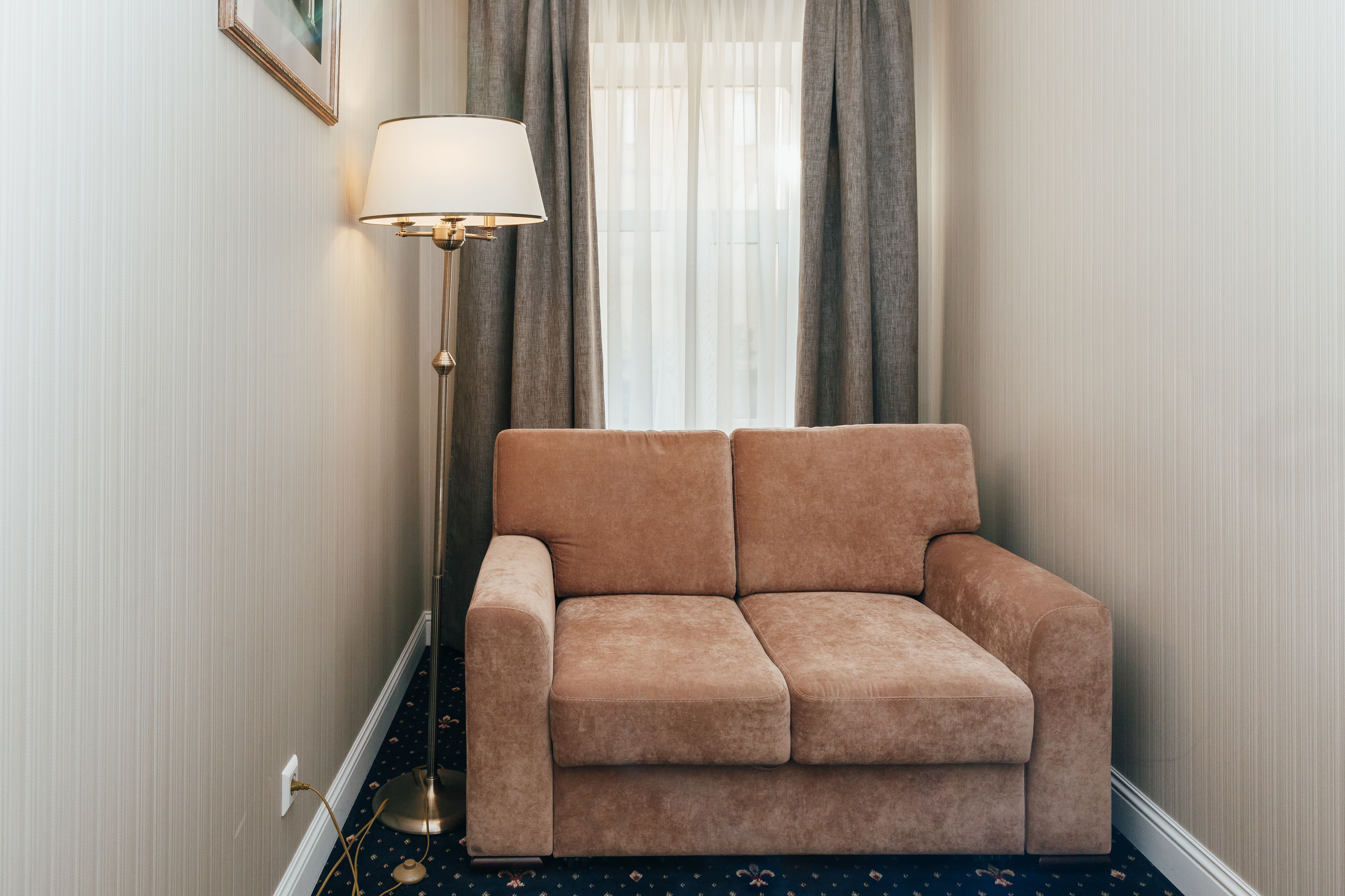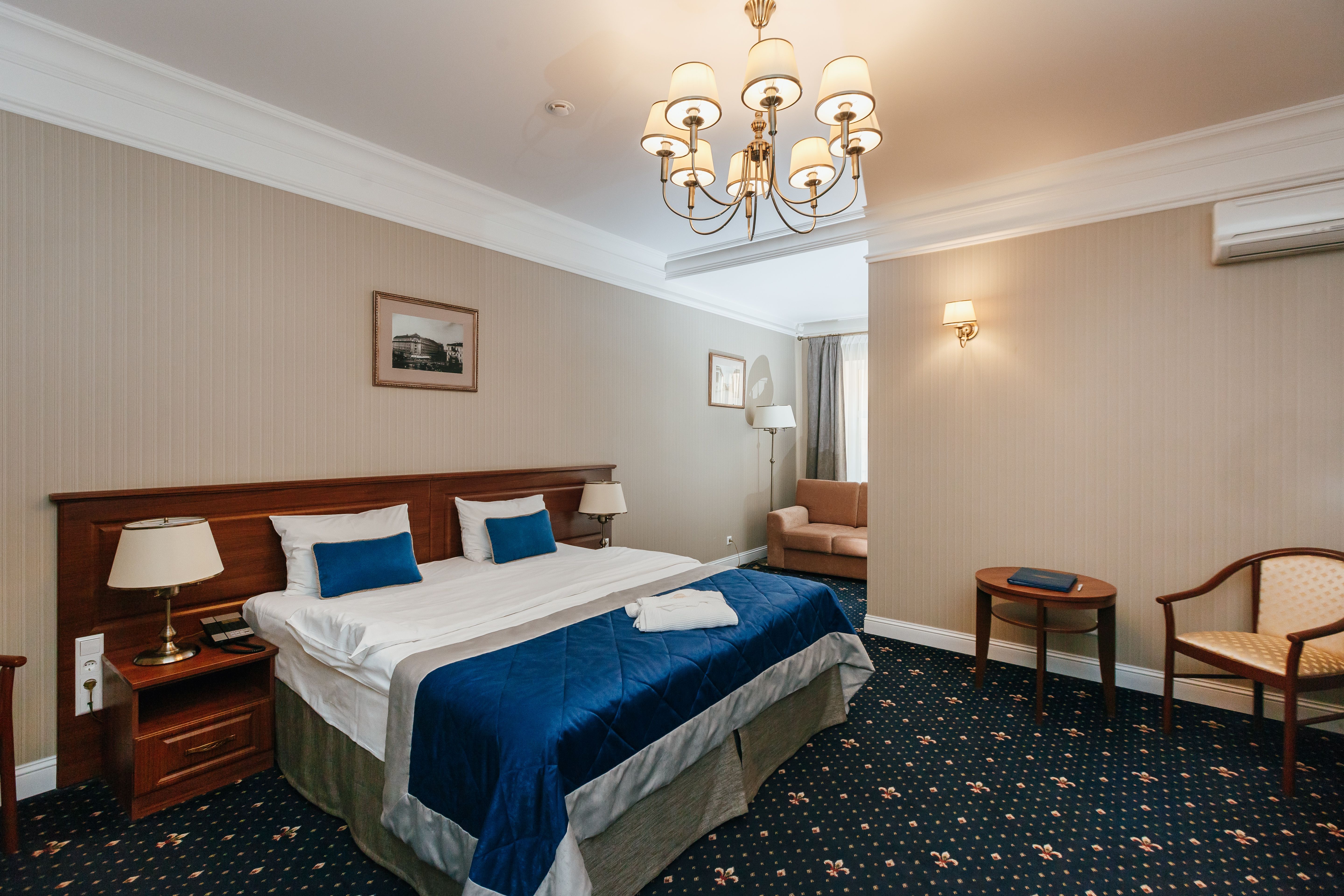 В номере: гардеробная, диван раскладной, зеркало, ковровое покрытие, кровати односпальные /одна двуспальная кровать, прикроватная тумбочка, стол, стул, шкаф, гладильная доска, сейф, сплит-система, телевизор, телефон, умная колонка, утюг, чайная станция, электрочайник