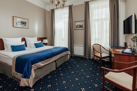 В номере: вешалка, гардеробная, зеркало, кровати односпальные /одна двуспальная кровать, прикроватная тумбочка, стол, стул, шкаф, сейф, сплит-система, телевизор, телефон, утюг, чайная станция, электрочайник