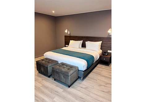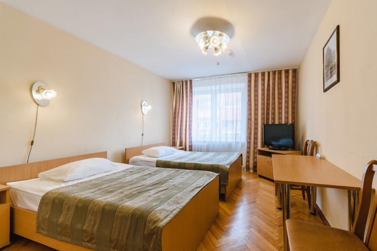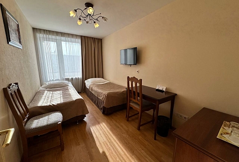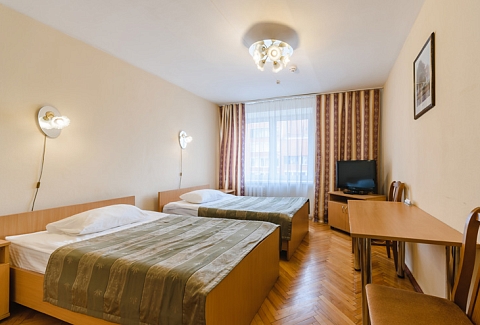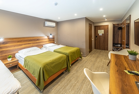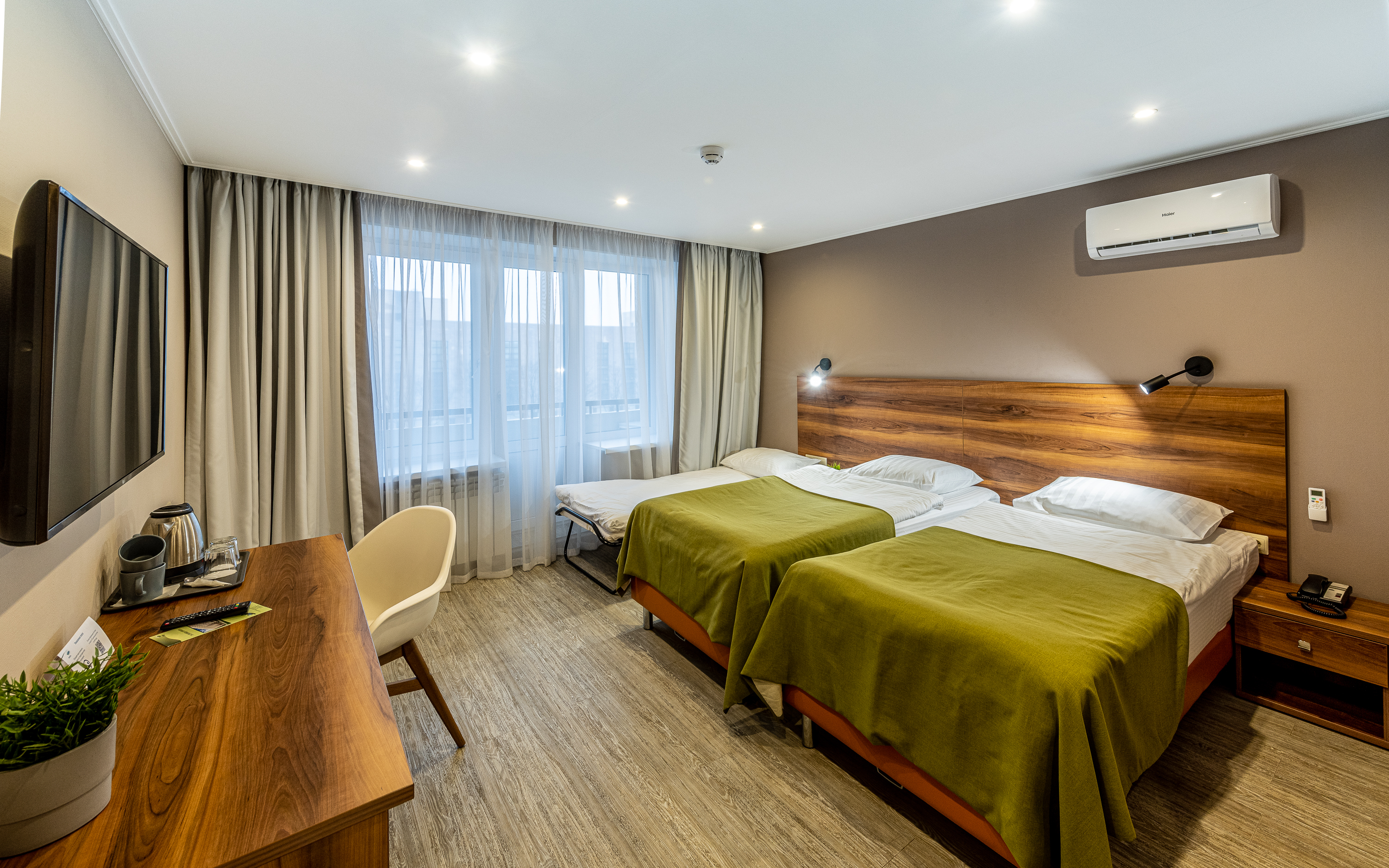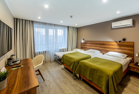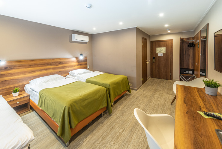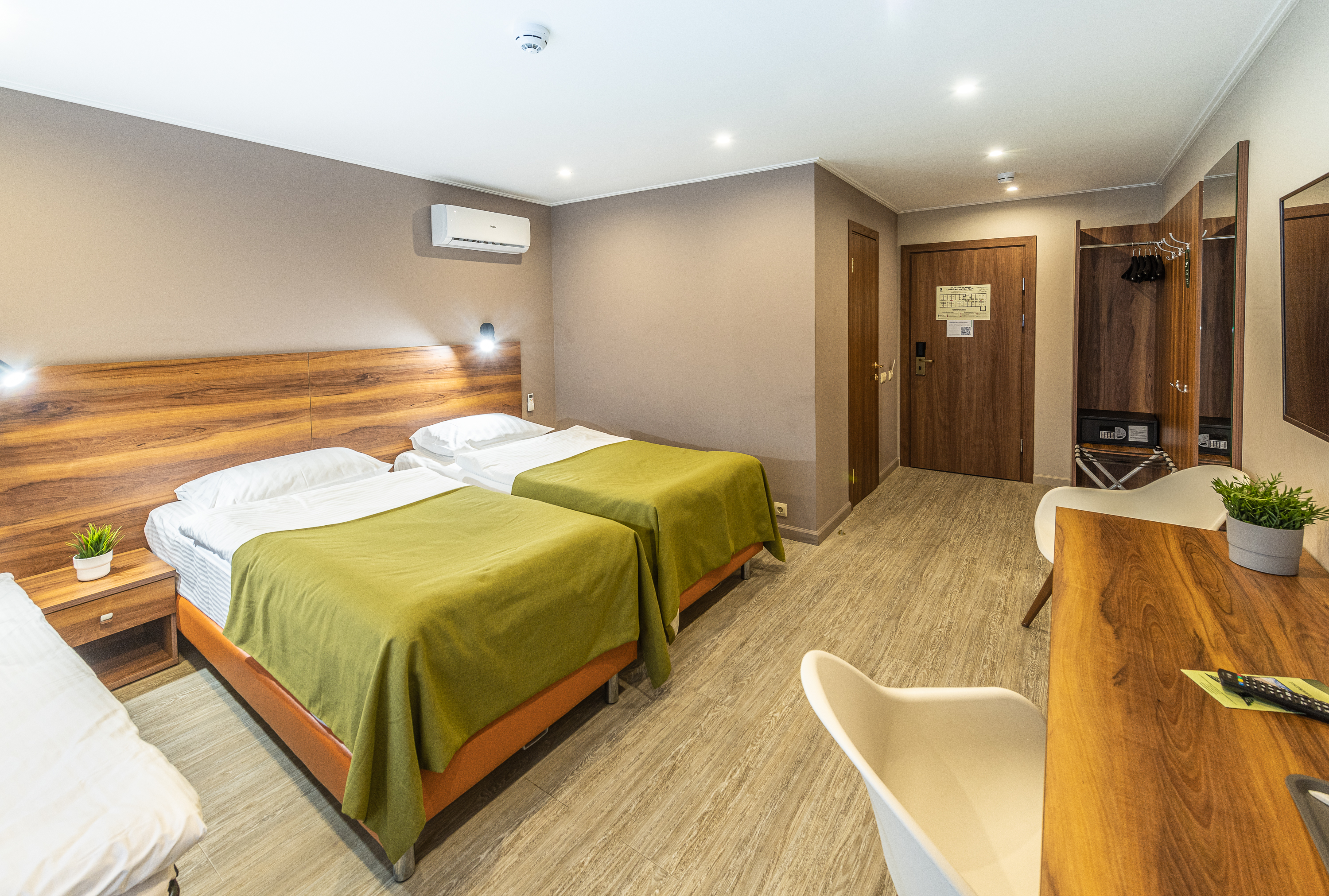 В номере: вешалка, зеркало, кровати односпальные /одна двуспальная кровать, прикроватные тумбочки, стол, стулья, шкаф, кондиционер, мини-холодильник, сейф, телевизор, чайник