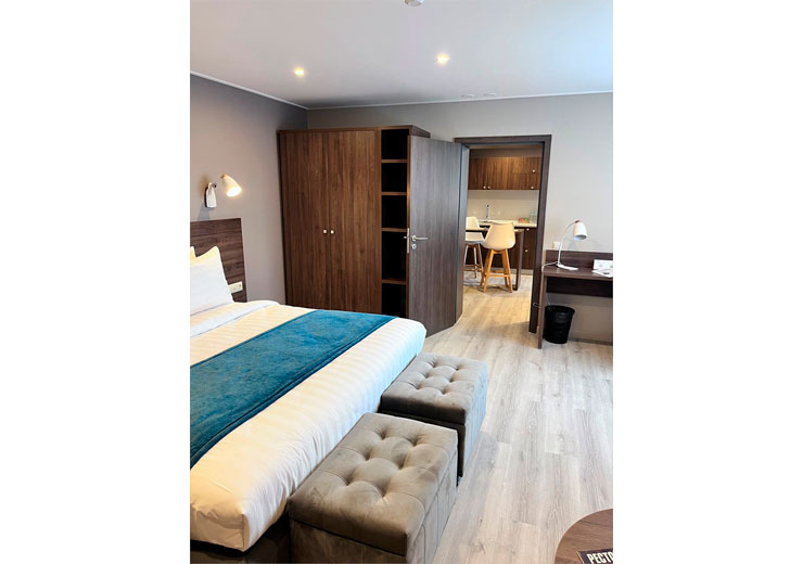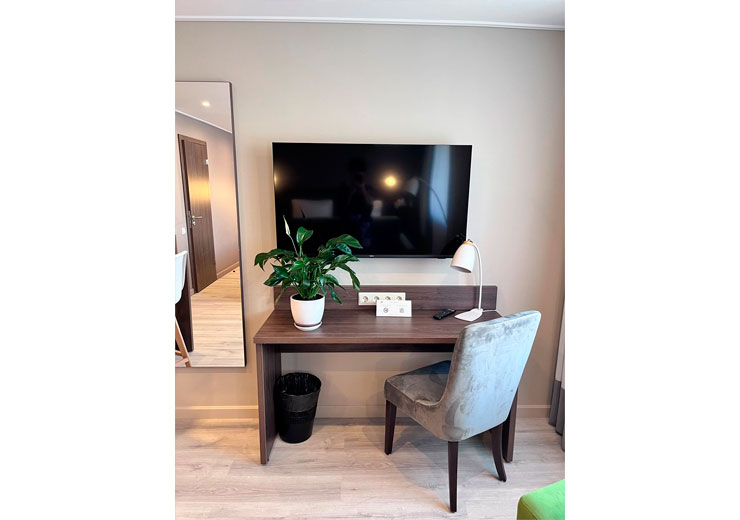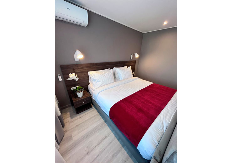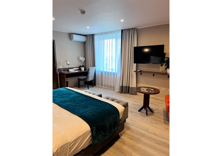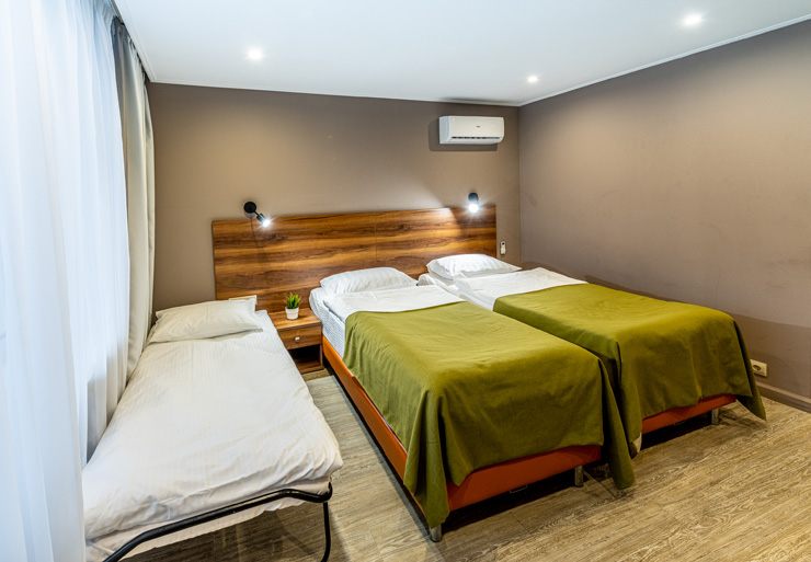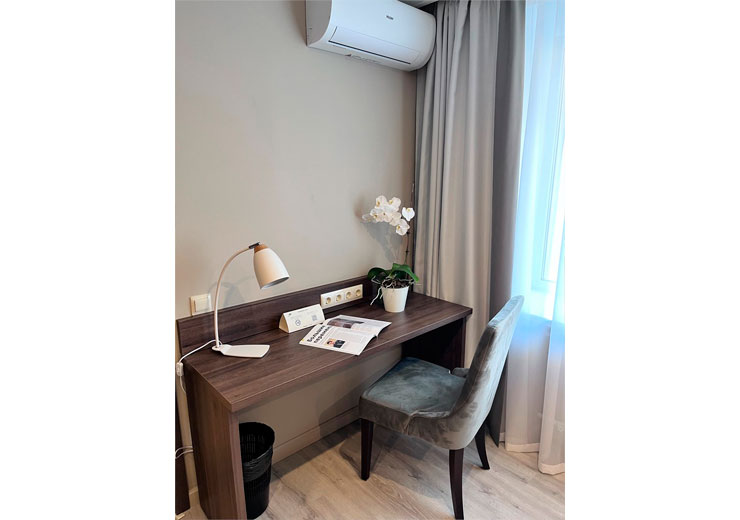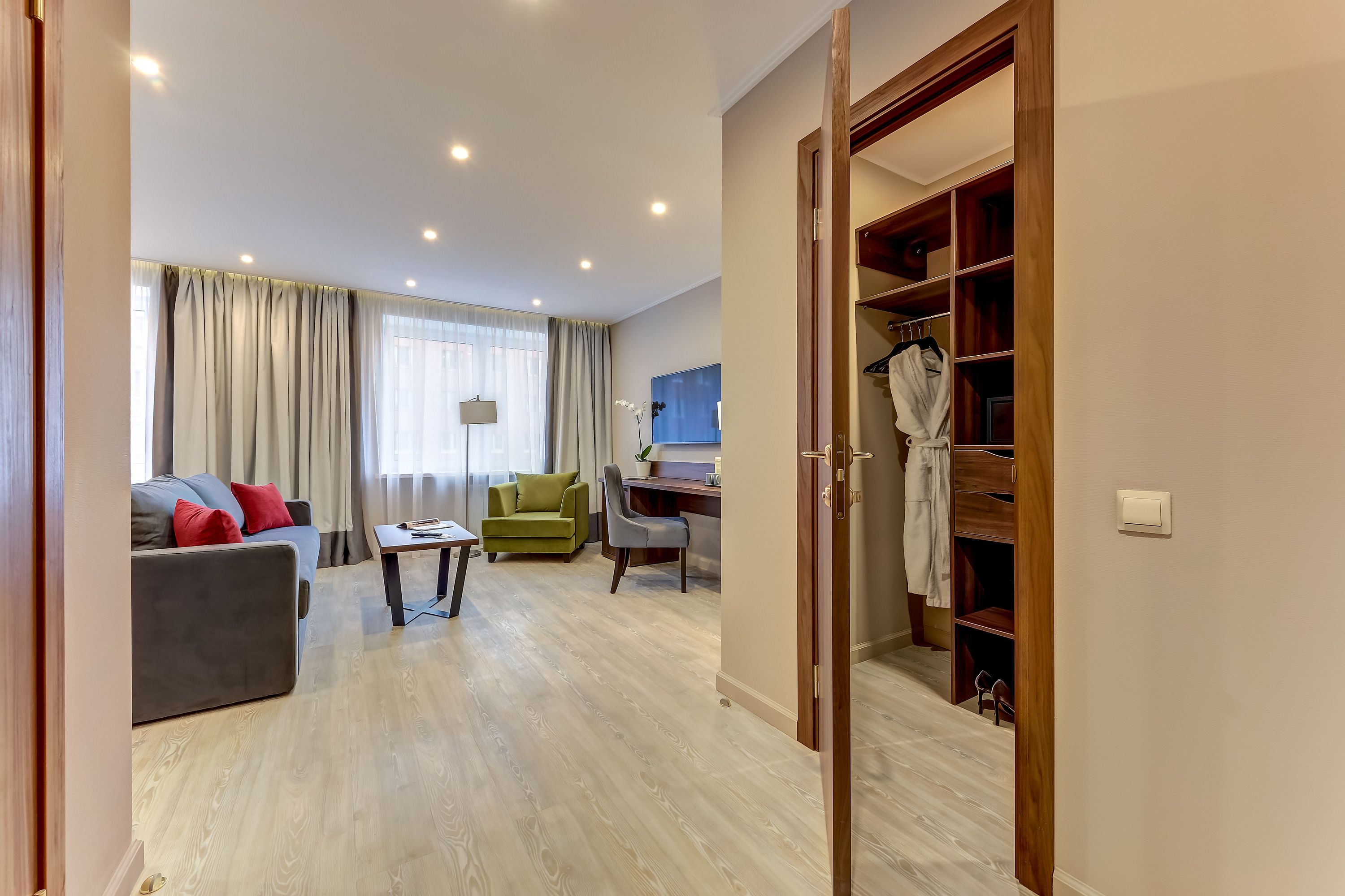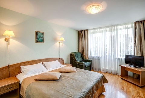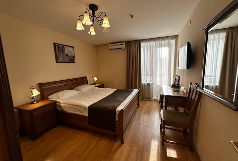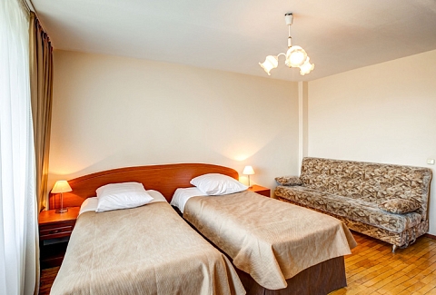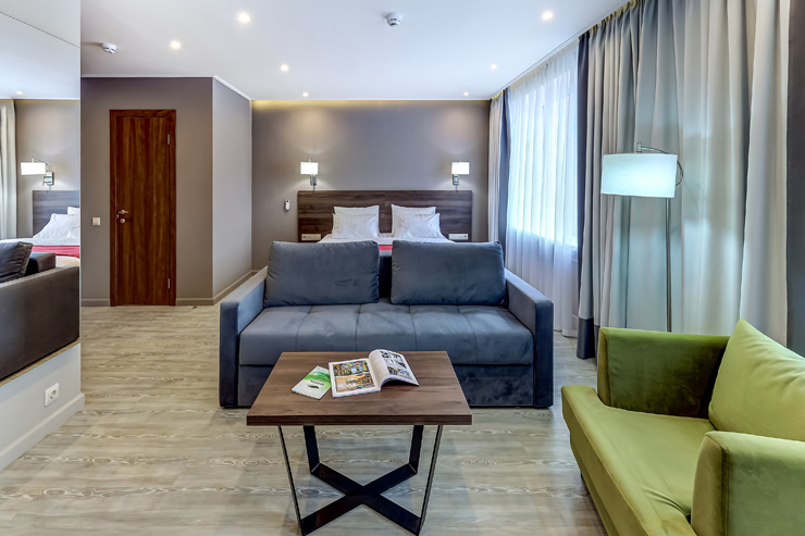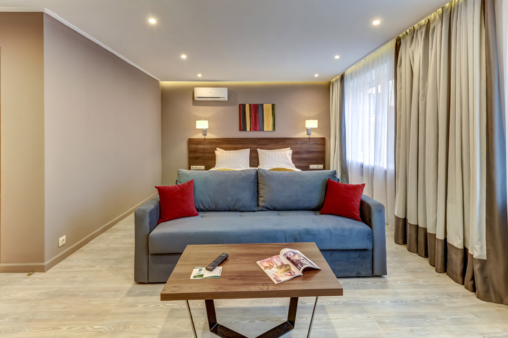 В номере: вешалка, диван, зеркало, кресло, кровати односпальные /одна двуспальная кровать, прикроватные тумбочки, стол, стул, шкаф, кондиционер, мини-холодильник, набор посуды, сейф, телевизор, телефон, электрочайник