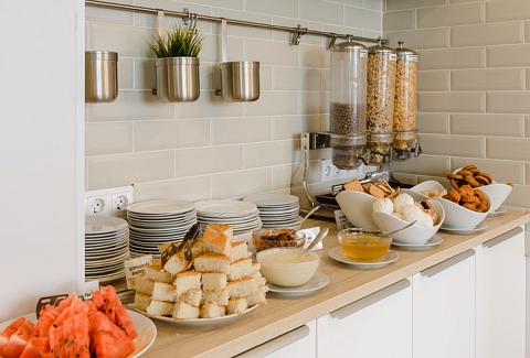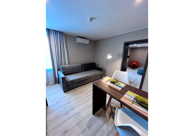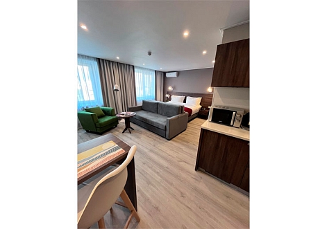 В номере: диван раскладной, зеркало, кресло, кровать двуспальная, прикроватные тумбочки, стол, стулья, шкаф, кондиционер, микроволновая печь, мини-холодильник, набор посуды, сейф, телевизор, телефон, электрочайник