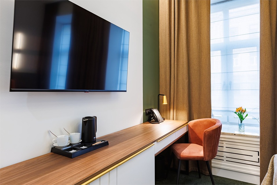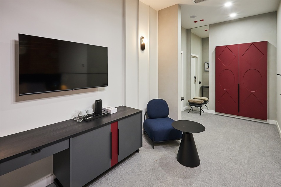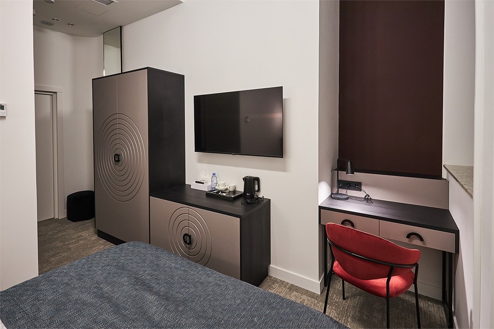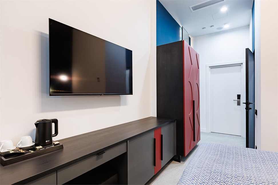 В номере: вешалка, зеркало, кровать двуспальная, прикроватные тумбочки, стол, стулья, шкаф, кондиционер, мини-холодильник, сейф, телевизор, телефон, чайная станция, чайный набор посуды