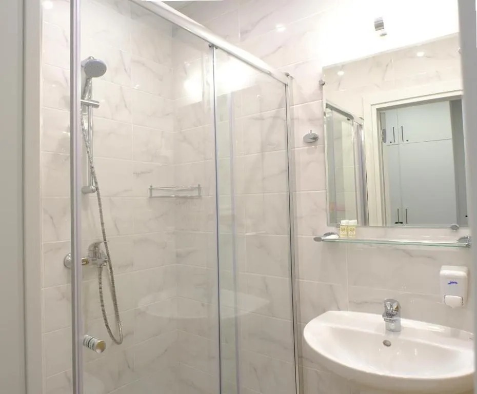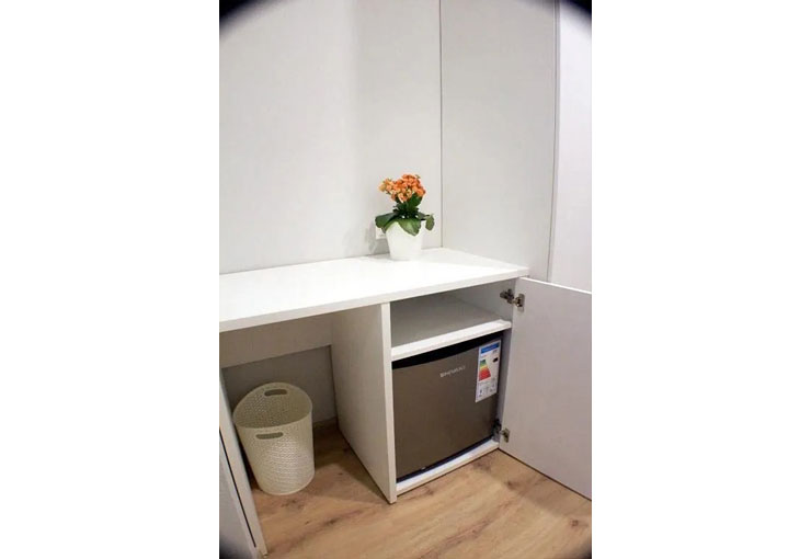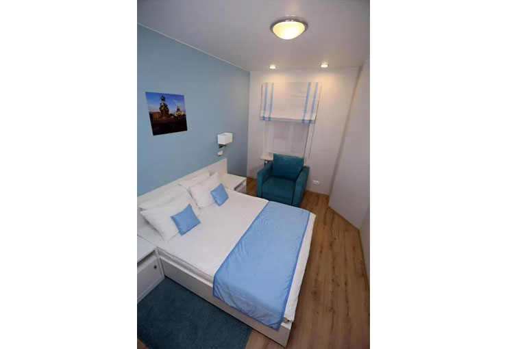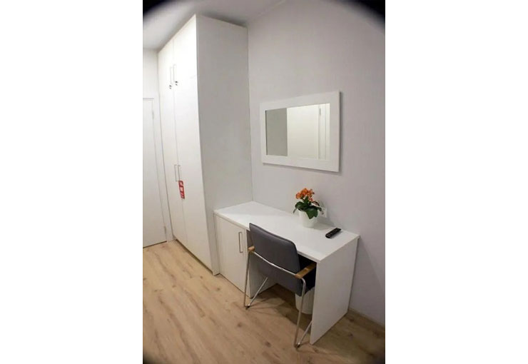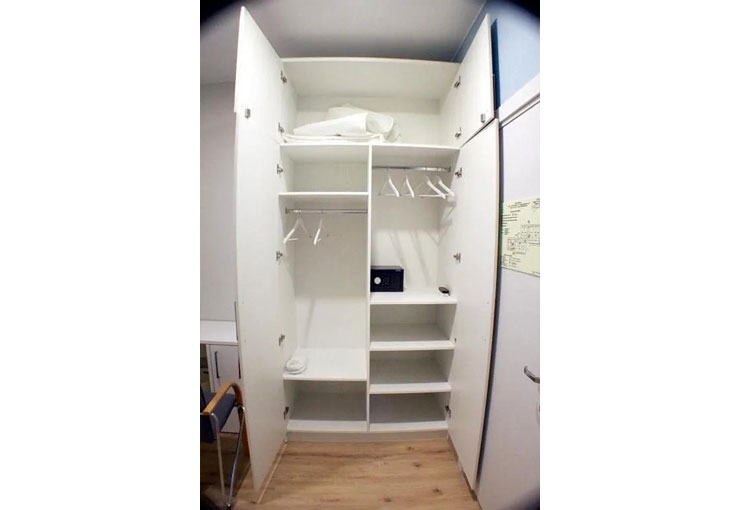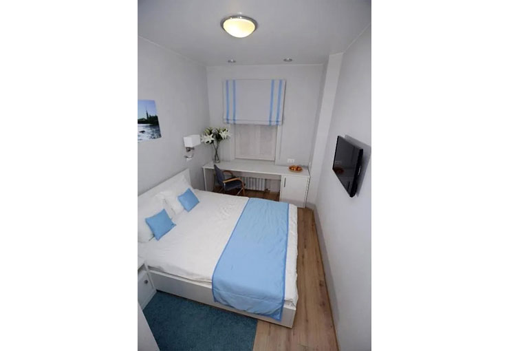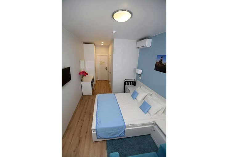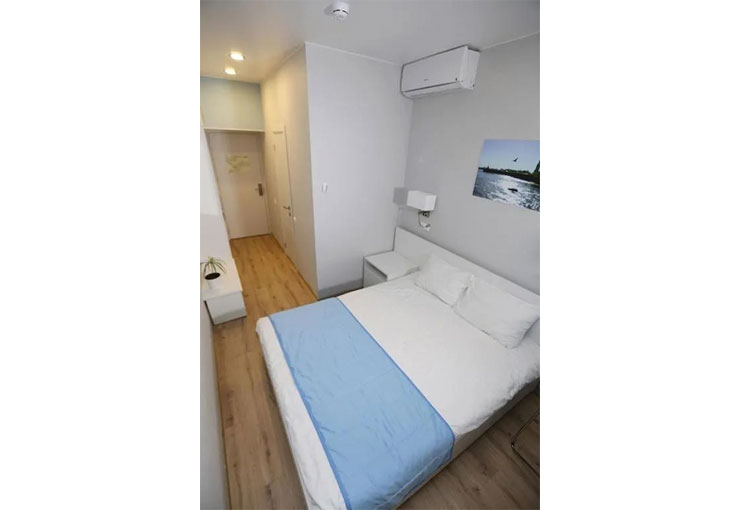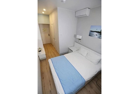 В номере: вешалка, зеркало, кровать односпальная, стол, стул, шкаф, кондиционер, мини-холодильник, сейф, телевизор
