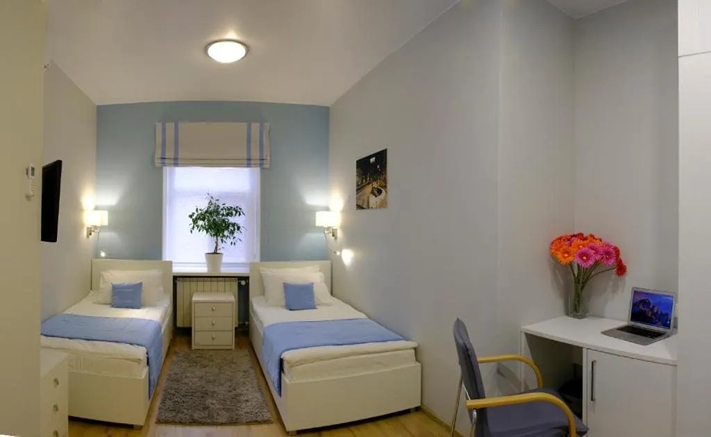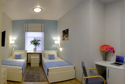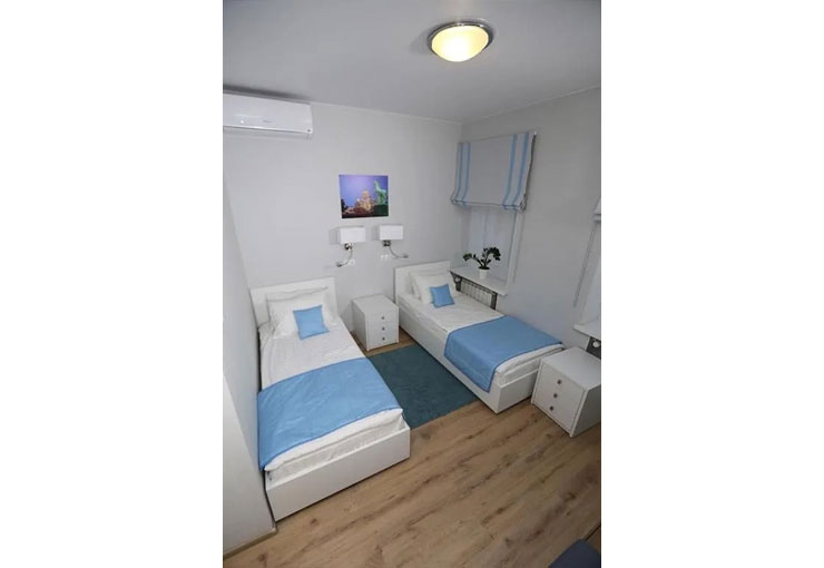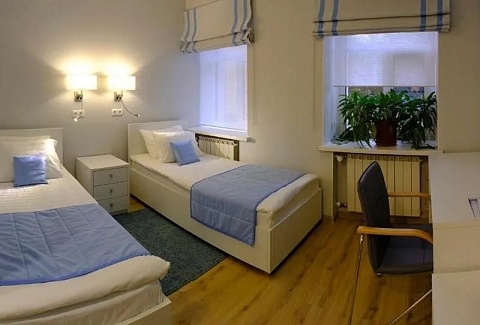 В номере: вешалка, зеркало, кровати односпальные, стол, стул, шкаф, кондиционер, мини-холодильник, сейф, телевизор
