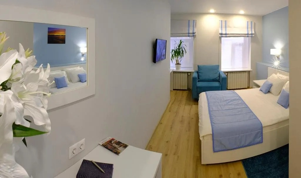 Гостиница занимает часть исторического здания — это бывший доходный дом чиновника Челищева. Номера светлые, оформлены в приятной цветовой гамме с обилием белого и голубого, дополнены элементами под натуральное дерево. В комнатах установлены одно- или двуспальные кровати, мягкая и корпусная мебель, современная техника, санузлы с душевыми кабинами и набором косметических принадлежностей. Работает Wi-Fi.В мини-отеле открыта небольшая столовая, где постояльцам подают завтрак. К услугам гостей — круглосуточный ресепшн, камера хранения багажа, прачечная.