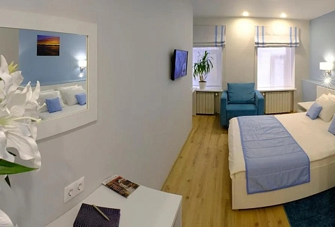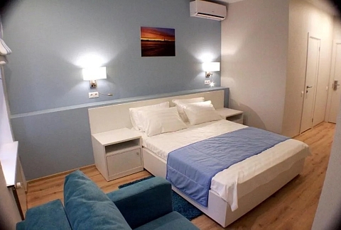 В номере: вешалка, зеркало, кресло, кровать двуспальная, стол, стул, шкаф, кондиционер, мини-холодильник, сейф, телевизор
