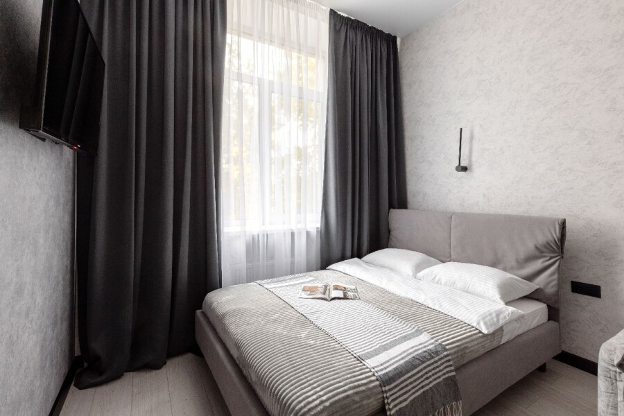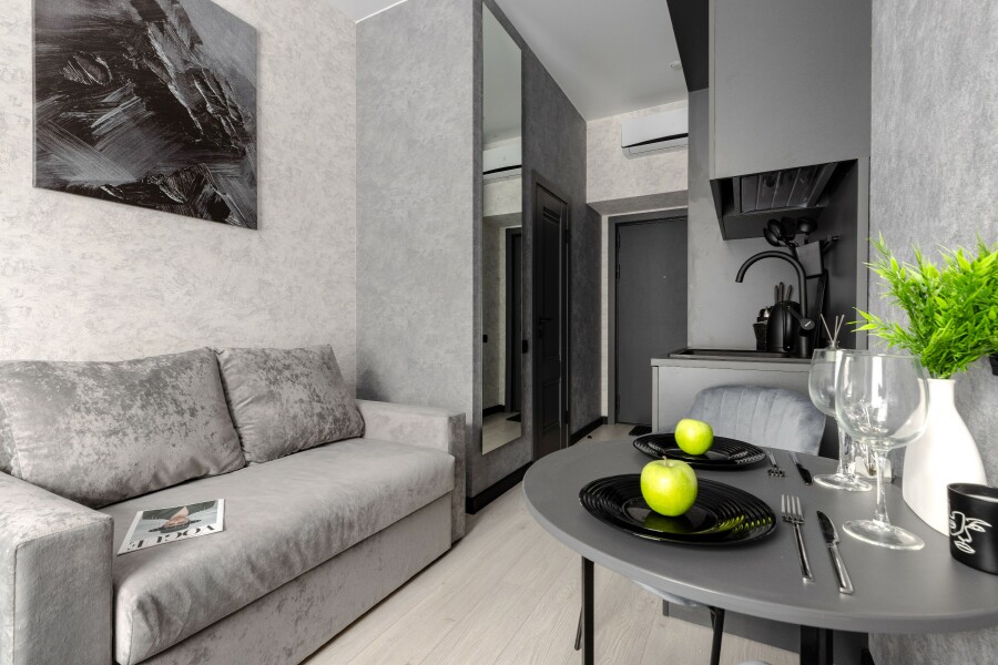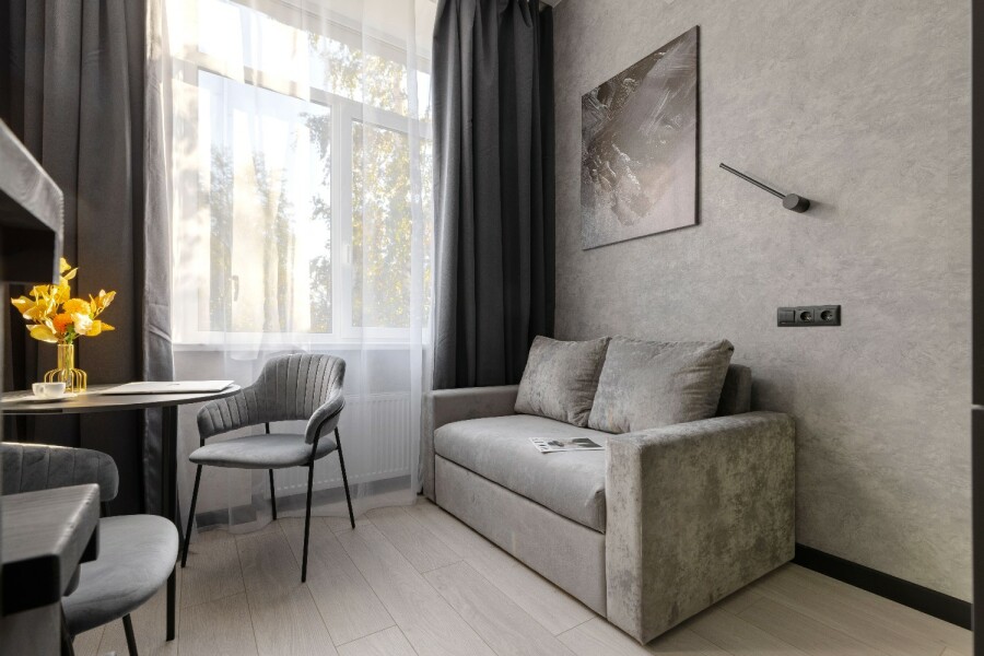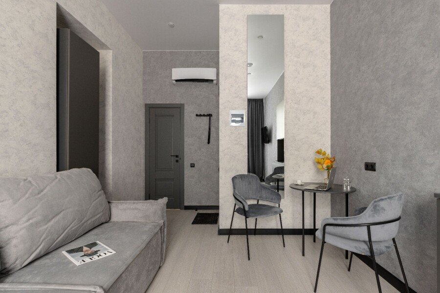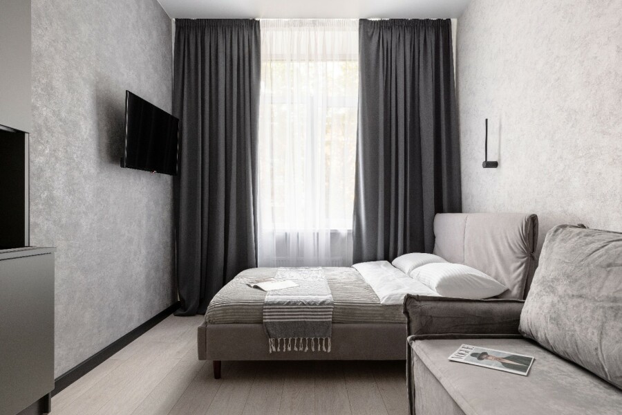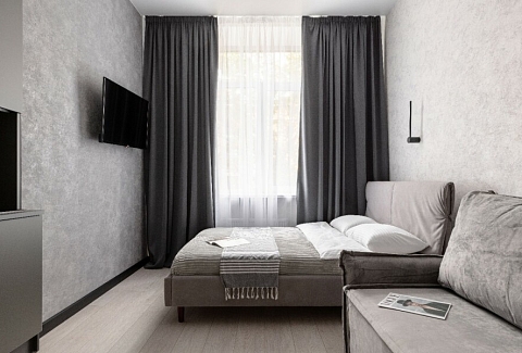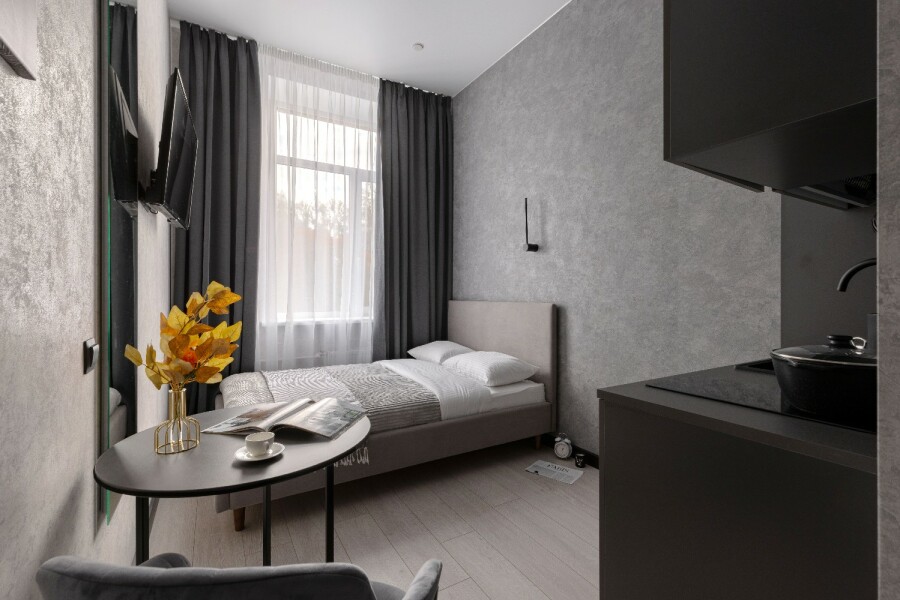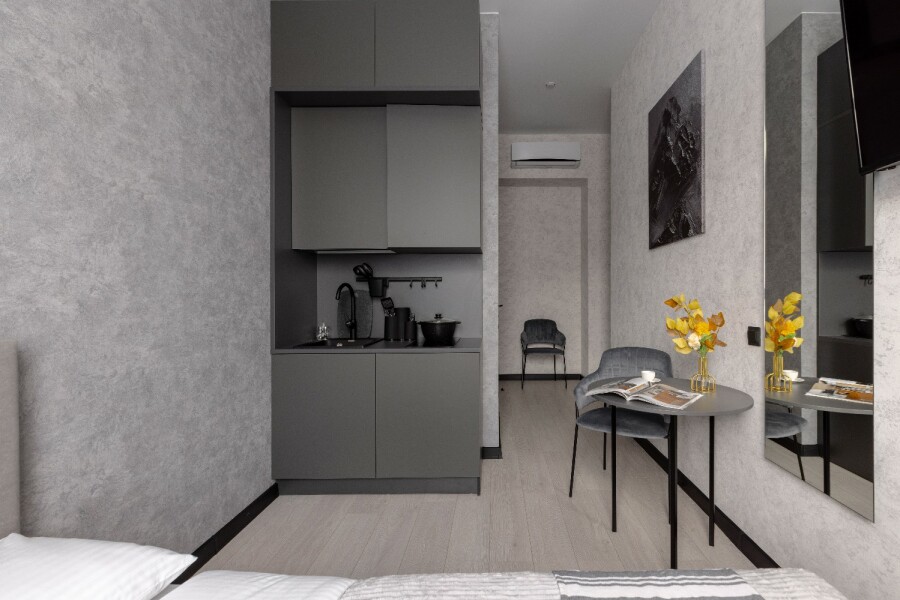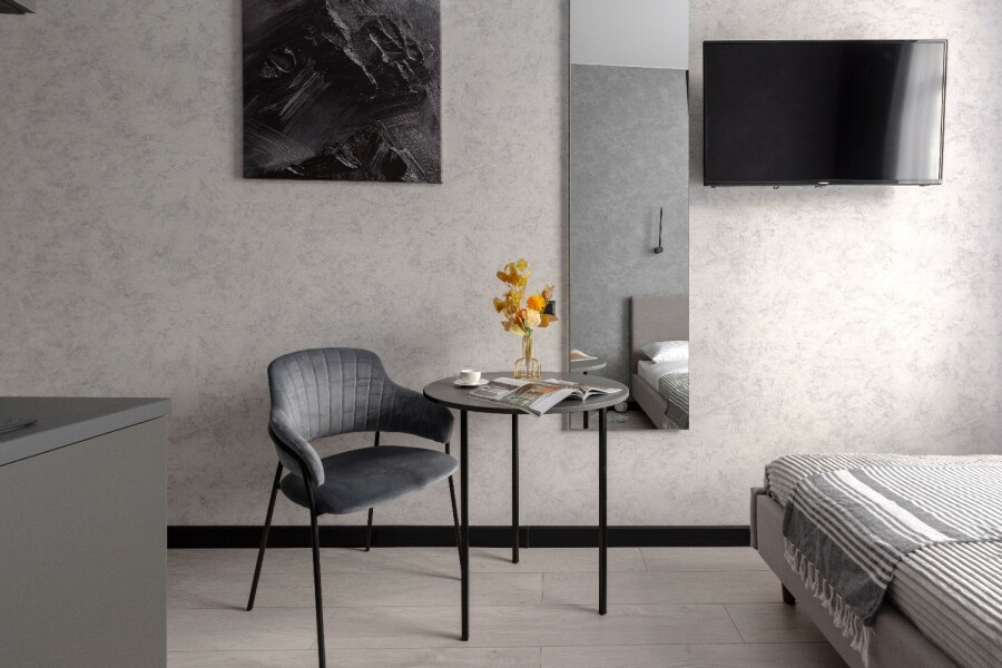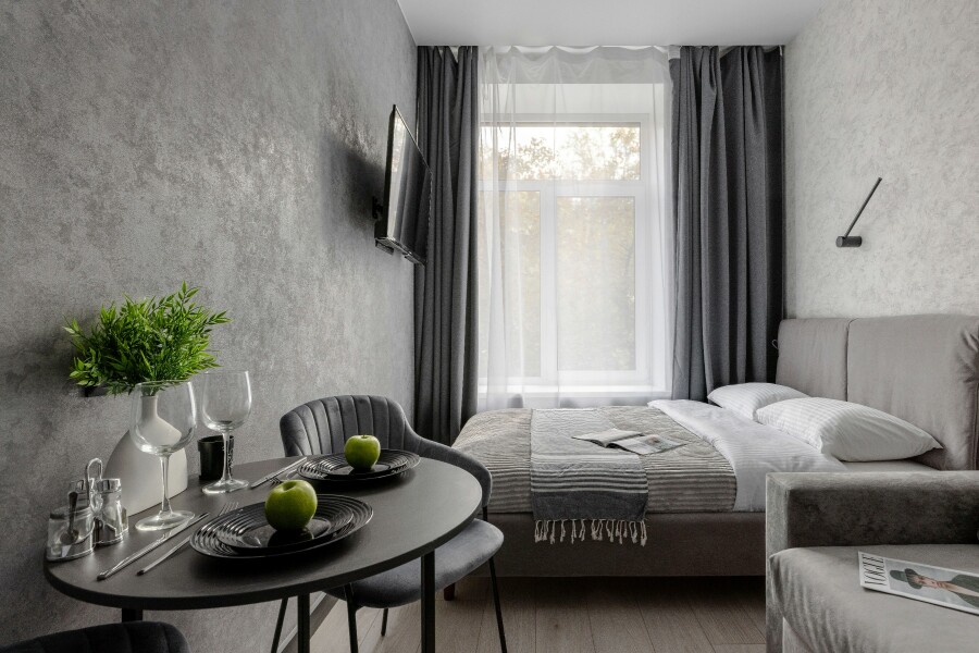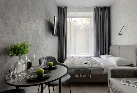 Номерной фонд включает стандартные, улучшенные и комфортные дизайнерские апартаменты, стильно оформленные в сдержанных серых тонах. Все категории располагают удобными спальными местами, компактным кухонным пространством со всем необходимым для готовки, ванной комнатой с душевой и стиральной машиной. Возможно подключение к Wi-Fi.