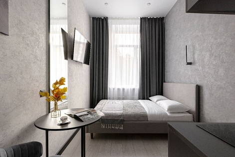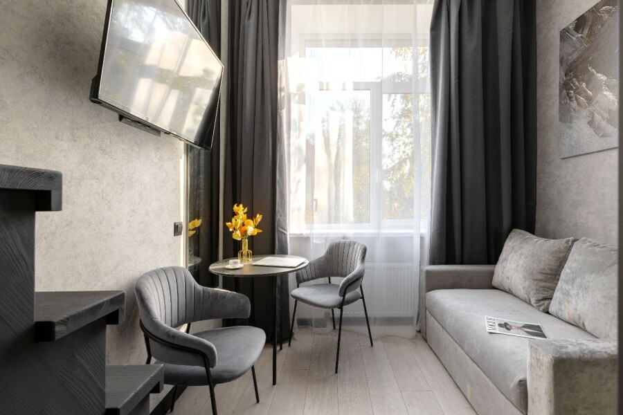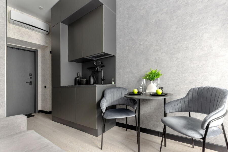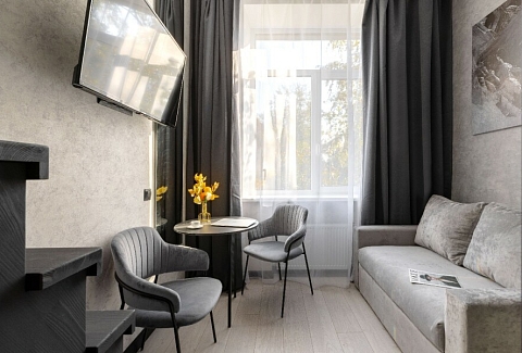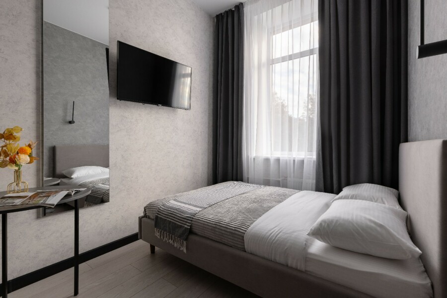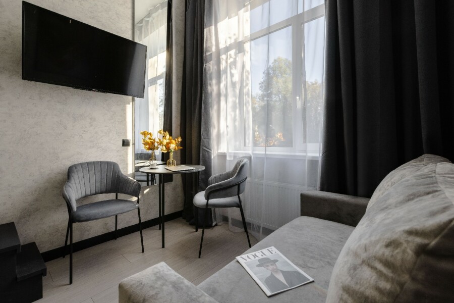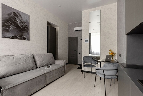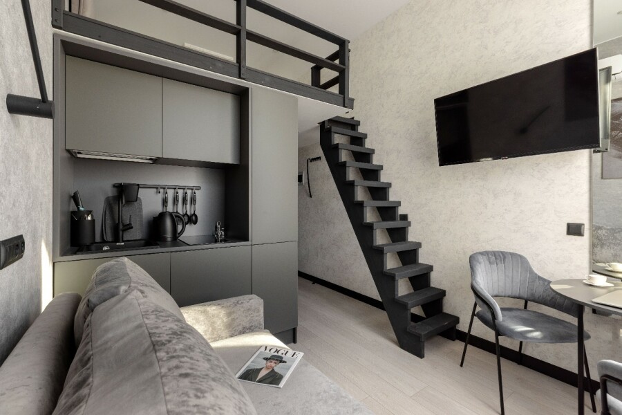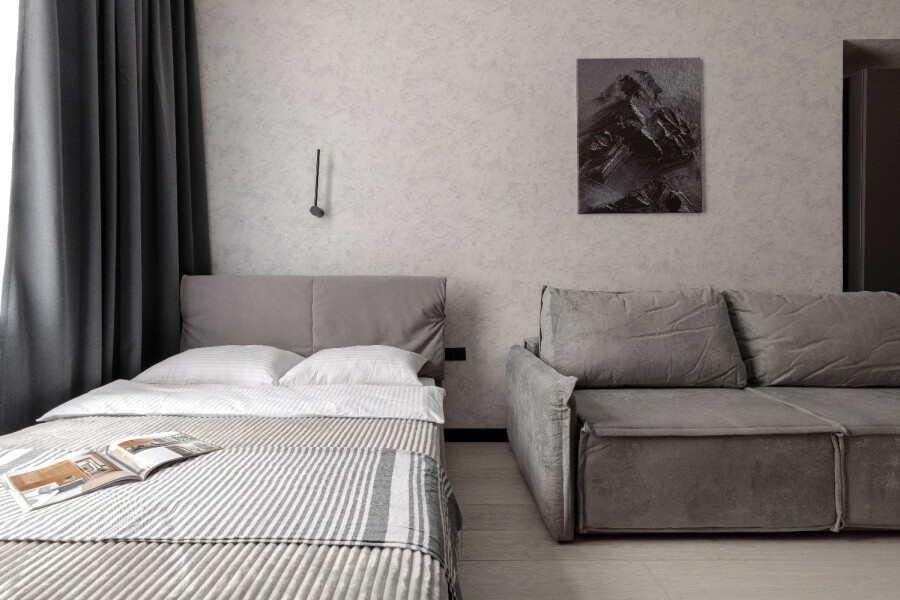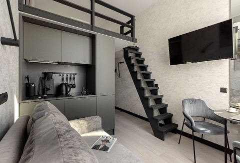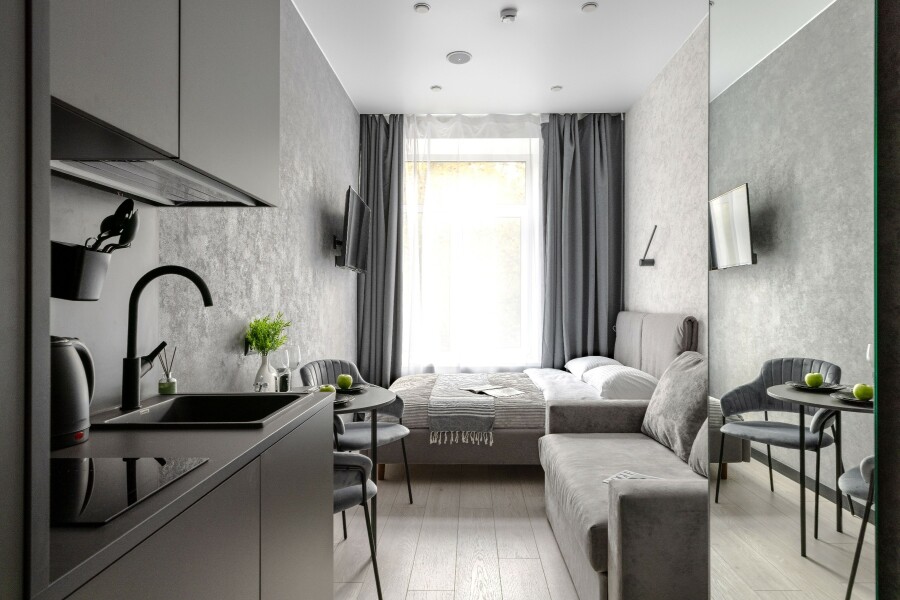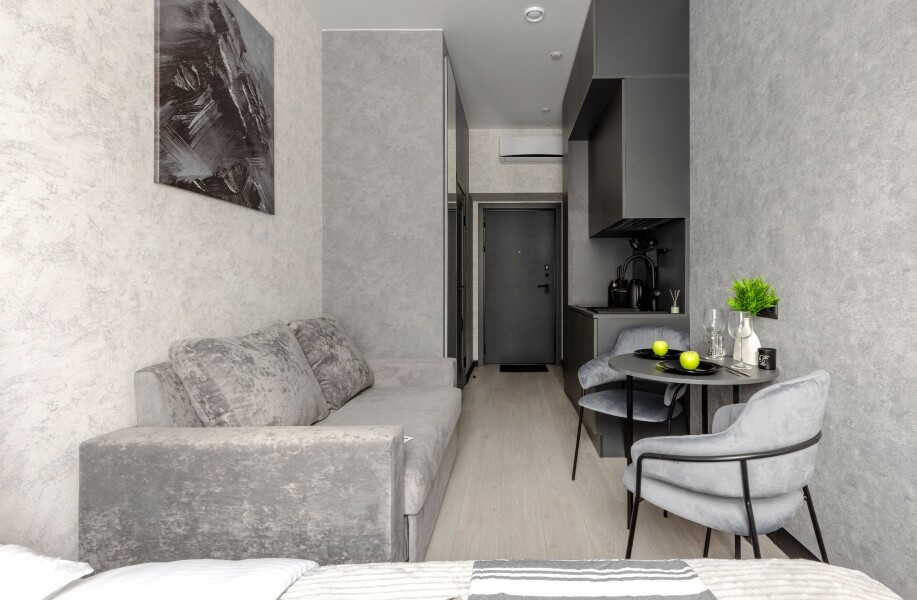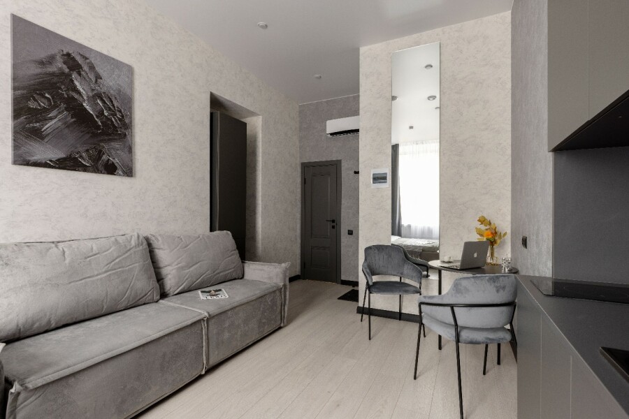 Номерной фонд включает стандартные, улучшенные и комфортные дизайнерские апартаменты, стильно оформленные в сдержанных серых тонах. Все категории располагают удобными спальными местами, компактным кухонным пространством со всем необходимым для готовки, ванной комнатой с душевой и стиральной машиной. Возможно подключение к Wi-Fi.