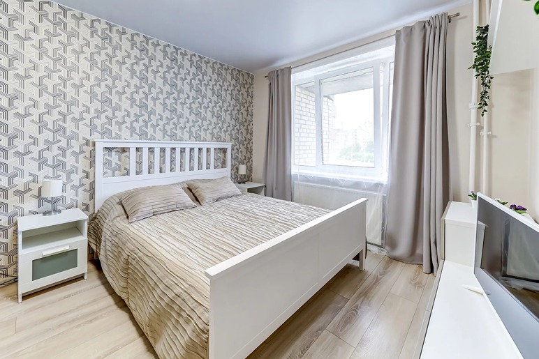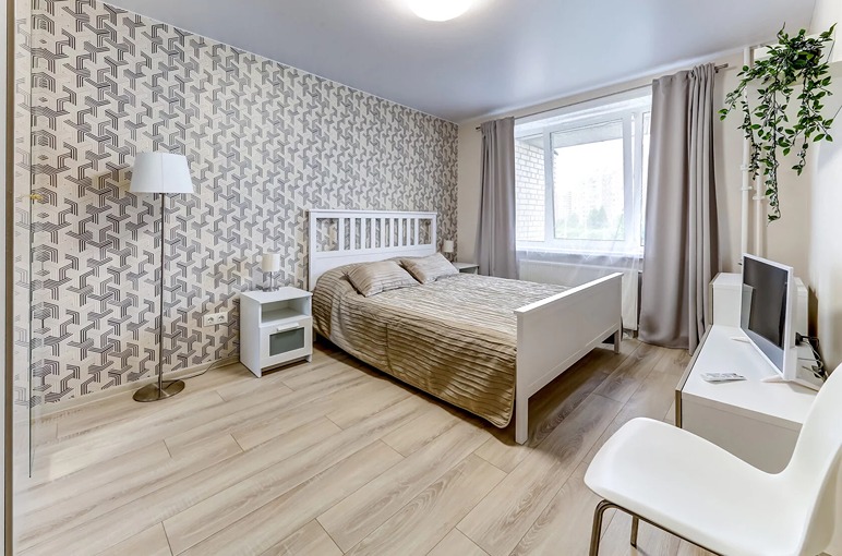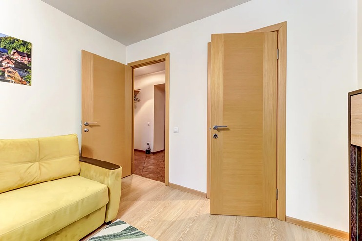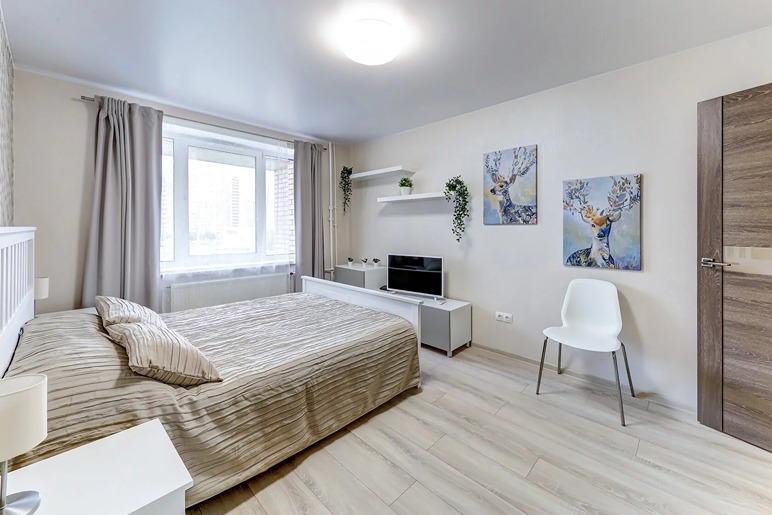 В номере: вешалка, гардеробная, диван раскладной, зеркало, кровать двуспальная, стол, стулья, гладильная доска, духовой шкаф, микроволновая печь, набор посуды, плита электрическая, посудомоечная машина, стиральная машина, телевизор, утюг, холодильник, электрочайник