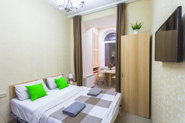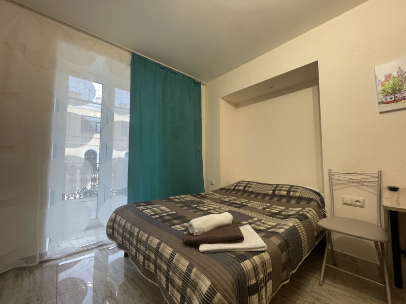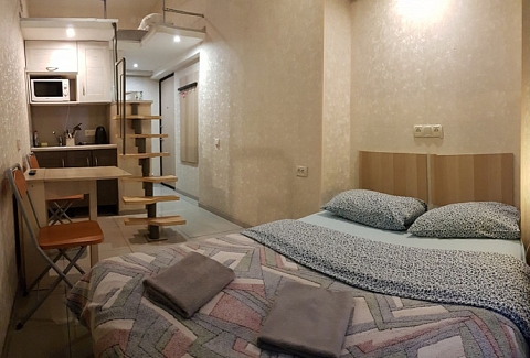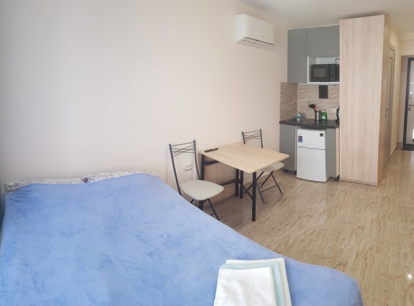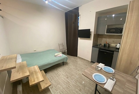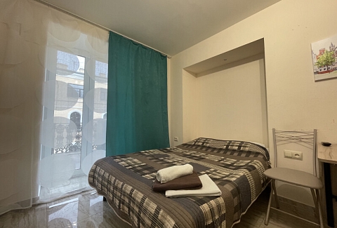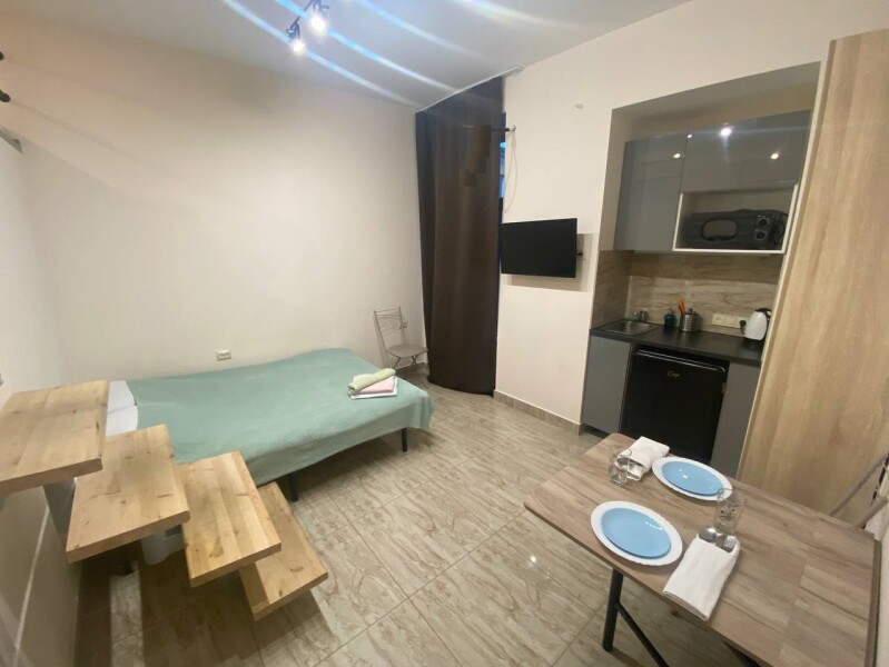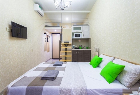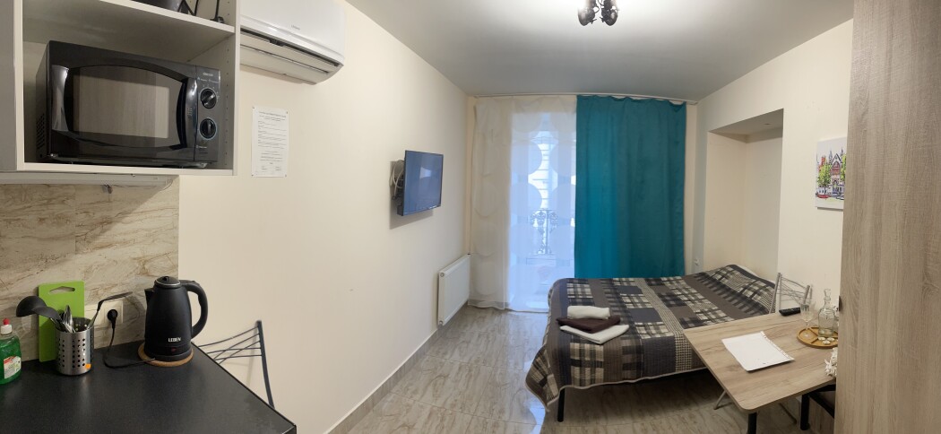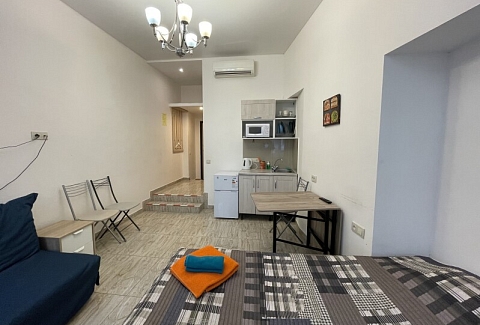 В номере: вешалка, диван раскладной, зеркало, кровать двуспальная, стол, стулья, шкаф, микроволновая печь, мини-холодильник, набор посуды, плита электрическая, стиральная машина, телевизор, электрочайник