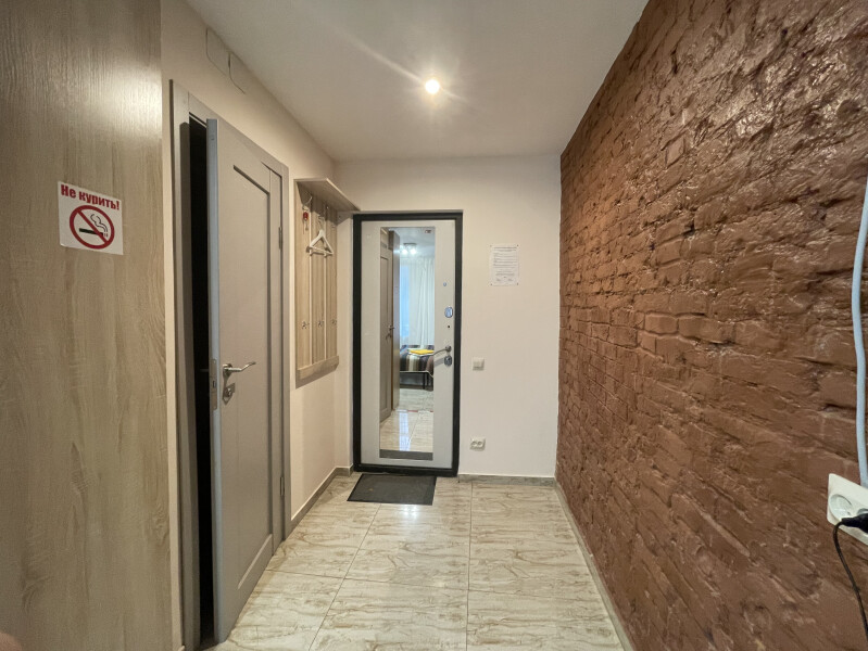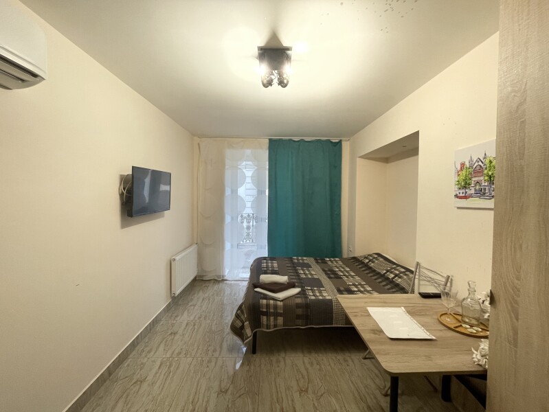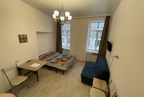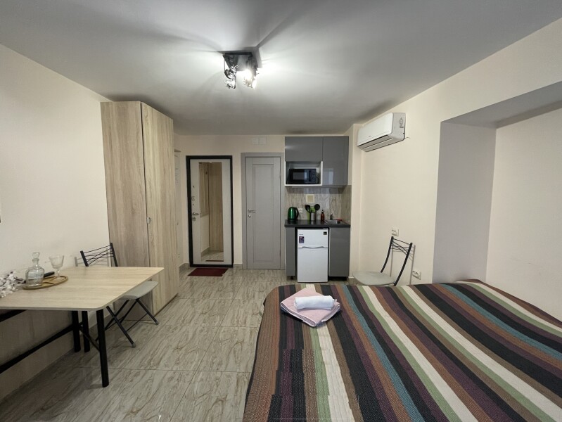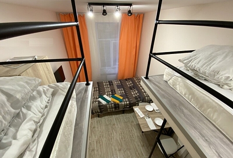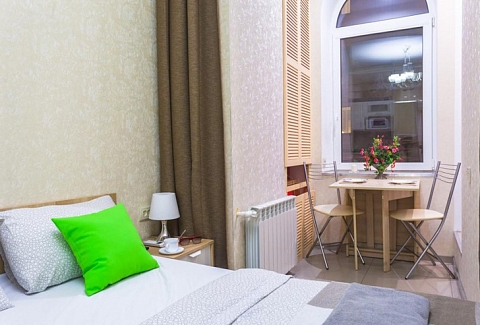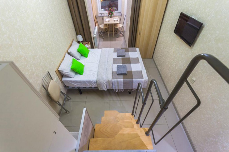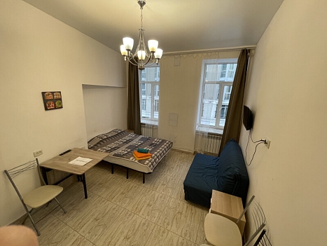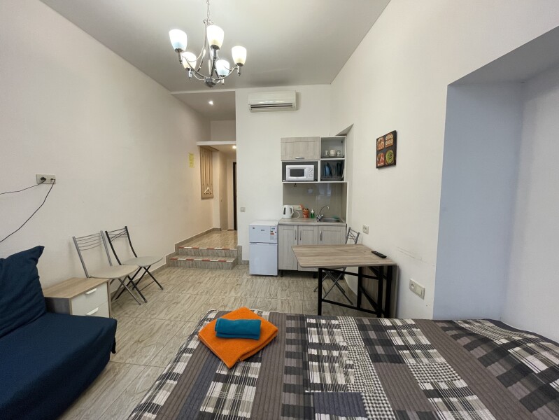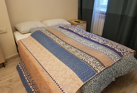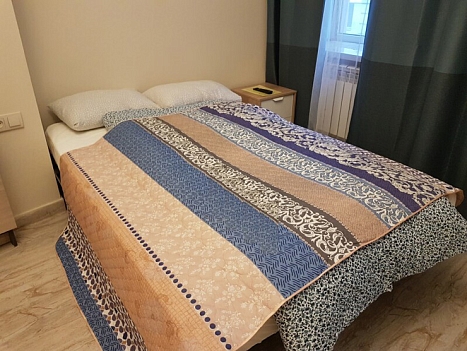 В номере: вешалка, диван раскладной, зеркало, кровать двуспальная, стол, стулья, шкаф, микроволновая печь, мини-холодильник, набор посуды, плита электрическая, стиральная машина, телевизор, электрочайник