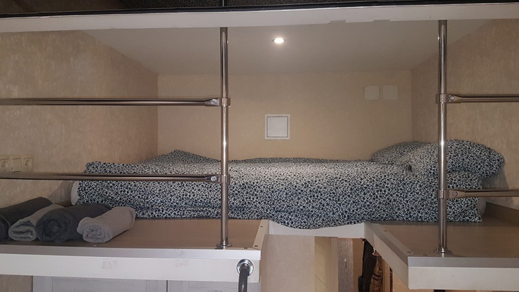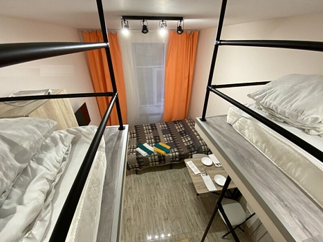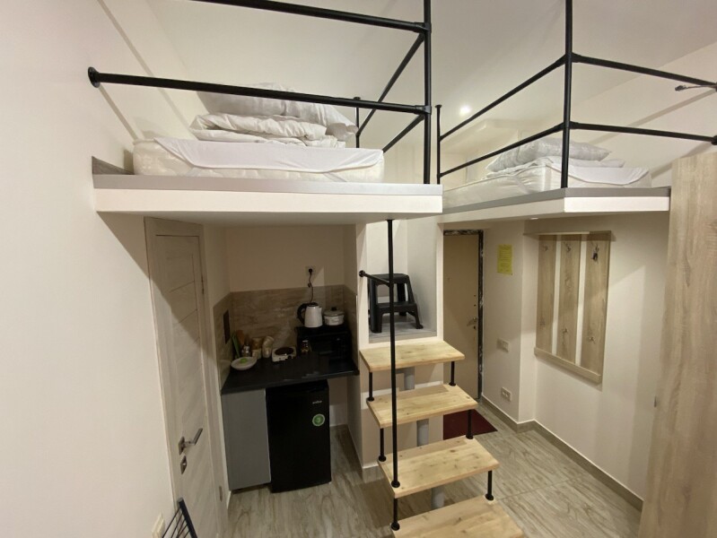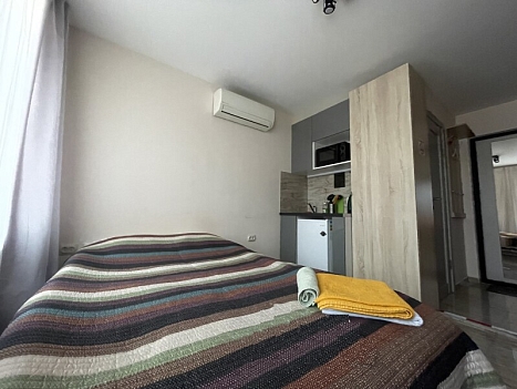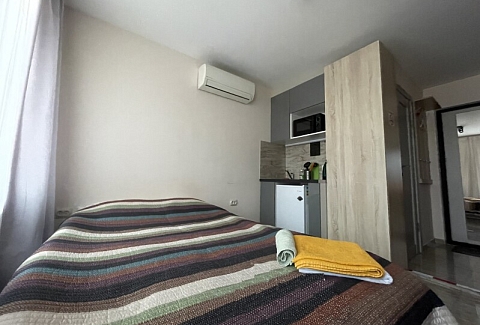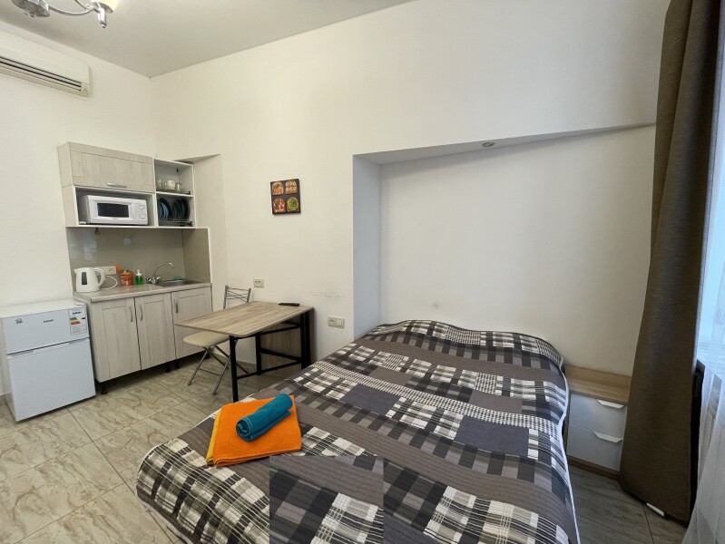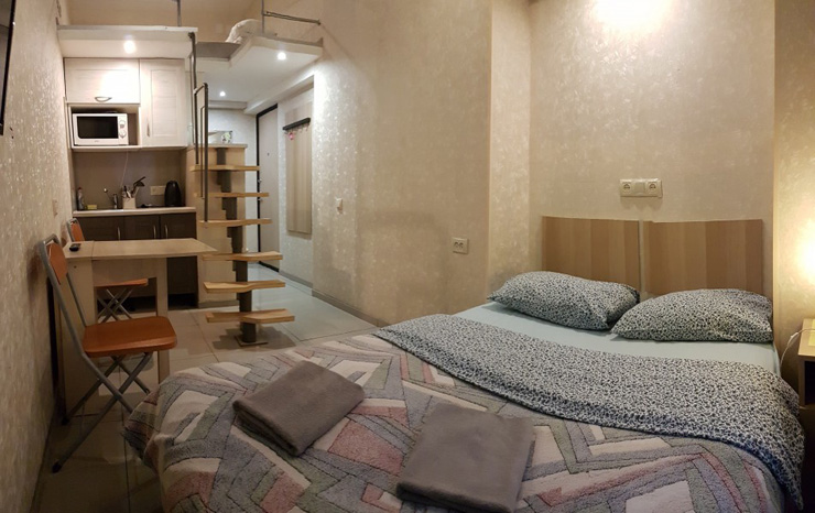В номере: вешалка, зеркало, кровать двуспальная, матрас, стол, стулья, шкаф, кондиционер, микроволновая печь, мини-холодильник, набор посуды, плита электрическая, стиральная машина, телевизор, электрочайник