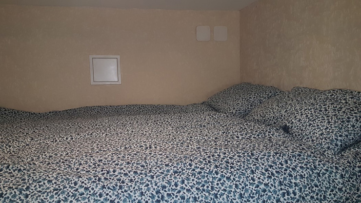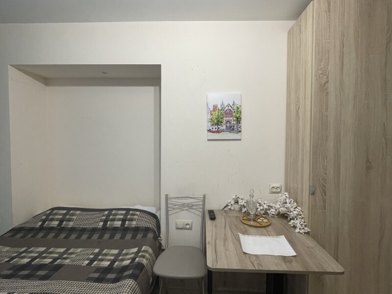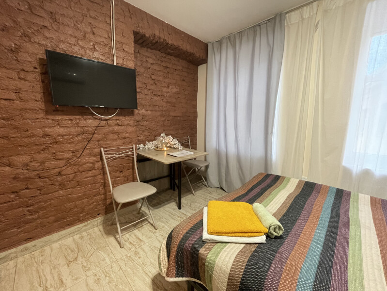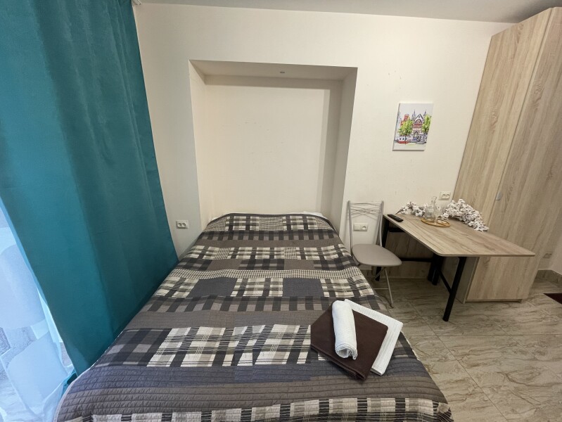 В номере: вешалка, зеркало, кровать двуспальная, матрас, стол, стулья, шкаф, микроволновая печь, мини-холодильник, набор посуды, плита электрическая, стиральная машина, телевизор, электрочайник