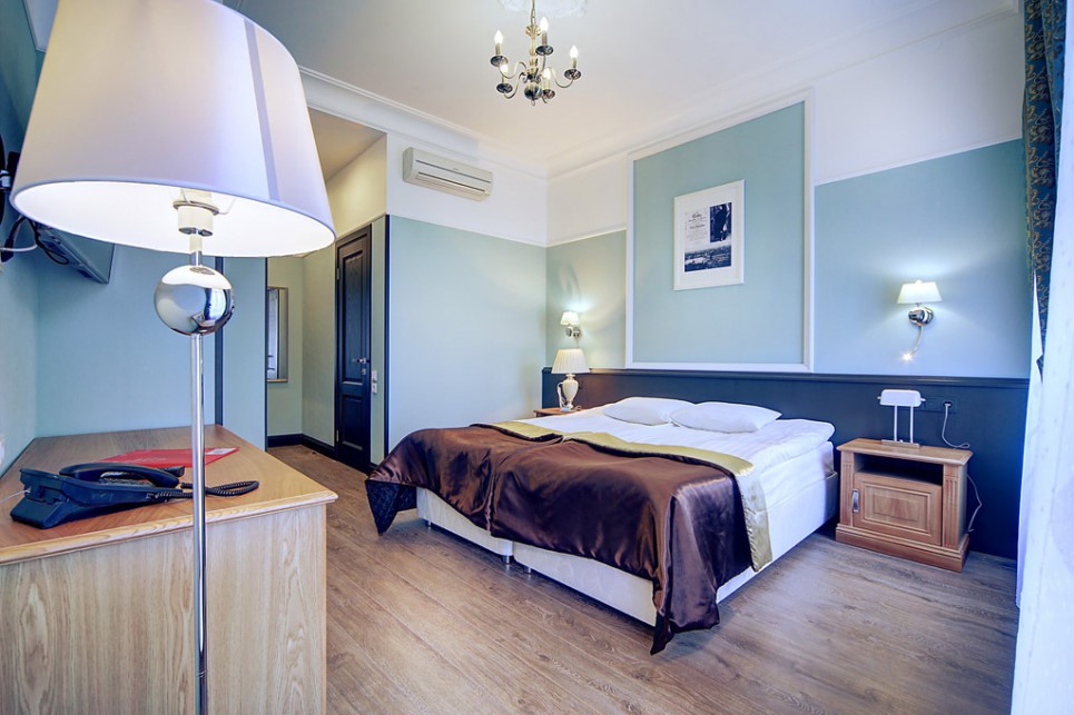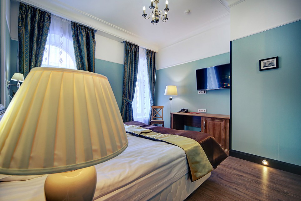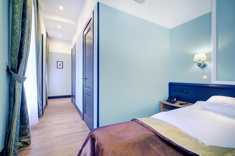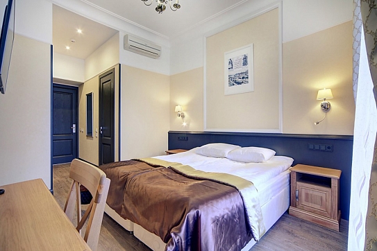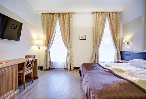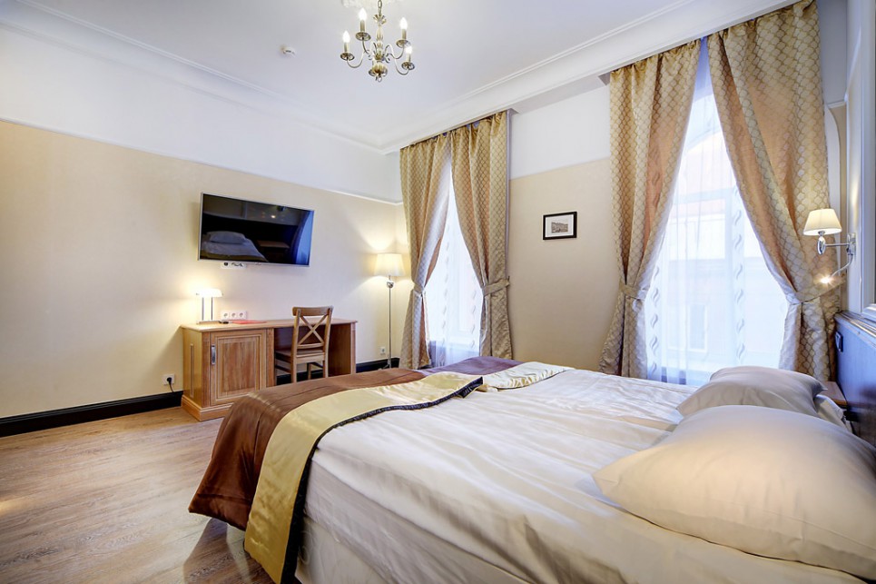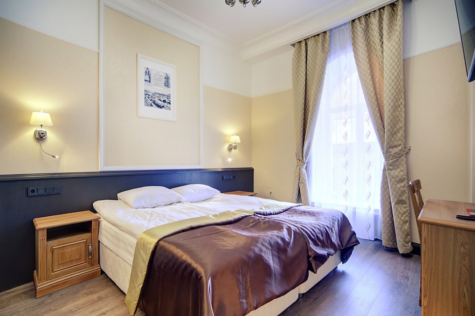 За полчаса неспешной ходьбы можно дойти до Эрмитажа, набережной Невы и Дворцовой площади.Отель занимает четвертый этаж пятиэтажного здания, оснащенного лифтом. Небольшой жилой фонд отеля включает в себя 8 комфортабельных номеров, все они отвечает международным стандартам. В просторных комнатах светлый приятный интерьер, выдержанный в классическом стиле, везде имеется индивидуальный санузел с душем, косметические принадлежности, кондиционер, плазменный телевизор.На пятом этаже работает столовая, там гости могут заказать завтраки или самостоятельно разогреть ужин в микроволновке. Также всем отдыхающим доступны услуги прачечной и беспроводной интернет.