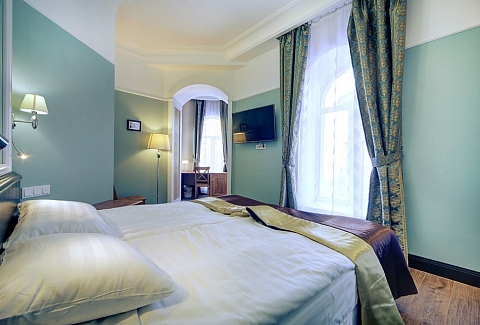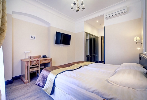 В номере: зеркало, кровати односпальные /одна двуспальная кровать, прикроватные тумбочки, стол, стулья, тумба под холодильник, шкаф, кондиционер, мини-холодильник, сейф, телевизор, телефон