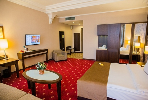 В номере: диван раскладной, зеркало, кресло, кровать двуспальная, прикроватные тумбочки, стол, стул, шкаф, гладильная доска, кондиционер, мини-холодильник, сейф, телевизор, телефон, утюг, чайная станция, чайный набор посуды