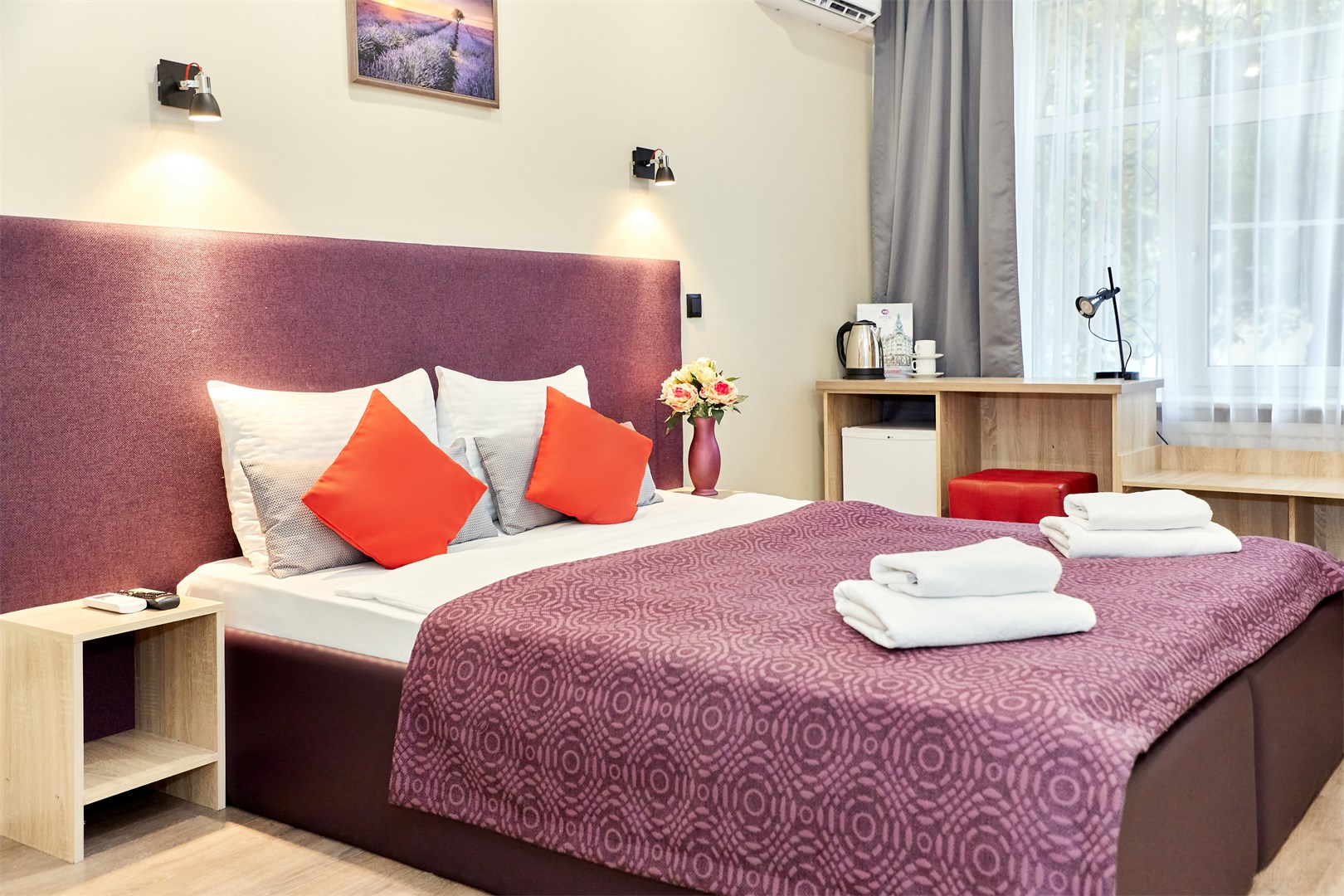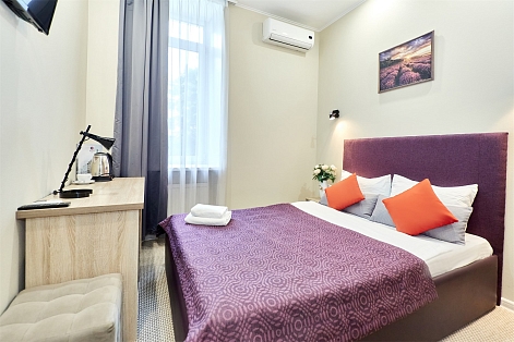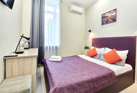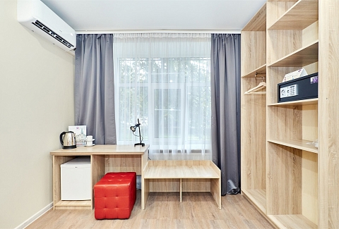 В номере: кровать полутороспальная, прикроватная тумбочка, стол, стул, шкаф, кондиционер, мини-холодильник, сейф, телевизор
