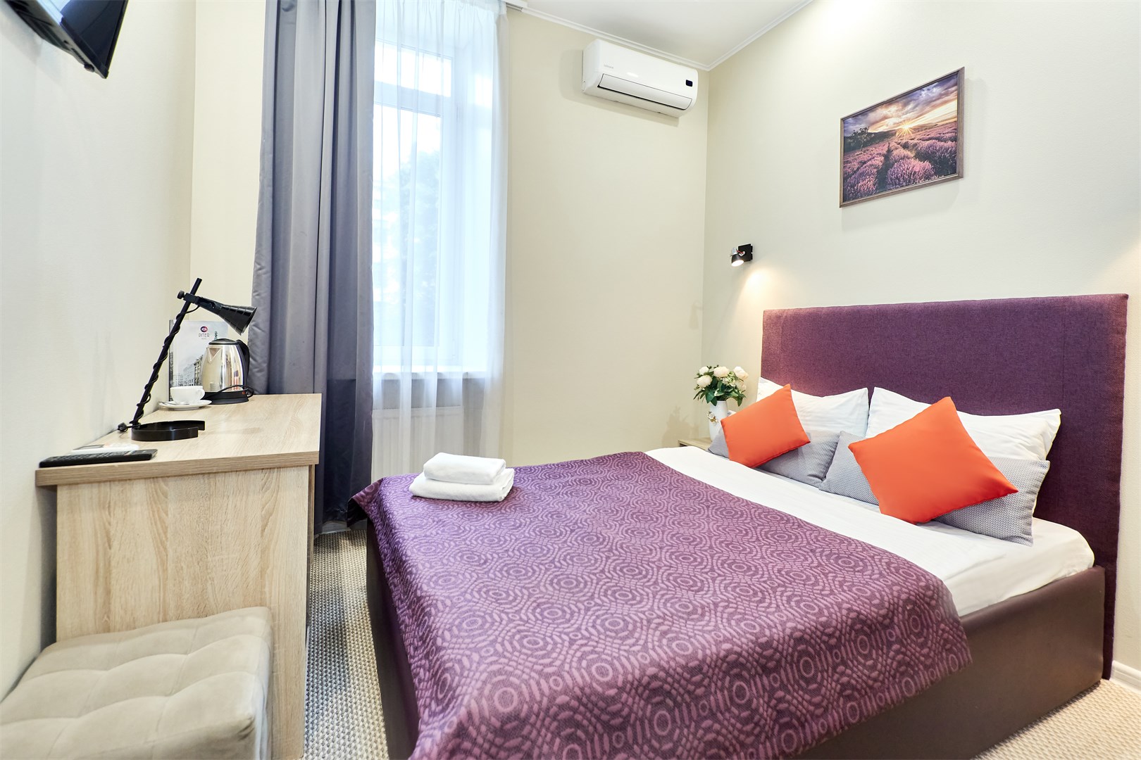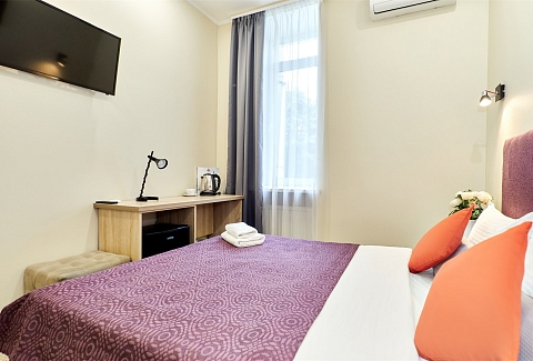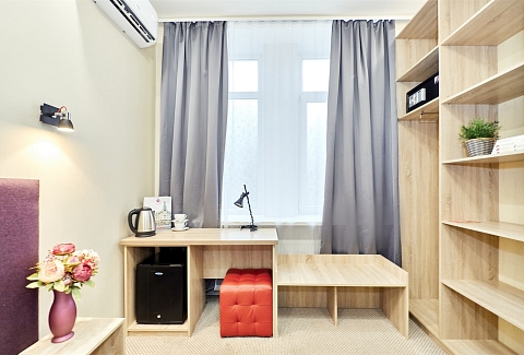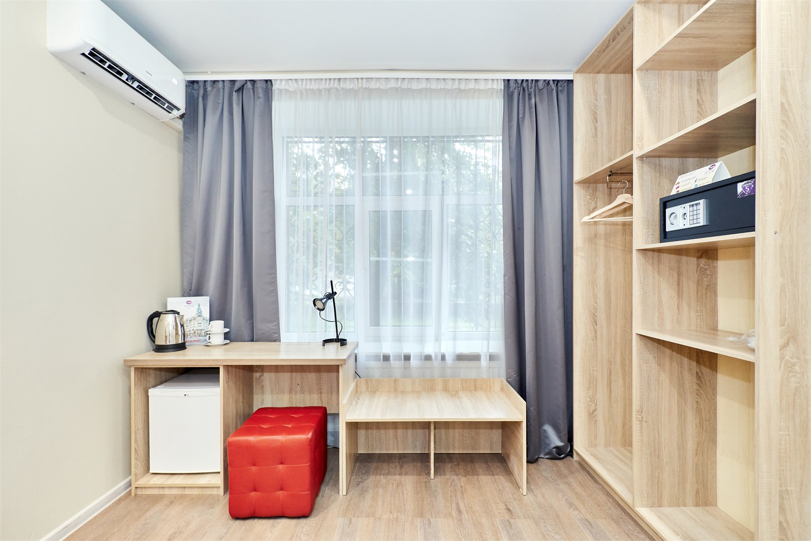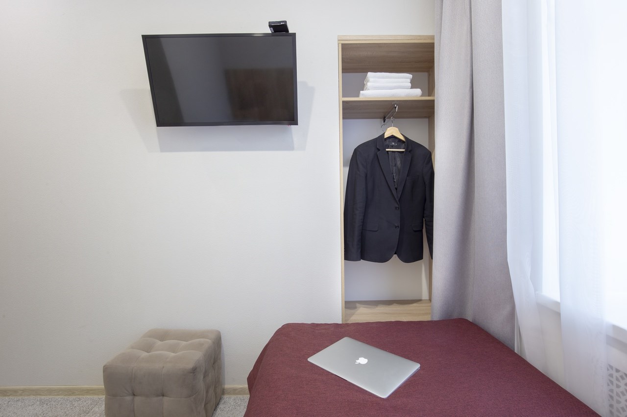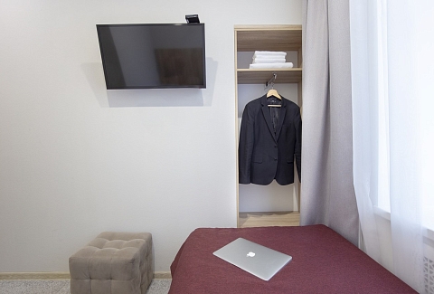 В номере: кровать односпальная, прикроватная тумбочка, стол, стул, шкаф, кондиционер, мини-холодильник, сейф, телевизор