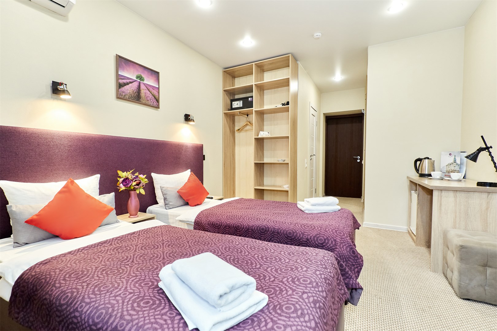В номере: зеркало, кровати односпальные /одна двуспальная кровать, прикроватные тумбочки, стол, стулья, шкаф, кондиционер, мини-холодильник, сейф, телевизор