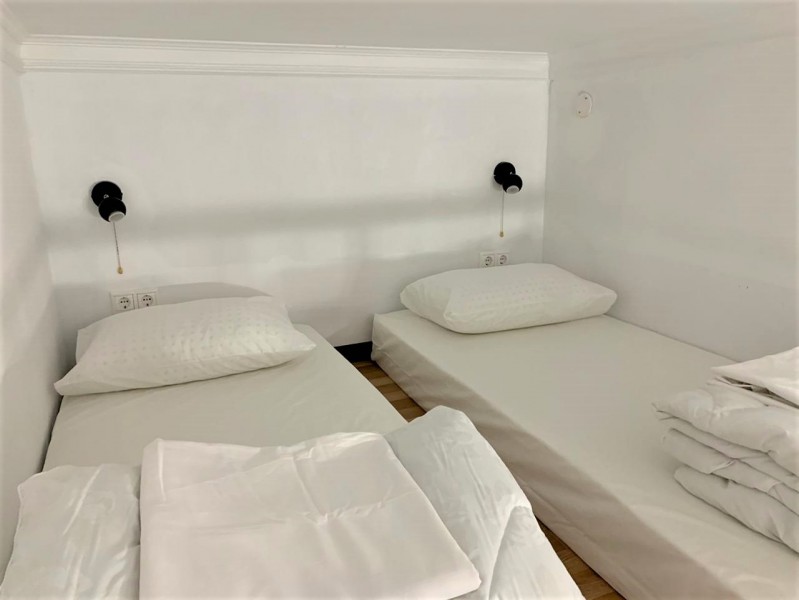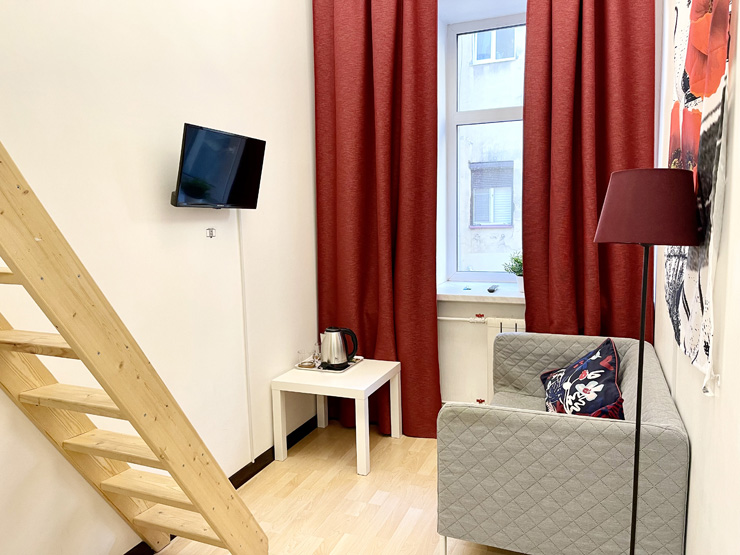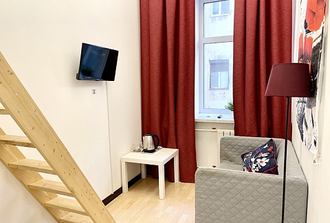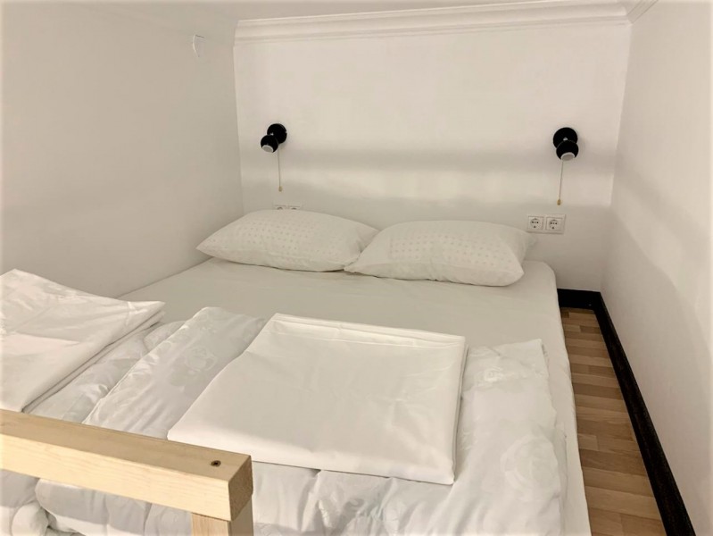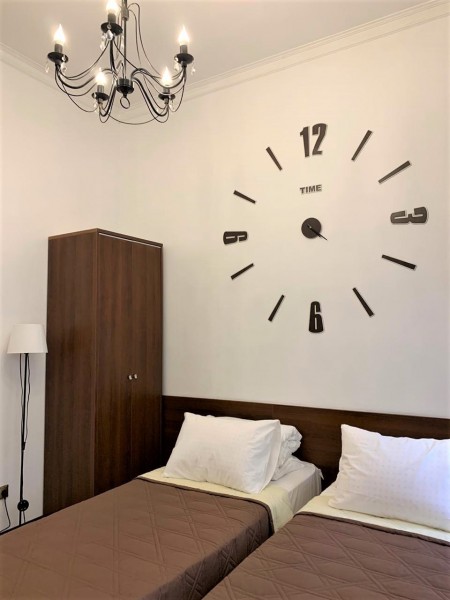 В номере: вешалка, диван раскладной, кровать двуспальная, стол, стулья, микроволновая печь, мини-холодильник, набор посуды, телефон, электрочайник
