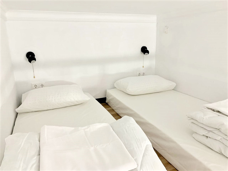 В номере: вешалка, кровати односпальные, кровать односпальная, шкаф, телевизор, чайный набор посуды, электрочайник