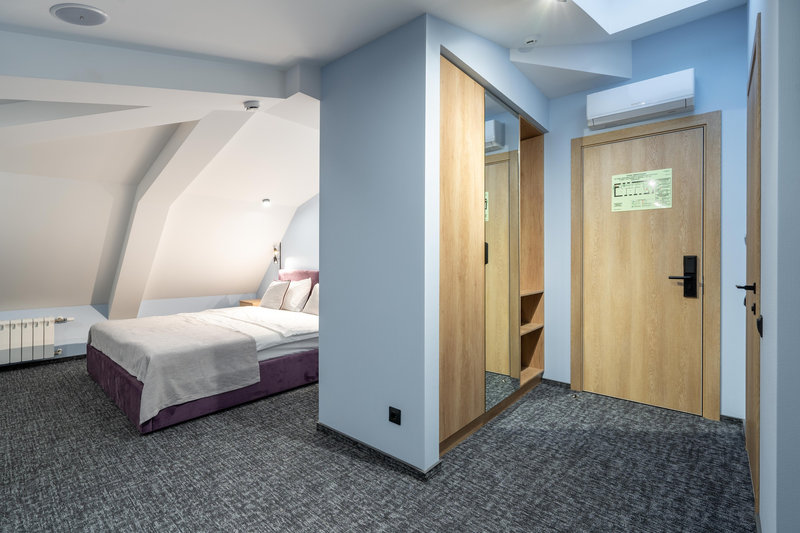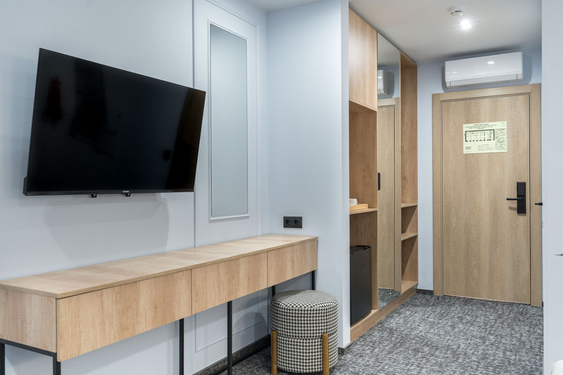 В номере: вешалка, зеркало, кровать двуспальная, прикроватные тумбочки, стол, стулья, шкаф, кондиционер, мини-холодильник, телевизор
