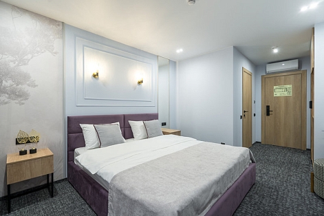 В номере: вешалка, зеркало, кровать двуспальная, прикроватные тумбочки, стол, стулья, шкаф, кондиционер, мини-холодильник, телевизор, чайник