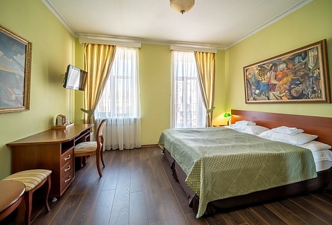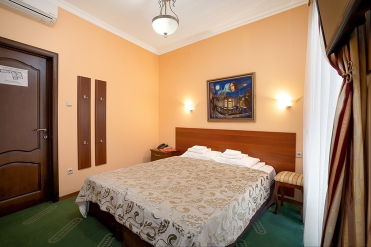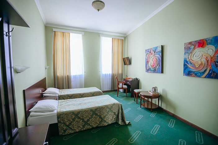 В номере: кровати односпальные /одна двуспальная кровать, стол, стулья, шкаф, кондиционер, мини-холодильник, сейф, телевизор, телефон, чайный набор посуды, электрочайник