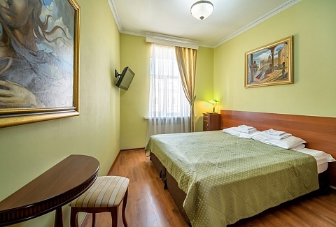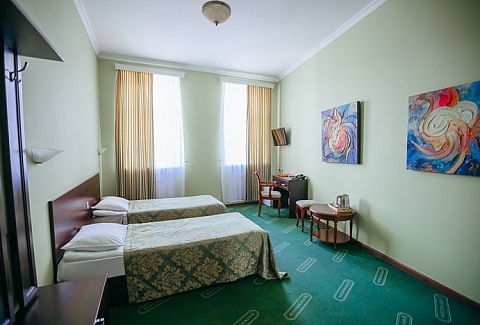 В номере: кровати односпальные /одна двуспальная кровать, стол, стул, шкаф, кондиционер, телевизор, телефон, чайный набор посуды, электрочайник