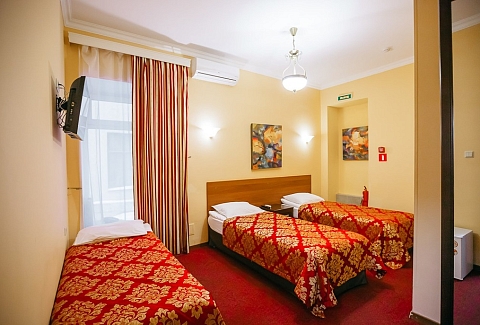 В номере: кровати односпальные /одна двуспальная кровать, кровать односпальная, стол, стул, шкаф, кондиционер, мини-холодильник, телевизор, телефон, чайный набор посуды, электрочайник