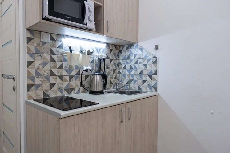 В номере: вешалка, диван раскладной, зеркало, матрас, стол, стулья, шкаф, микроволновая печь, мини-холодильник, набор посуды, плита электрическая, телевизор, электрочайник