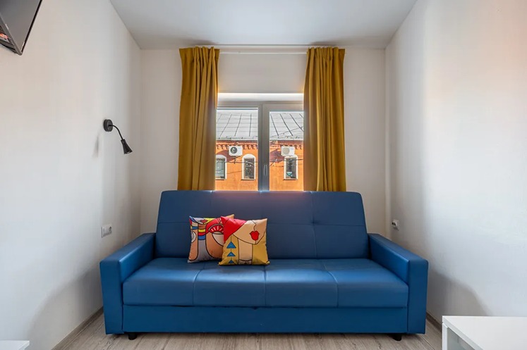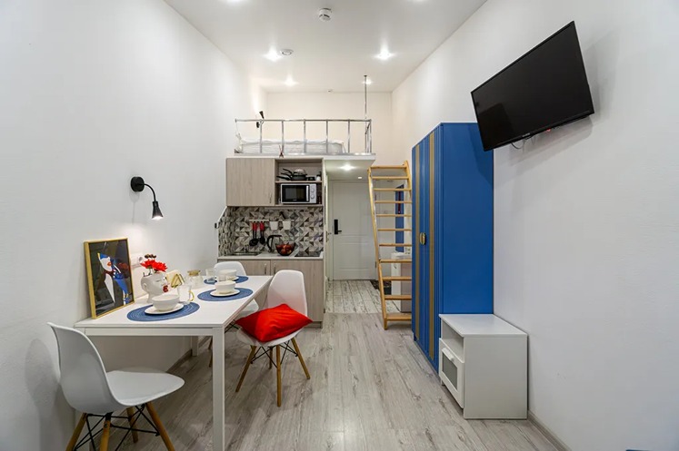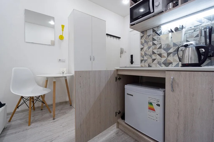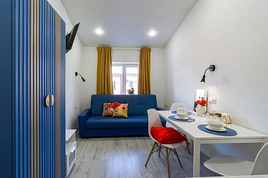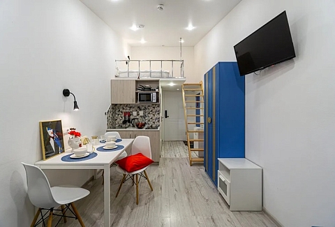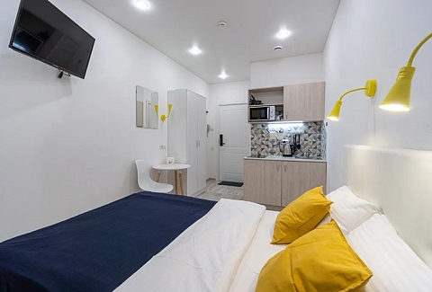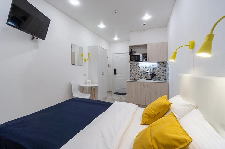 В соседних зданиях открыты многочисленные магазины и кафе.Номерной фонд включает 2 студии, оформленные в светлой цветовой гамме и дополненные яркими акцентными деталями. Одни апартаменты оснащены двуспальной кроватью, вторые — раскладным диваном и спальными местами на верхнем уровне. Оба варианта располагают мини-кухней, обеденной зоной, собственным санузлом. На этаже установлены гладильные принадлежности и стиральные машины. В номерах работает Wi-Fi.